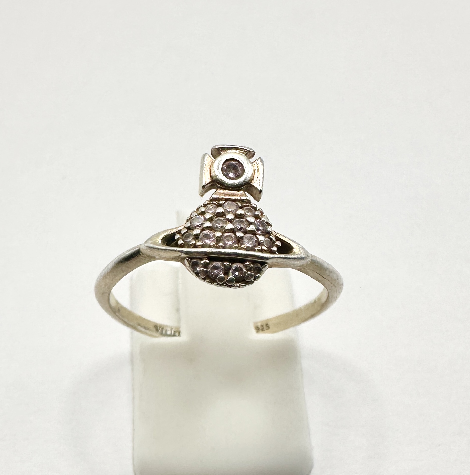 A Vivienne Westwood Tamia ring featuring the signature orb and cross motif. The piece is constructed from 925 silver and features a central orb pavé-set with numerous small, round-cut light pink stones. A single matching stone is set within the cross finial. The interior of the band bears a 925 hallmark for sterling silver alongside a partial maker’s mark.