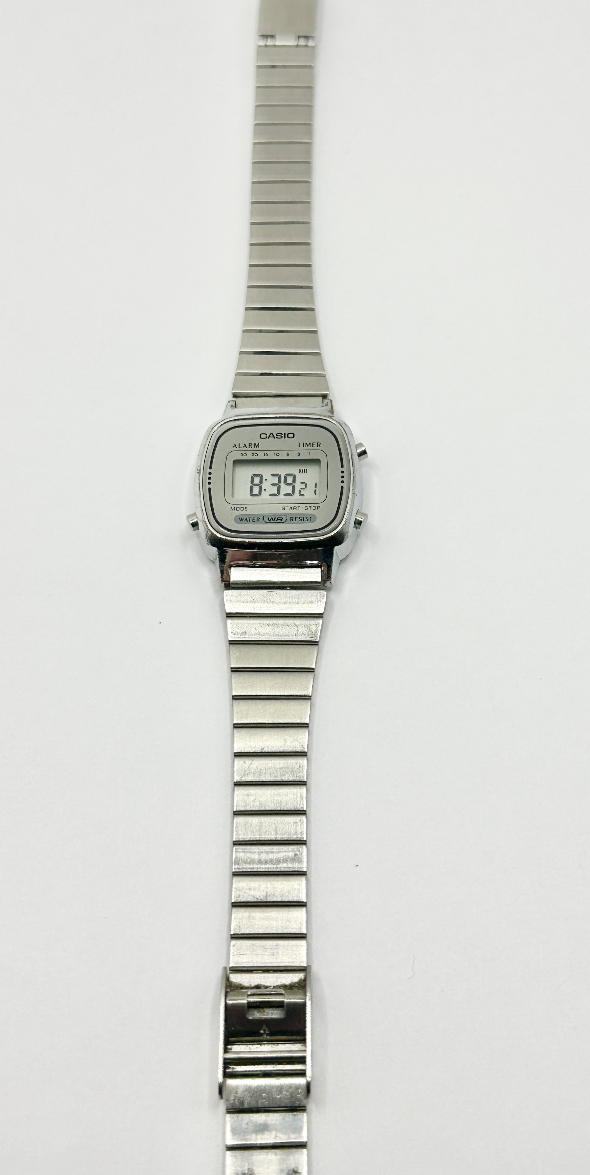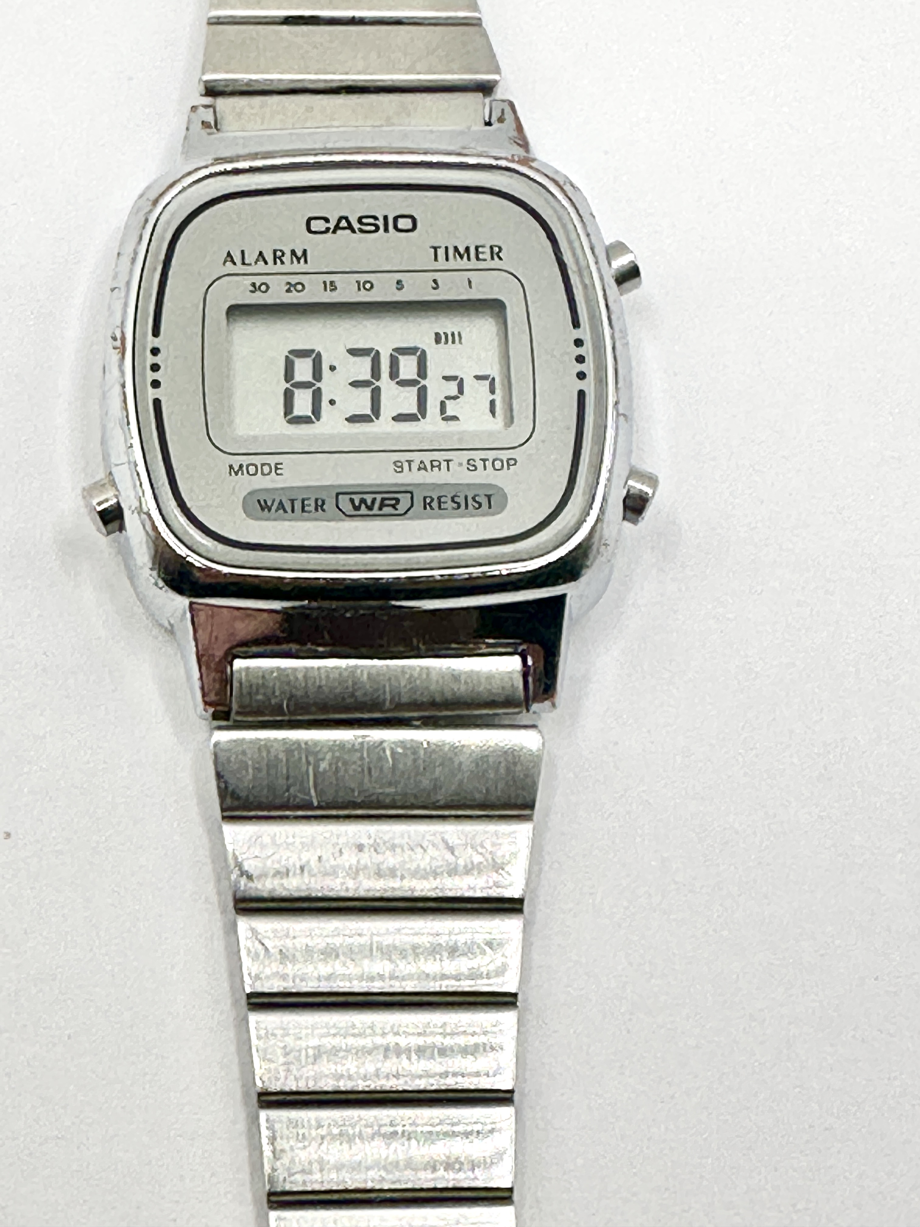 A Casio LA670W digital wristwatch constructed from 925 silver. The timepiece features a rectangular case with a light grey dial surround. The face is marked with the Casio brand name and includes indicators for alarm and timer functions, as well as Water WR Resist. Preset timer intervals of 30, 20, 15, 10, 5, 3, and 1 are positioned above the digital time display. The watch is equipped with an adjustable 925 silver link bracelet and three functional side push-buttons.