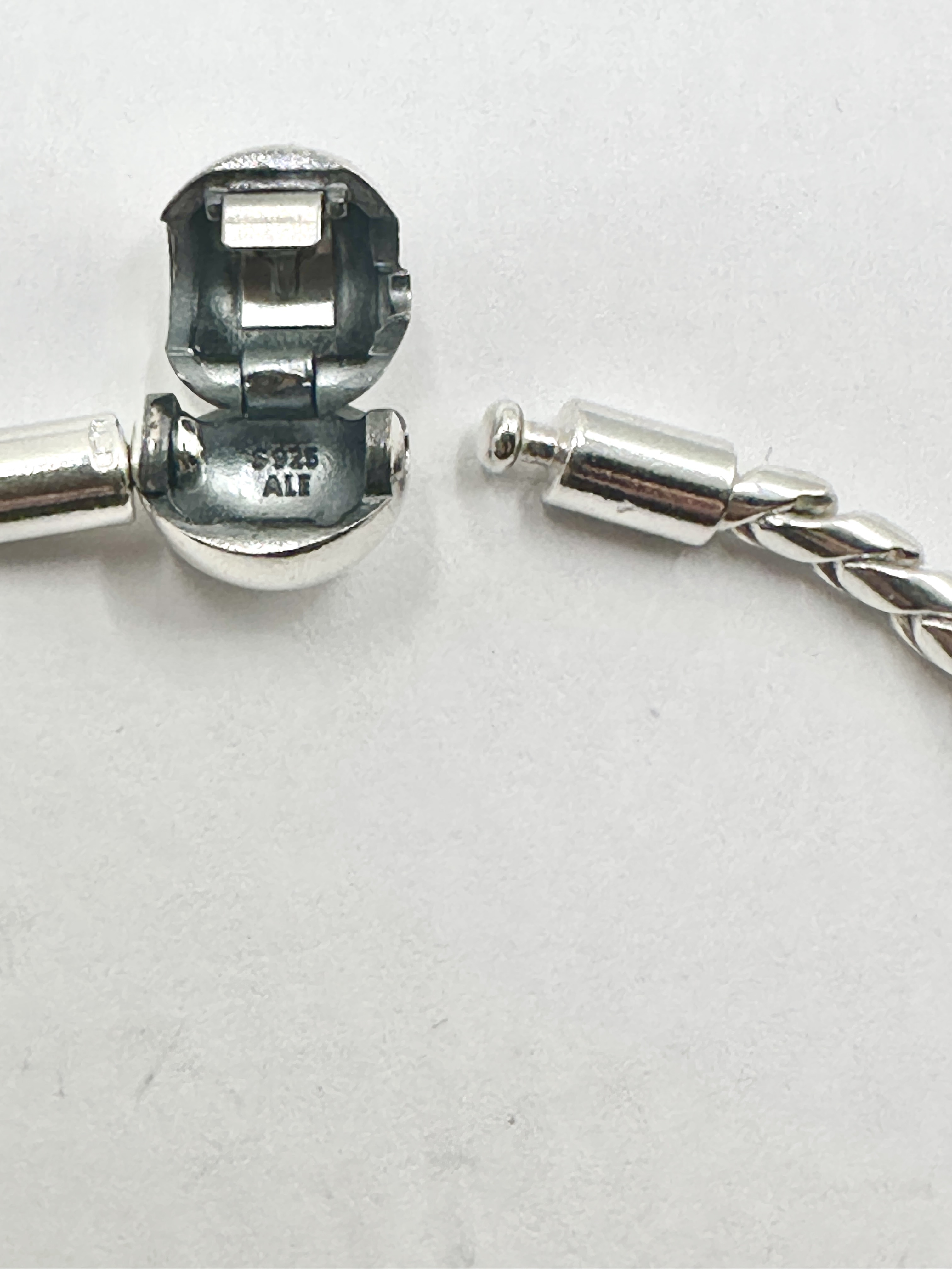 A Pandora Round Clasp Wing Chain bracelet manufactured from 925 silver. The piece features a thick braided or twisted link design. It is secured with a spherical barrel clasp engraved with the PANDORA brand name on the exterior. The interior of the clasp is marked with the hallmarks S925 ALE. The jewellery exhibits a high-polish finish.