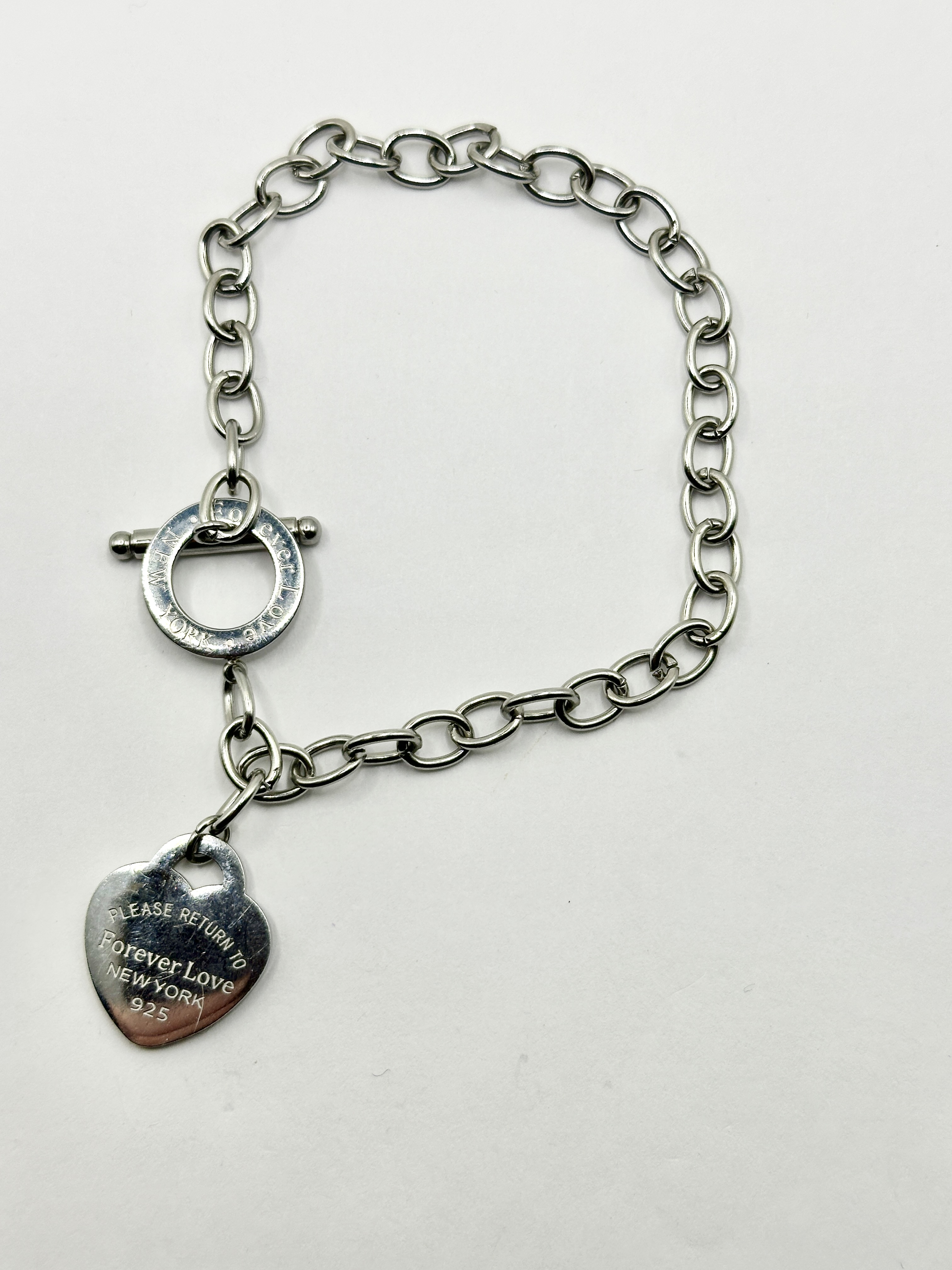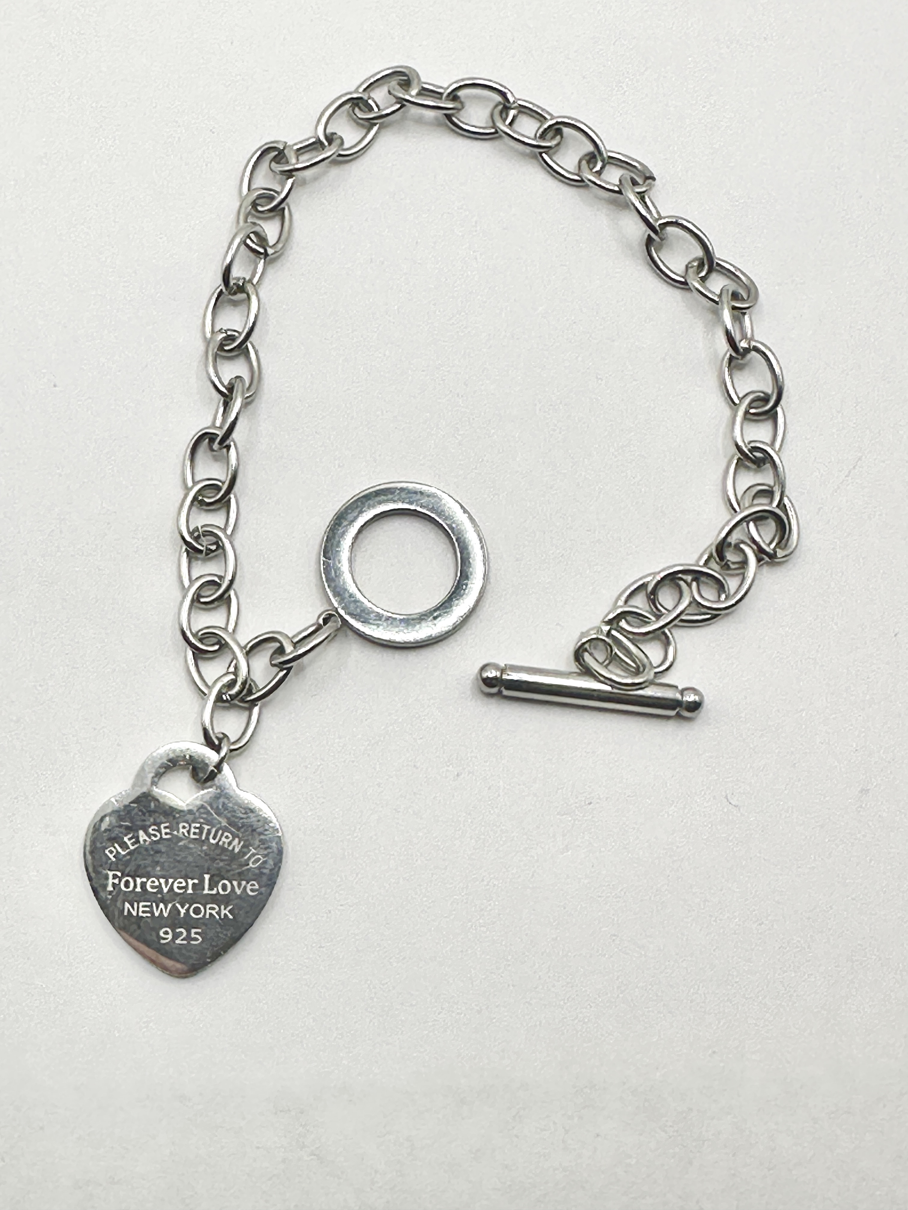 A 925 silver link bracelet featuring a heart-shaped pendant and a toggle clasp. The heart-shaped tag is engraved with the text PLEASE RETURN TO Forever Love NEW YORK 925. The circular toggle ring bears a corresponding inscription reading NEW YORK Forever Love 925. The bracelet is constructed from 925 silver.
