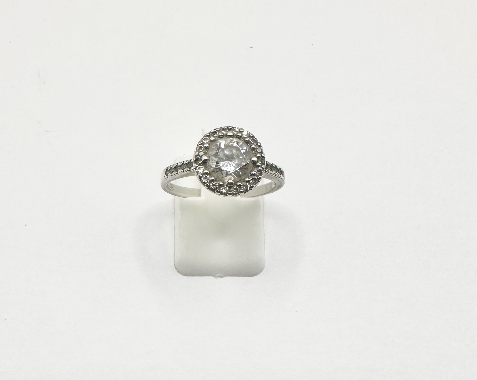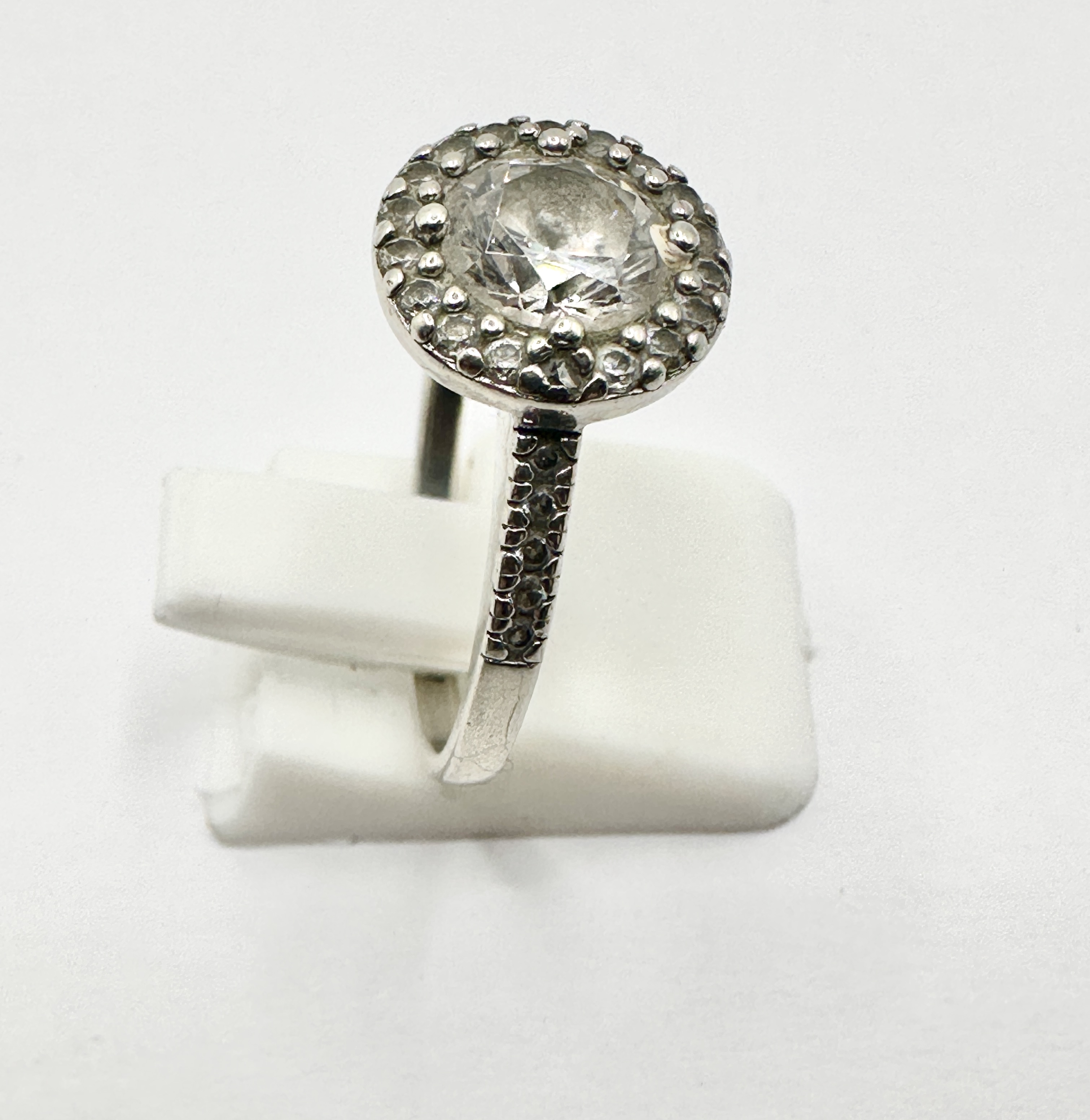 A 925 silver ring by Pandora featuring a central round brilliant-cut clear stone. The primary stone is encircled by a halo of smaller round clear stones with additional stone accents to the shoulders of the polished band. The setting includes a beaded border around the central cluster.