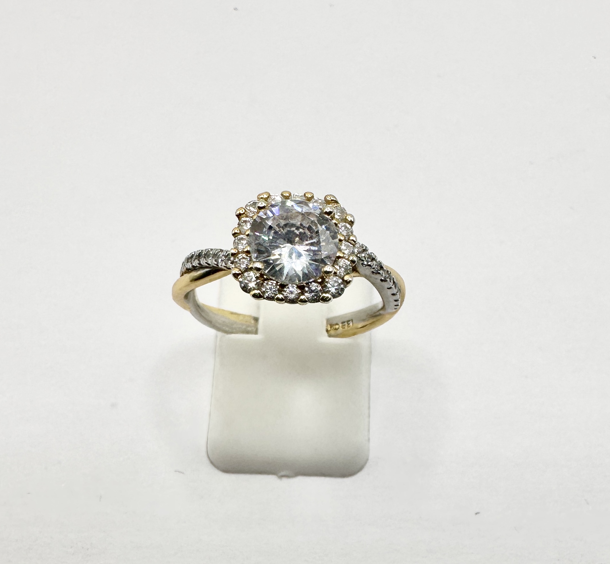 A 925 silver ring featuring a central round brilliant-cut cubic zirconia. The central stone is enclosed within a square halo of smaller faceted stones. The design incorporates a bypass-style band finished in bimetal tones of yellow and white metal, with pavé-set accents to the shoulders. Indistinct markings are visible to the interior shank.