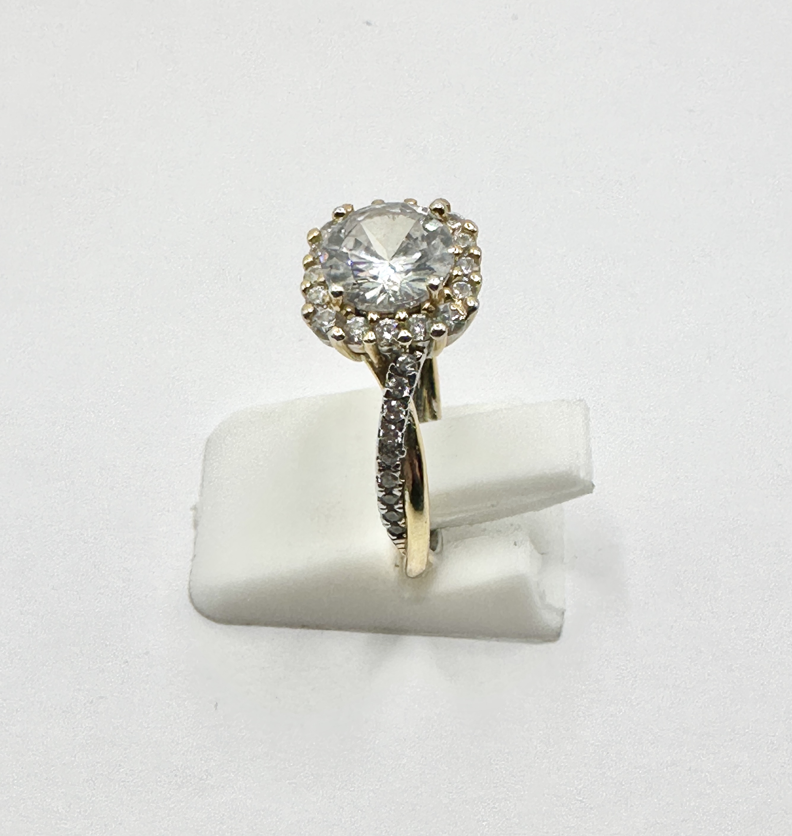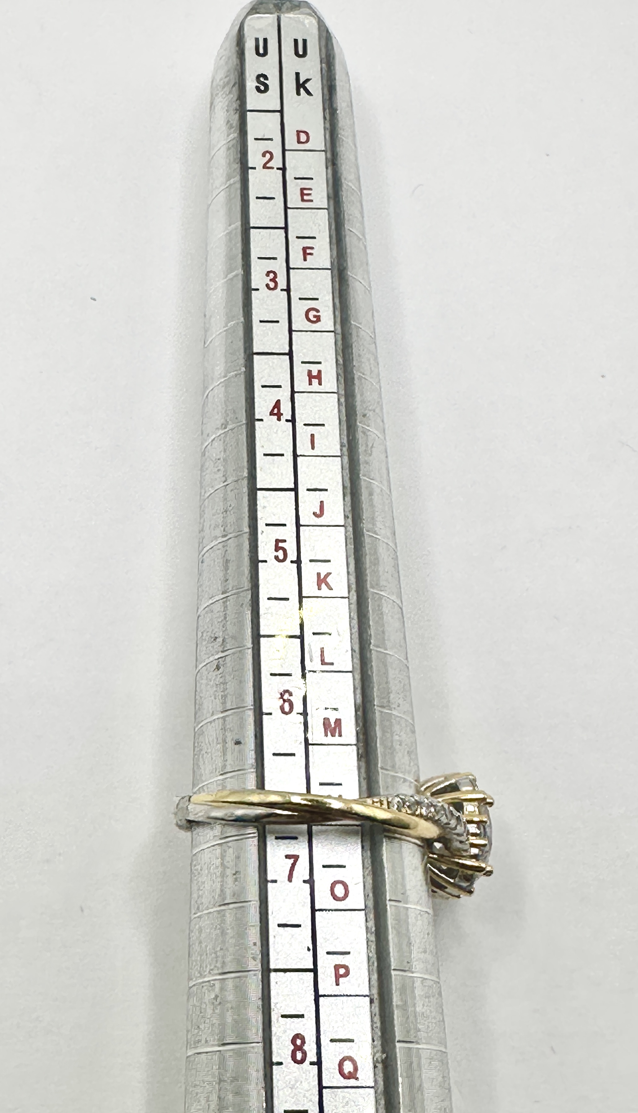 The ring is in good condition with minor surface wear and light scratches consistent with use. All stones appear to be present and securely set.