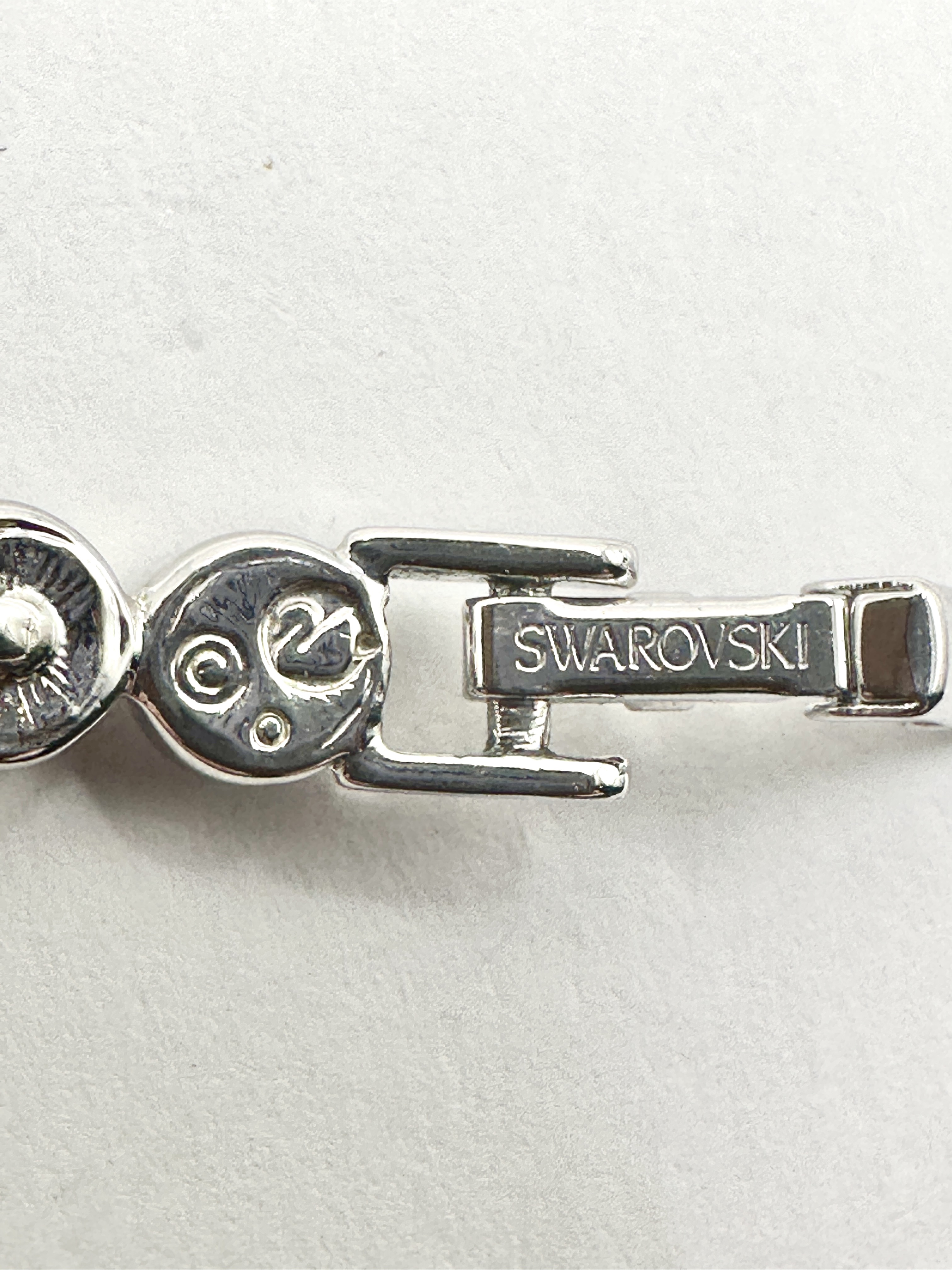 A Swarovski Imber tennis bracelet crafted from 925 silver. The design comprises a continuous row of round, faceted clear crystals, each individually bezel-set. The piece is secured with a fold-over clasp and includes a removable extender link for adjustable sizing. The reverse of the clasp and end links are stamped with the SWAROVSKI brand name, the signature swan logo, and a copyright mark.