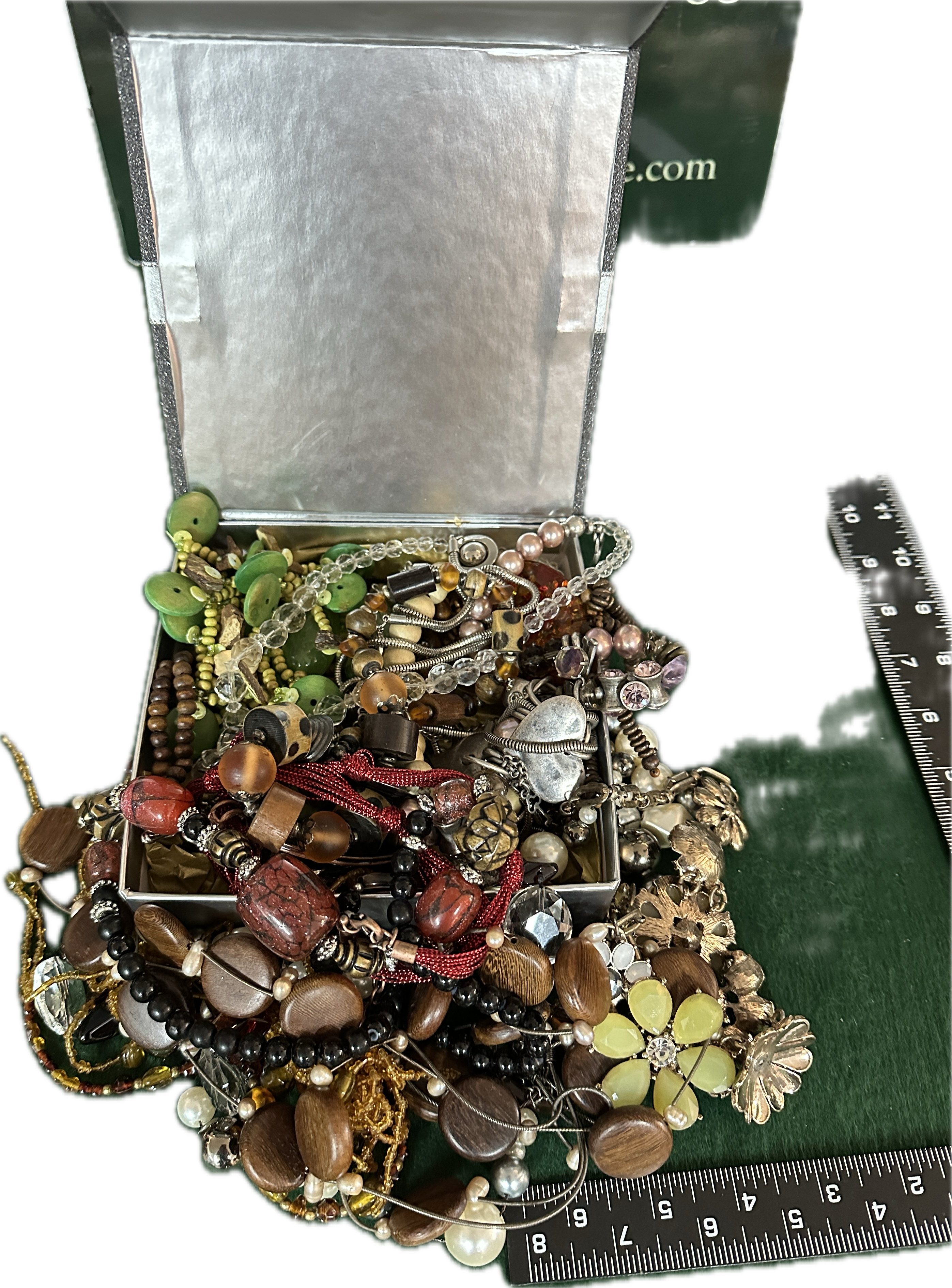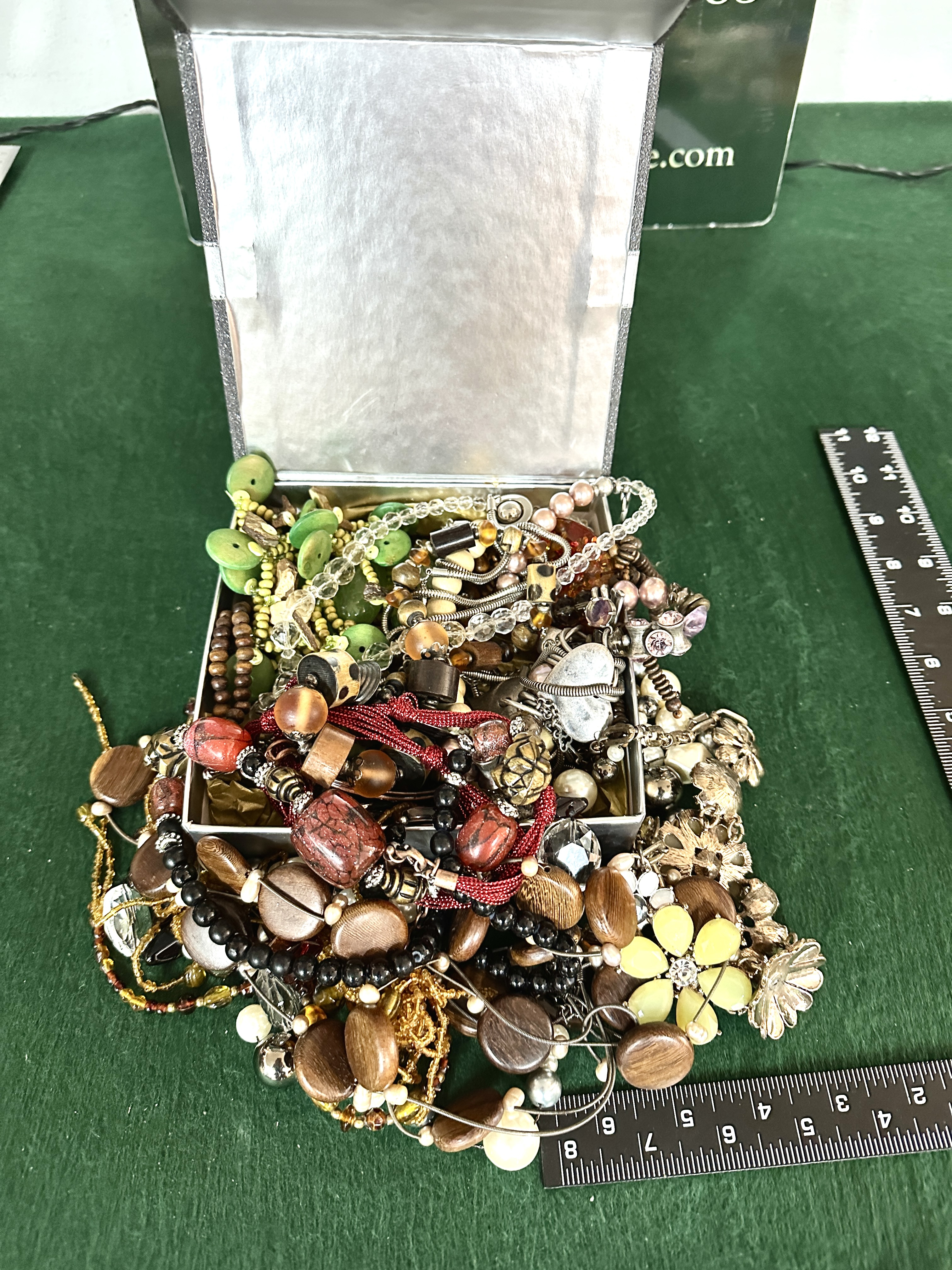 An assortment of vintage and modern costume jewellery presented within a silver-toned cardboard gift box. The collection comprises various necklaces, bracelets, and accessories crafted from a diverse range of materials including polished wood, resin, plastic, glass, faux pearls, and base metals in both silver and gold tones. Notable items include chunky wooden and resin beads in earthy tones, a yellow floral-motif piece accented with rhinestones, and multiple beaded strands in shades of red, green, and black. The pieces exhibit a variety of styles ranging from bohemian to vintage-inspired.