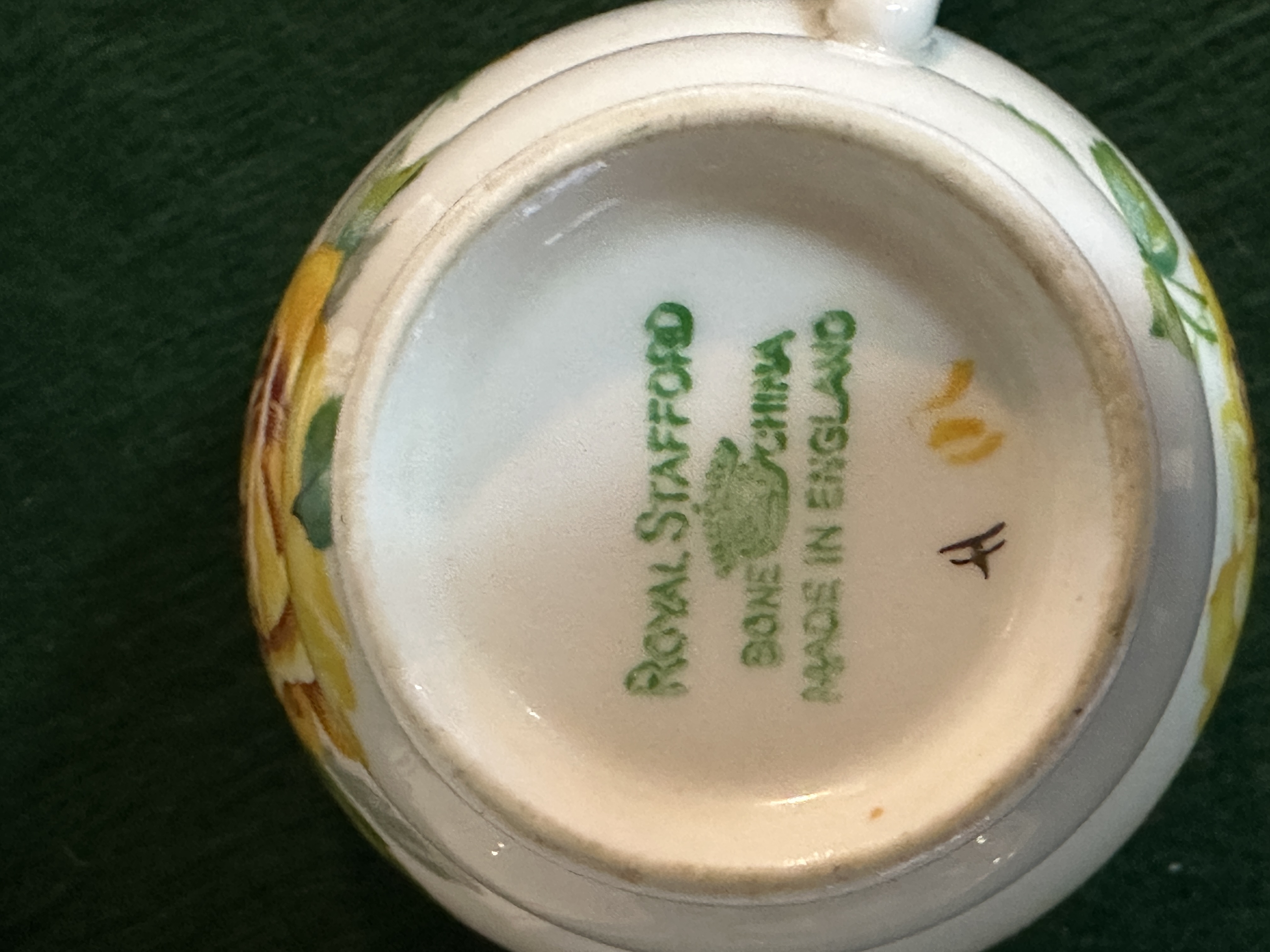 A collection of Royal Stafford bone china tableware manufactured in England, featuring the Yellow Rose pattern. The design consists of transfer-printed yellow roses and green foliage with gilded rims. The group comprises teacups and saucers, side plates, a large scalloped serving platter, a cream jug, a sugar bowl, a handled leaf-shaped serving dish, and salt and pepper shakers. Most pieces bear a green Royal Stafford Bone China Made in England backstamp on the underside.