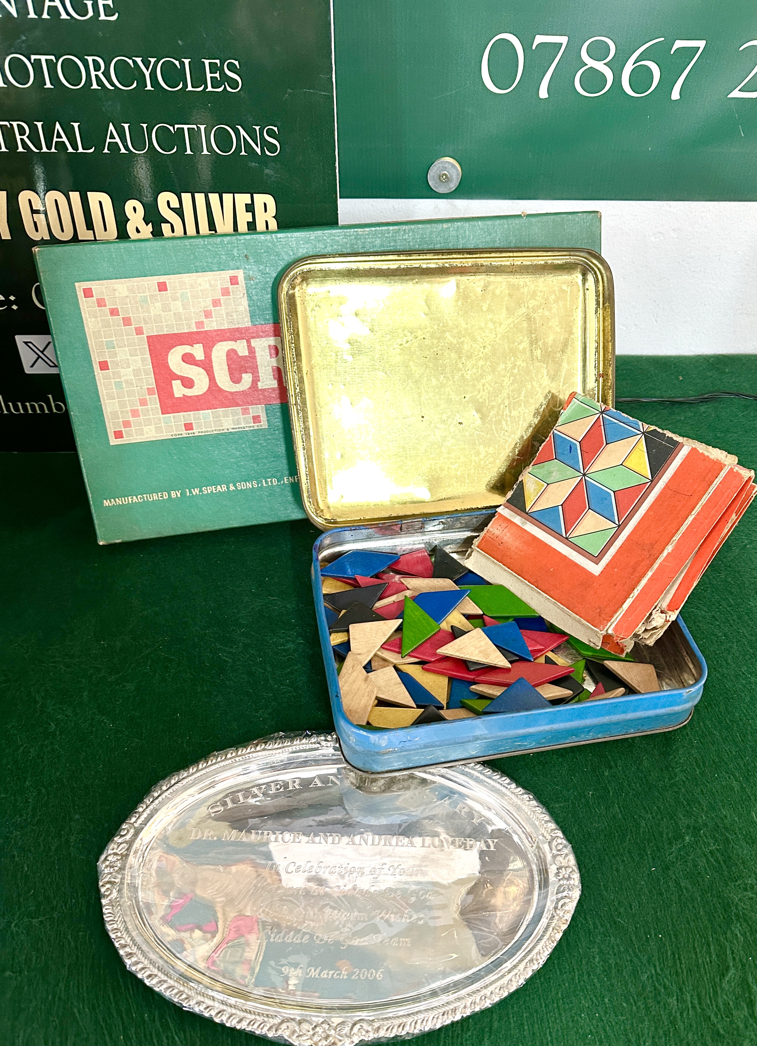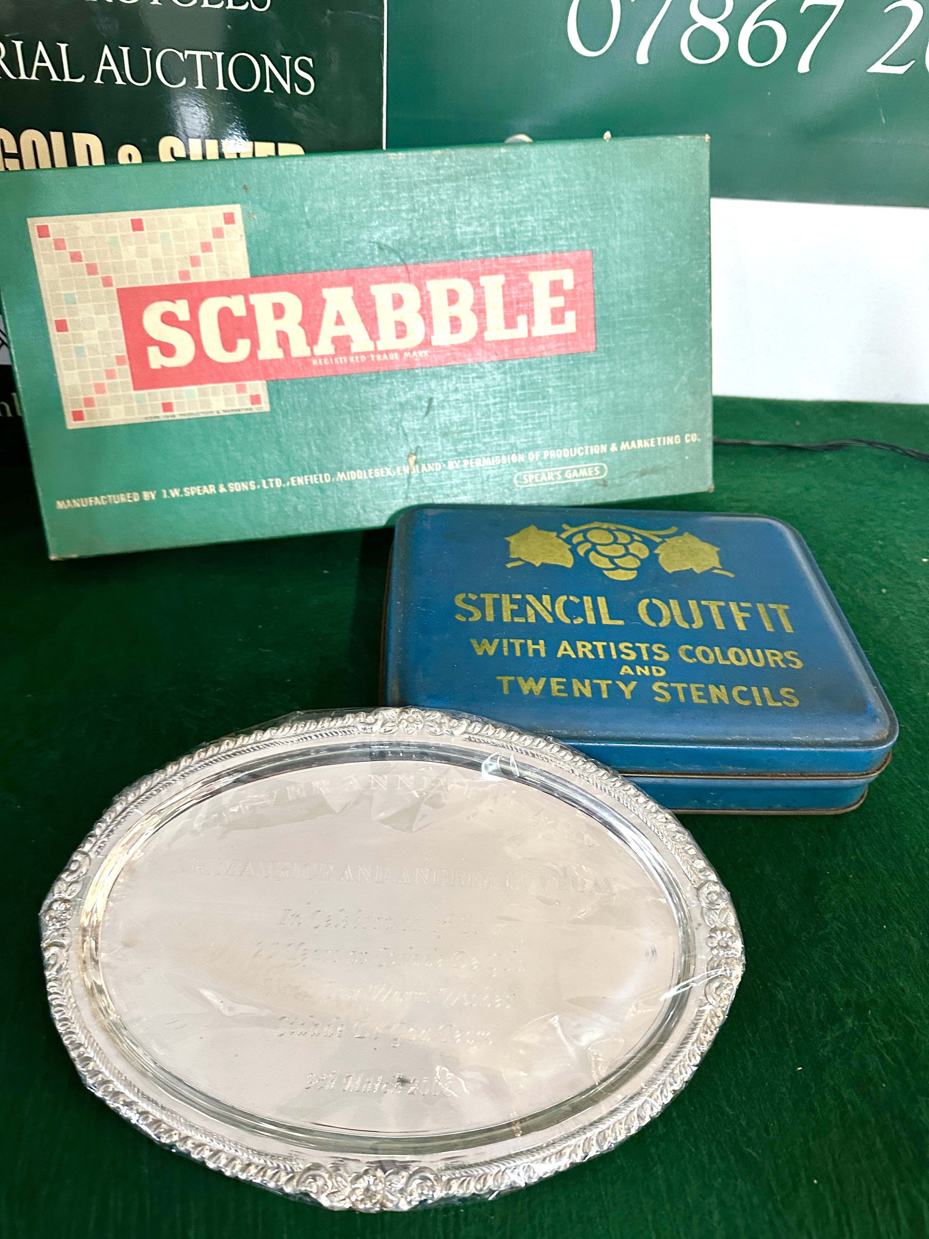 A trio of items including a vintage Scrabble board game, a metal stencil outfit tin, and a commemorative silver plated salver. The Scrabble game is housed in its original green textured box, marked as manufactured by J.W. Spear and Sons, Ltd., Enfield, Middlesex, England. The blue metal Stencil Outfit tin features gold-tone lettering and a grape vine motif, containing a collection of multi-coloured wooden geometric shapes and a printed booklet. The oval silver plated salver is in the Victorian Rose pattern, characterised by a raised floral and foliate border. The salver is centrally engraved with the inscription: Silver Anniversary, Dr. Maurice and Andrea Loveday, In Celebration of Your… at Cidade De Goa, With Our Warm Wishes, Cidade De Goa Team, 9th March 2006.