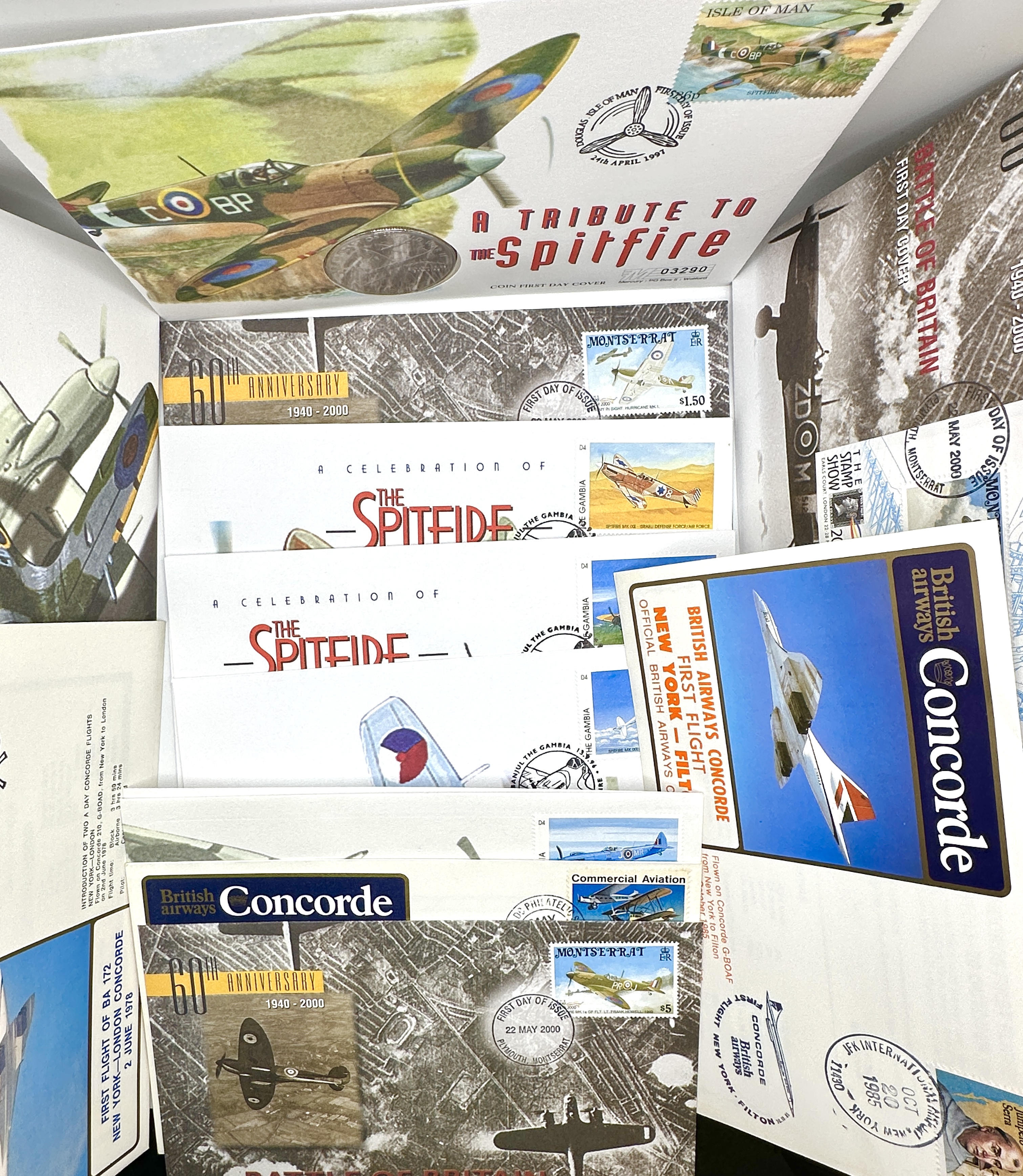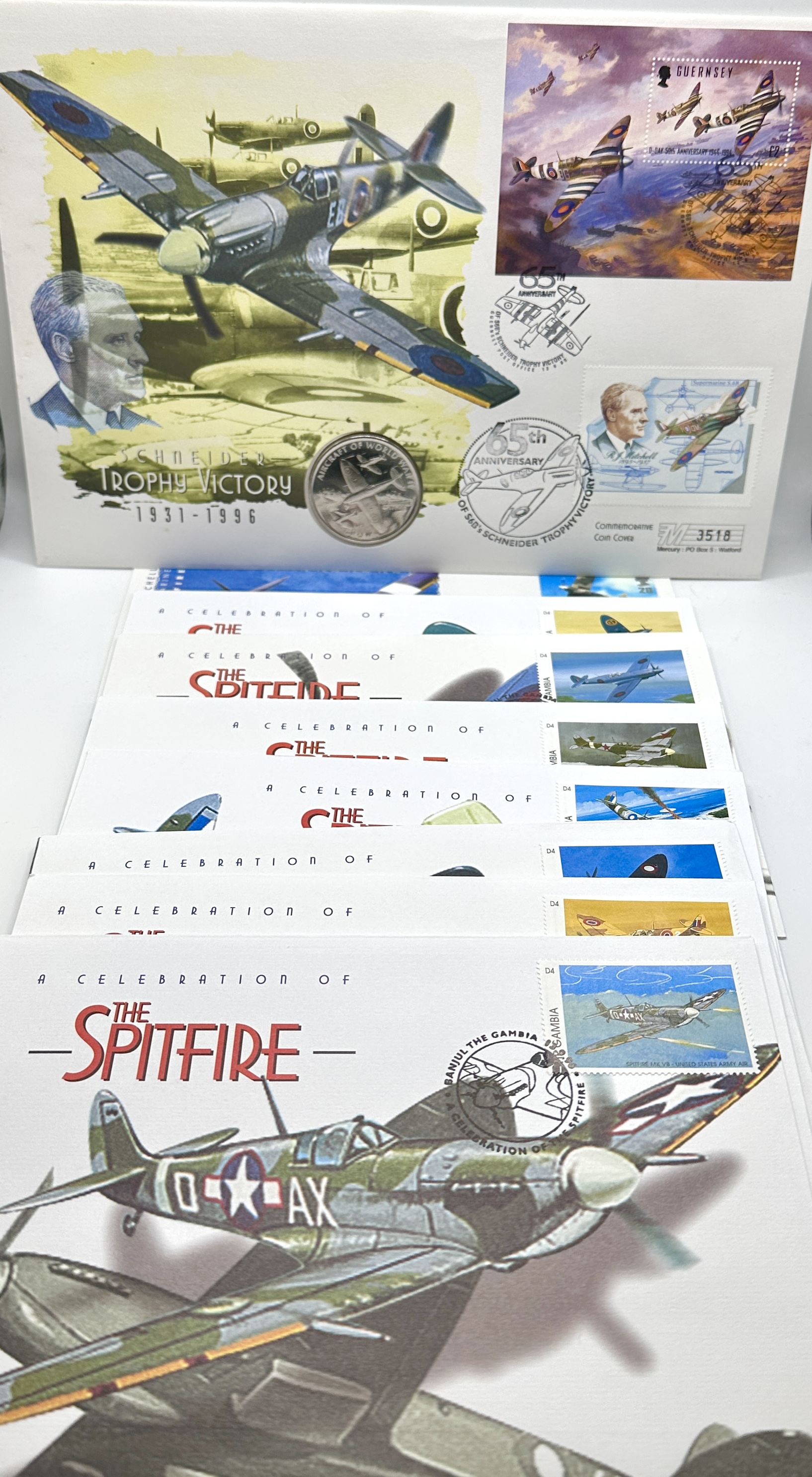 A collection of philatelic and numismatic commemorative covers documenting significant milestones in aviation history. The group includes a Schneider Trophy Victory 1931-1996 commemorative coin cover featuring Guernsey stamps and an integrated 65th Anniversary crown coin, numbered 3518. Also present is an Isle of Man A Tribute to The Spitfire coin first day cover dated 1997. The collection further comprises multiple A Celebration of The Spitfire first day covers with stamps from The Gambia, and 60th Anniversary Battle of Britain 1940-2000 covers with Montserrat stamps postmarked 22 May 2000. Additionally, the lot includes British Airways Concorde commemorative covers documenting various flights, including the first flight from New York to London on 2 June 1978 and New York to Filton on 20 October 1985. The items consist of printed paper envelopes with applied postage stamps, official postmarks, and integrated commemorative coins.