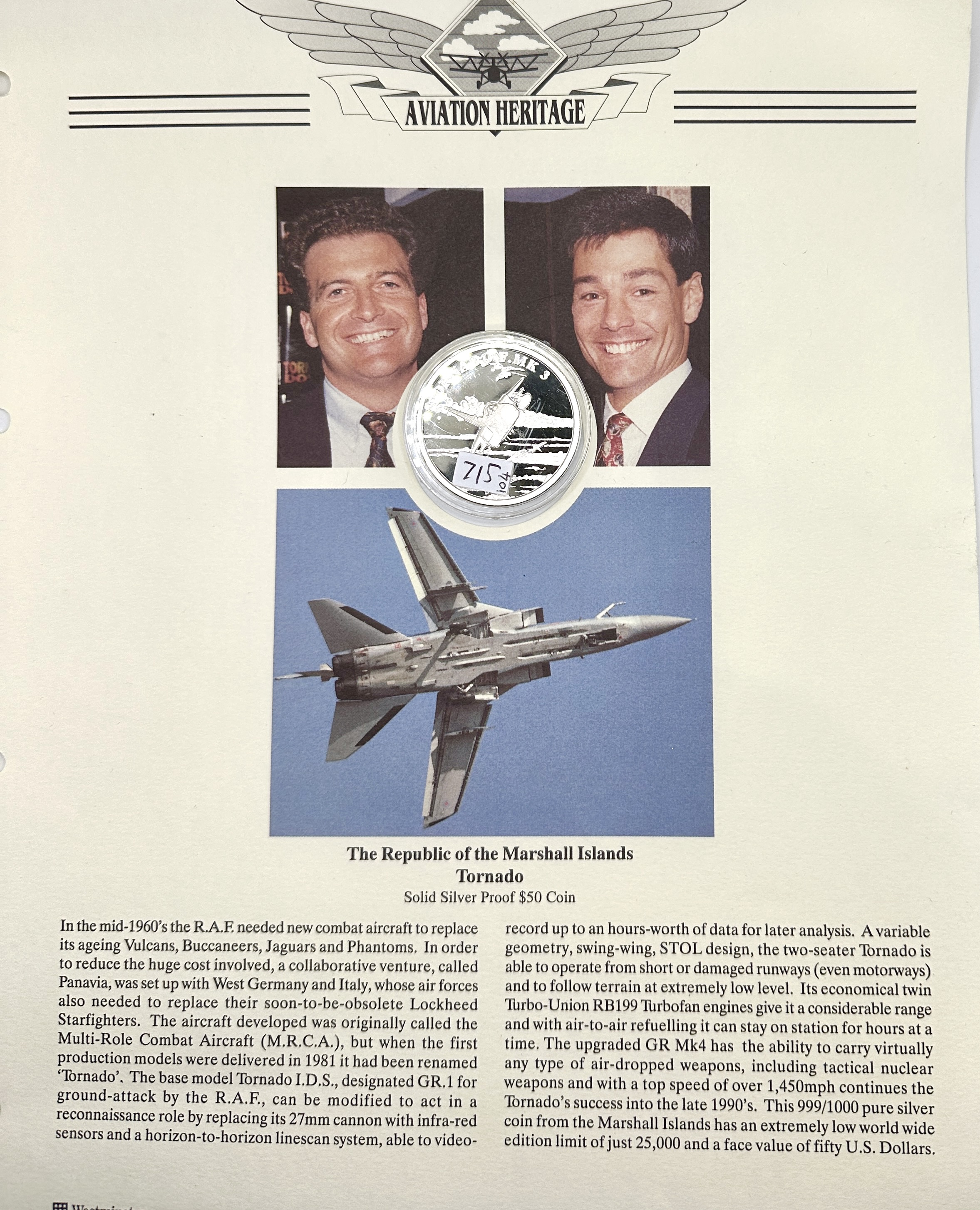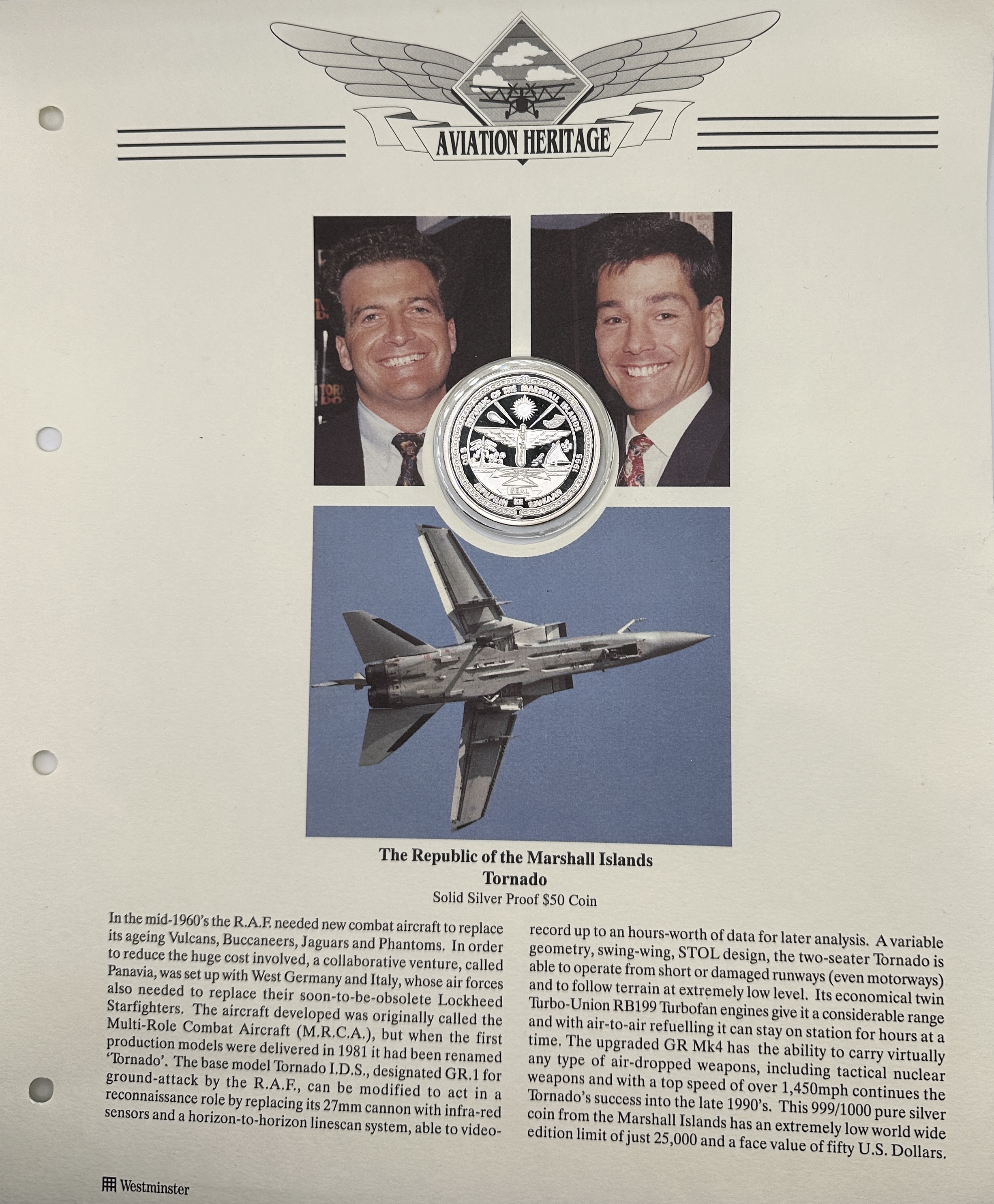 A Republic of the Marshall Islands 1995 50 dollar proof coin struck in 999.9 silver, commemorating the Panavia Tornado ADV Mk 3 aircraft. This 1oz silver coin is presented within a clear protective capsule and mounted to a Westminster Aviation Heritage presentation sheet. The sheet features the Aviation Heritage logo, photographic portraits, and a large image of the Tornado jet. The reverse of the coin depicts the aircraft in flight, while the obverse displays the seal of the Republic of the Marshall Islands. The accompanying text provides a detailed history of the aircraft’s development and its service as a Multi-Role Combat Aircraft. The presentation sheet is pre-punched for storage in a three-ring binder.