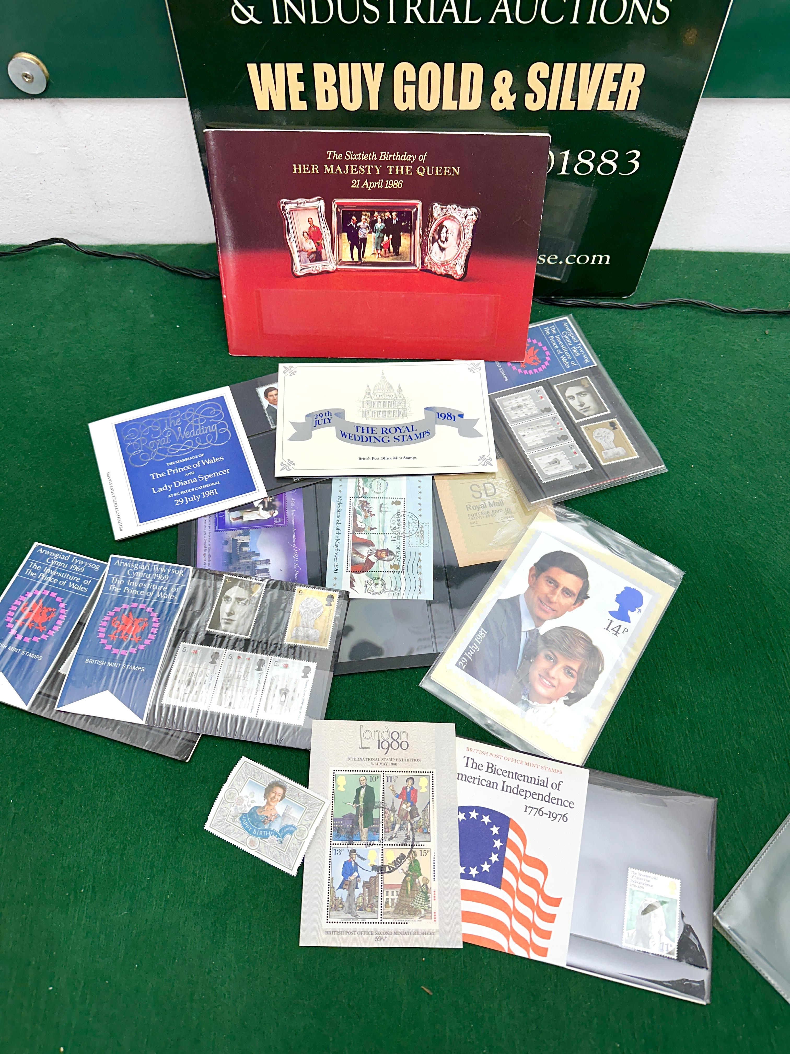 This collection of British philatelic and royal commemorative items comprises various mint stamps, commemorative covers, and presentation packs dating from the late 20th century. The group features a red presentation book titled The Sixtieth Birthday of Her Majesty the Queen 21st April 1986, which includes commemorative stamps and biographical text. Also included are several sets and covers for the 1981 wedding of the Prince of Wales and Lady Diana Spencer, and British Post Office mint stamp packs for the 1969 Investiture of the Prince of Wales (Arwisgiad Tywysog Cymru). Further items include a miniature sheet from the London 1980 International Stamp Exhibition and a British Post Office pack commemorating the Bicentennial of American Independence 1776-1976. The items are constructed of printed card and paper, with many preserved in their original plastic or card presentation sleeves.