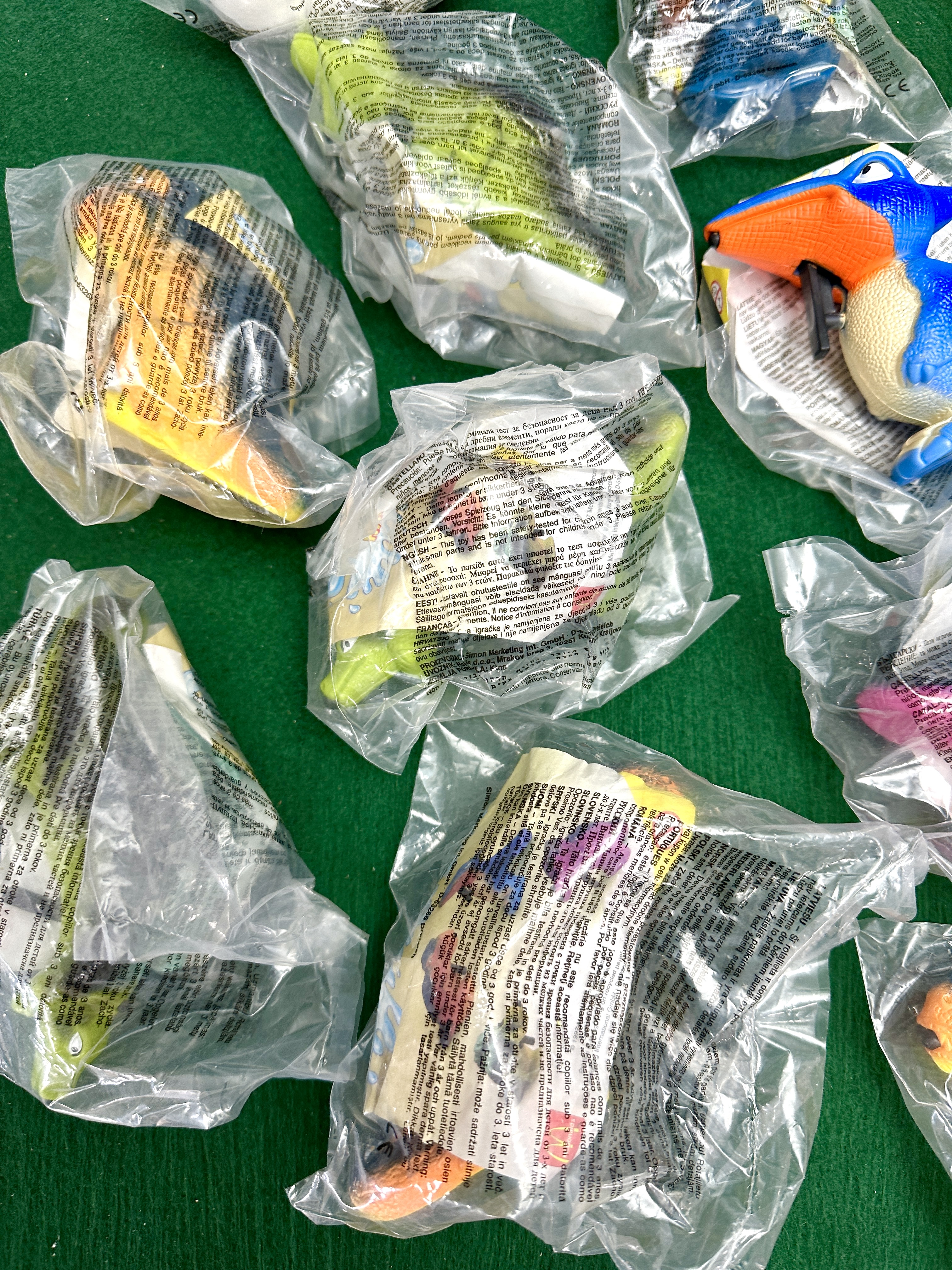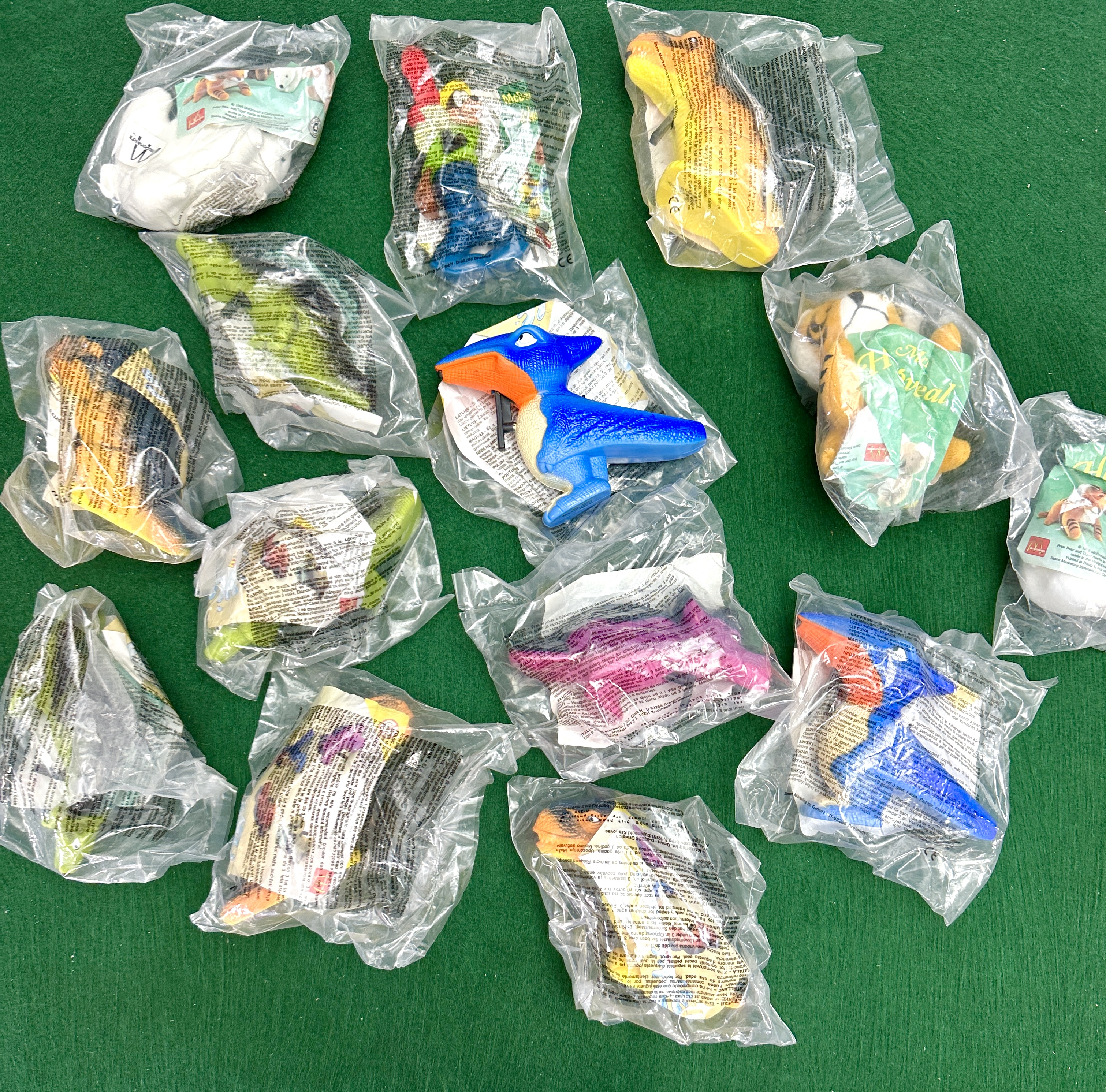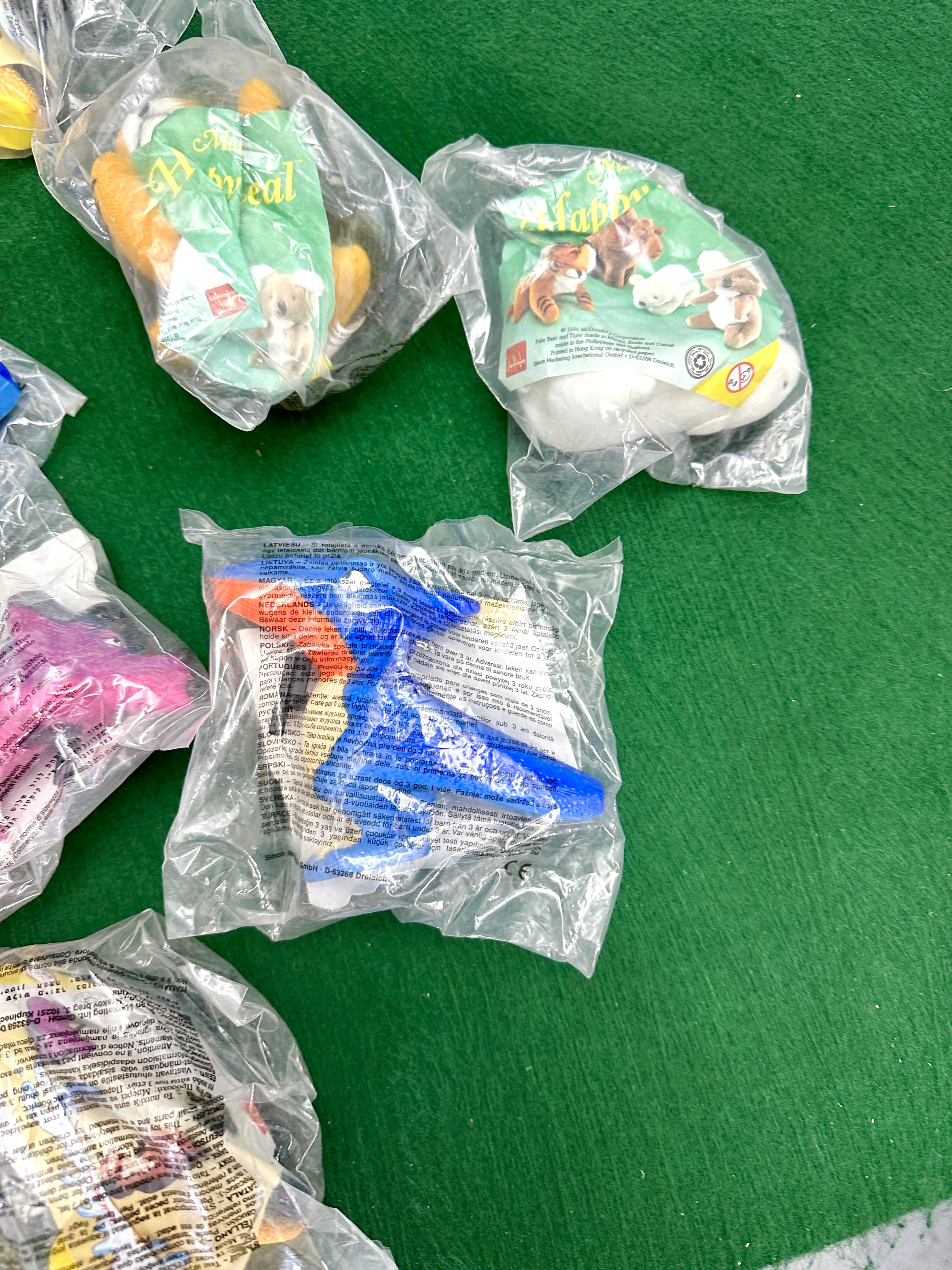 This collection comprises various McDonald’s Happy Meal promotional items, primarily dating from the late 1990s. The group includes both plush animal figures and plastic figurines. Visible subjects include tigers, polar bears, and a variety of prehistoric creatures such as dinosaurs and pterosaurs. The majority of the items are housed in their original clear plastic factory packaging, which features the McDonald’s logo and multi-lingual safety warnings in English, German, French, and Polish. A copyright date of 1998 is visible on several of the packages. The plastic figurines include a blue pterosaur and various multi-coloured dinosaur forms.
