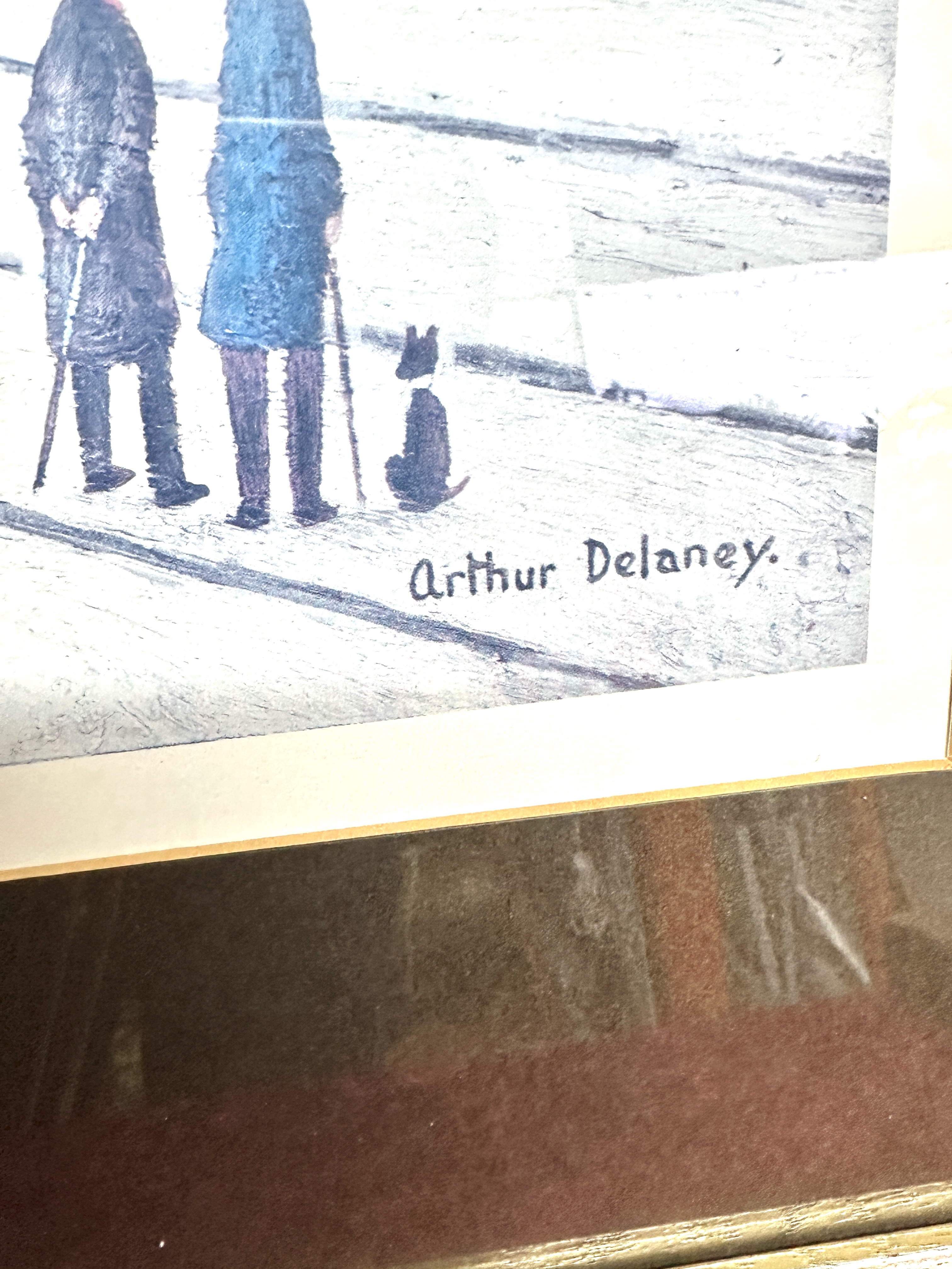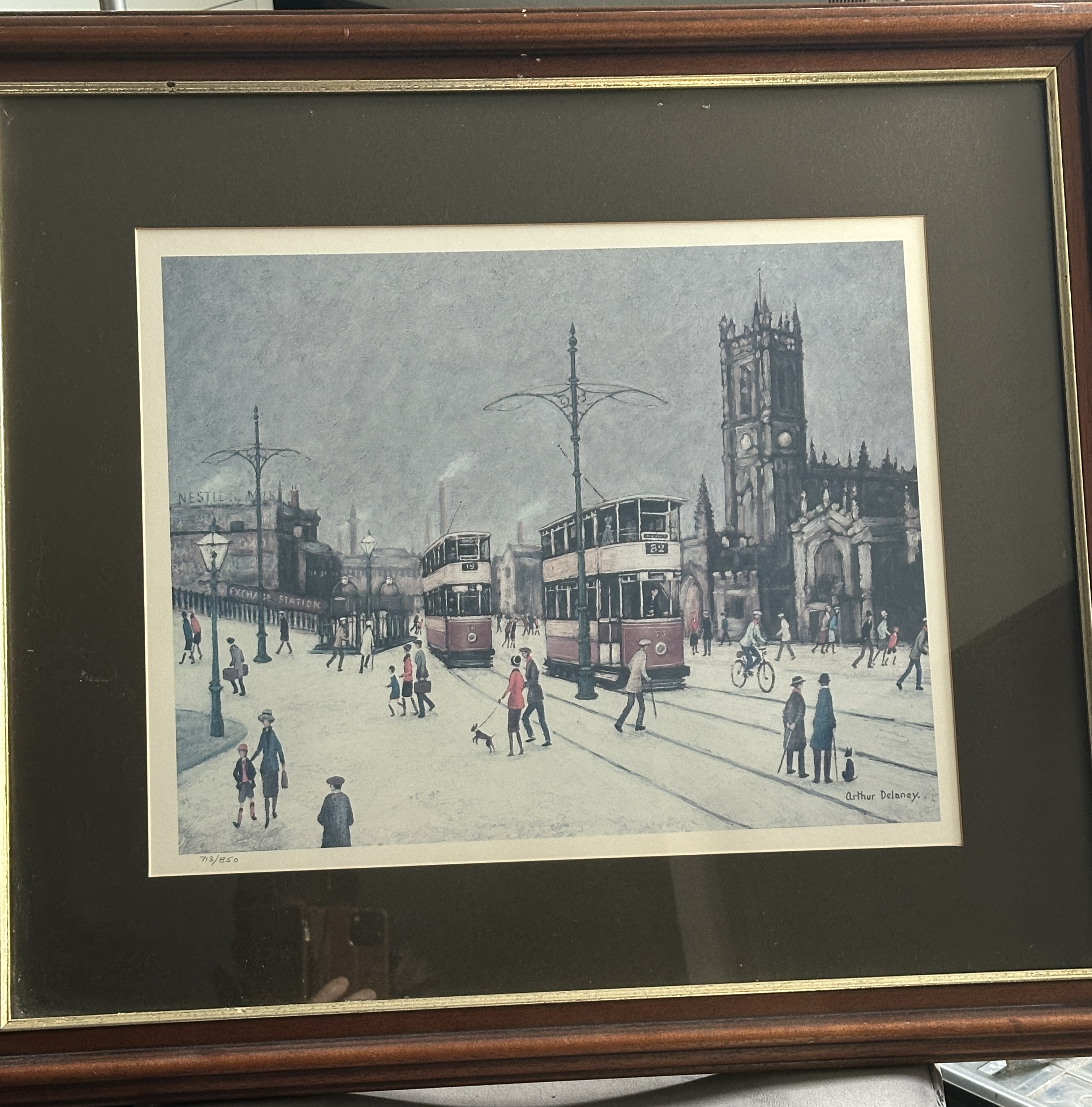 A signed limited edition colour print by British artist Arthur Delaney (1927-1987), depicting a nostalgic Manchester street scene. The composition features a bustling square with pedestrians, two double-decker trams, and the gothic architecture of Manchester Cathedral in the background. Visible signage includes Exchange Station and Nestles Milk. The work is signed Arthur Delaney in the lower right margin and hand-numbered 713/850 in the lower left margin. The print is presented in a dark wood frame with a gold-tone inner lip and a dark brown mount.