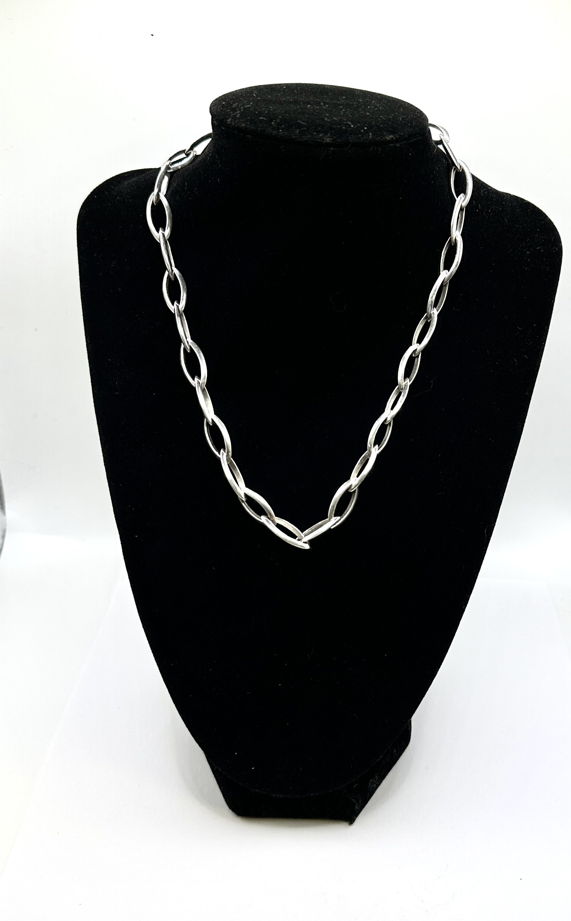 This necklace is crafted from 925 silver and features a contemporary design of large, elongated open links in a navette or pointed oval shape. The piece is finished with a high polish and consists of interlocking links.
