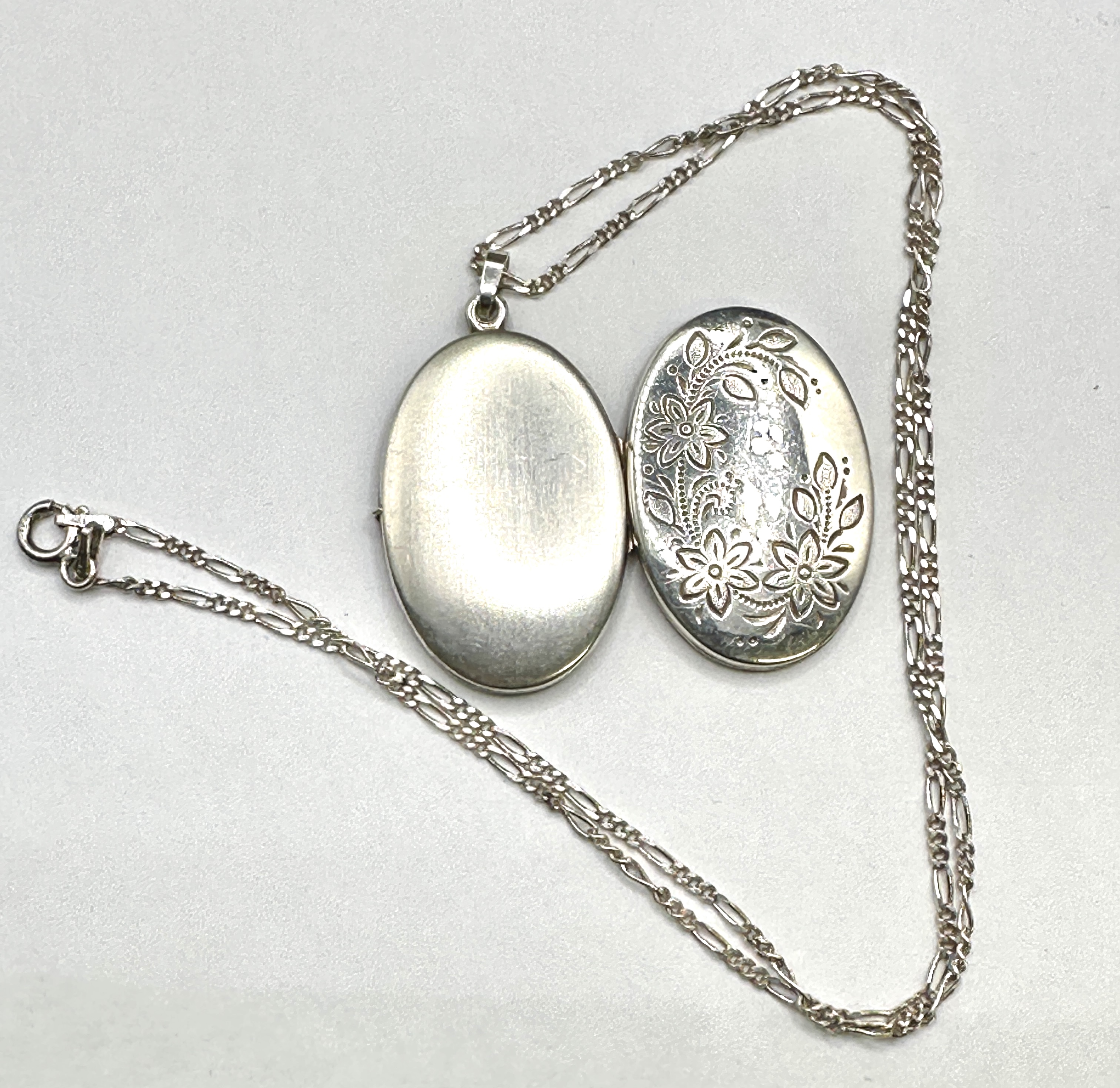 A 925 silver locket necklace featuring an oval-shaped pendant. The front of the locket is decorated with an engraved floral and foliate motif, while the reverse is plain and polished. The pendant is suspended from a 925 silver Figaro-style chain with a spring-ring clasp. The interior opens to reveal two recessed oval compartments with dark linings for photograph placement. No hallmarks or maker’s marks are identifiable.