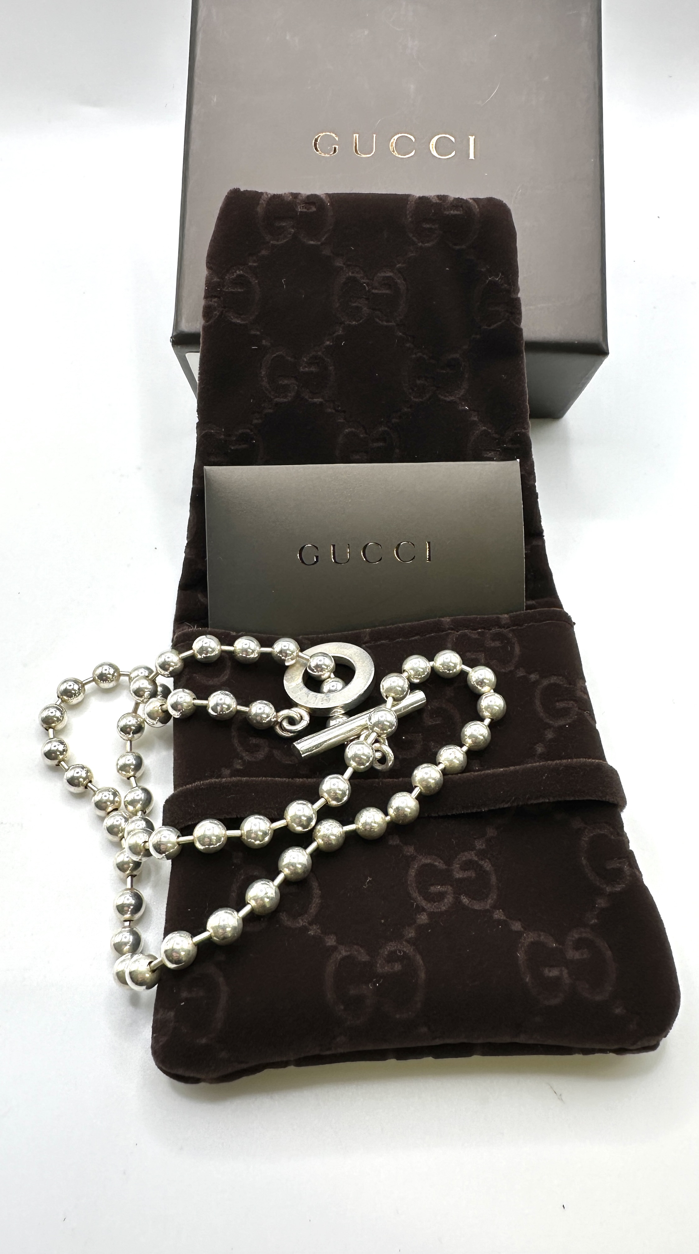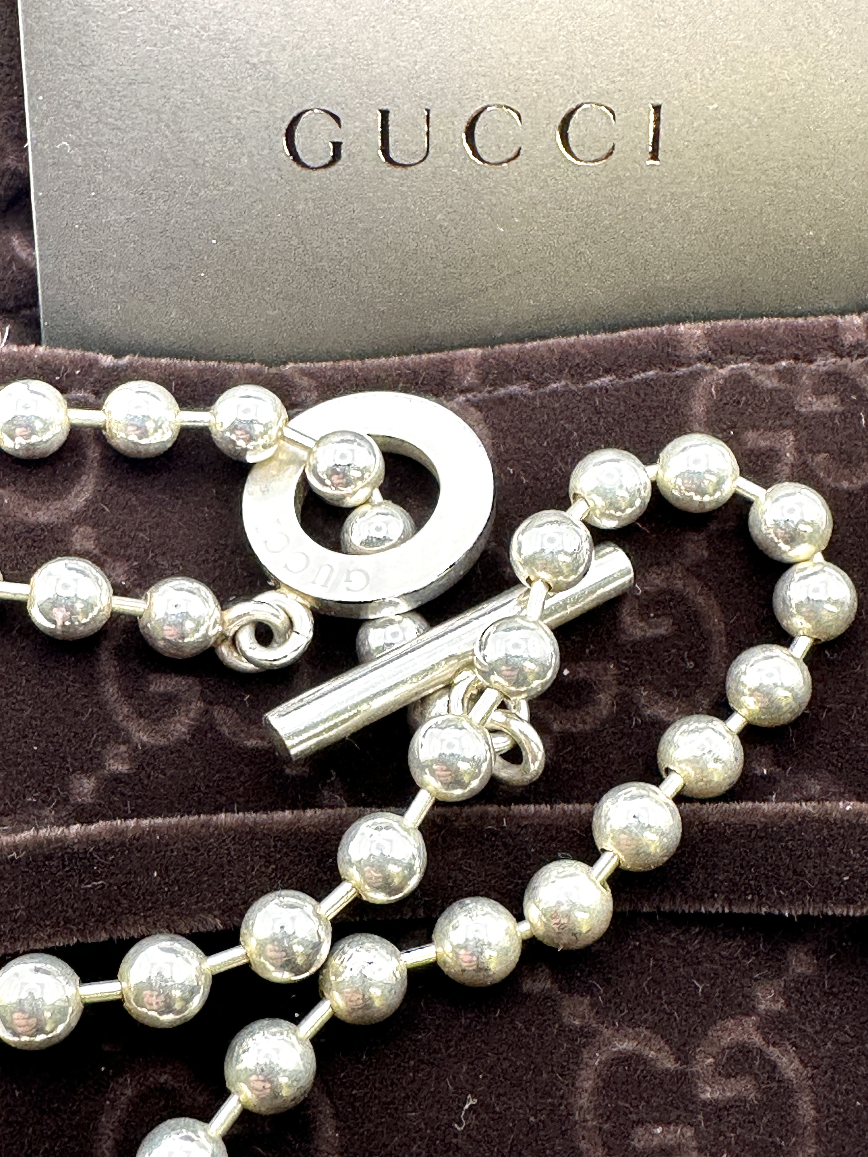 A Gucci sterling silver boule chain necklace. The piece is composed of a series of sterling silver beads in a ball chain configuration, terminating in a toggle clasp. The circular component of the clasp is engraved with the GUCCI maker mark. This item is presented with its original branded packaging, comprising a presentation box, a dark brown velvet-effect pouch with an interlocking GG monogram motif, and a Gucci card.