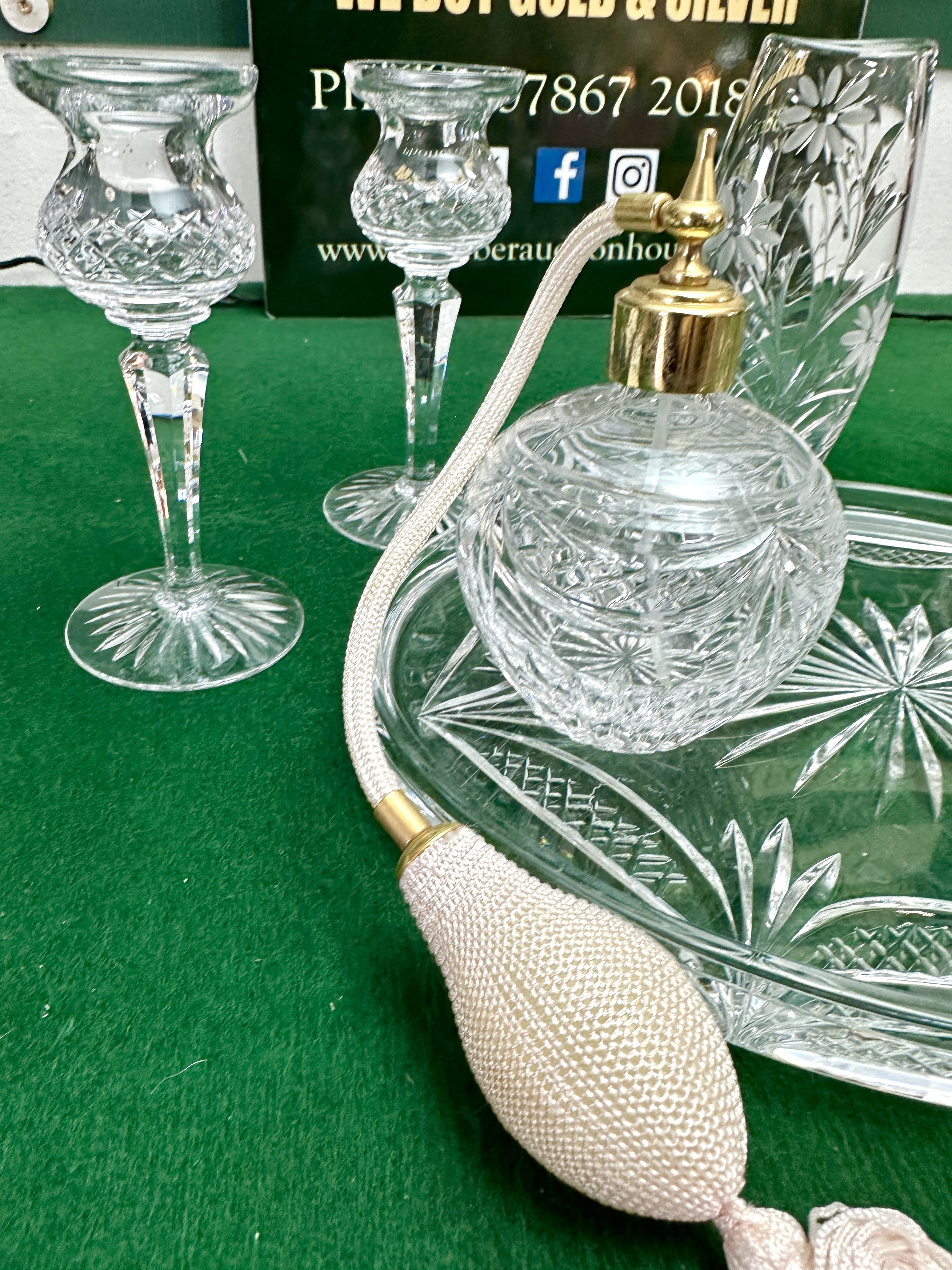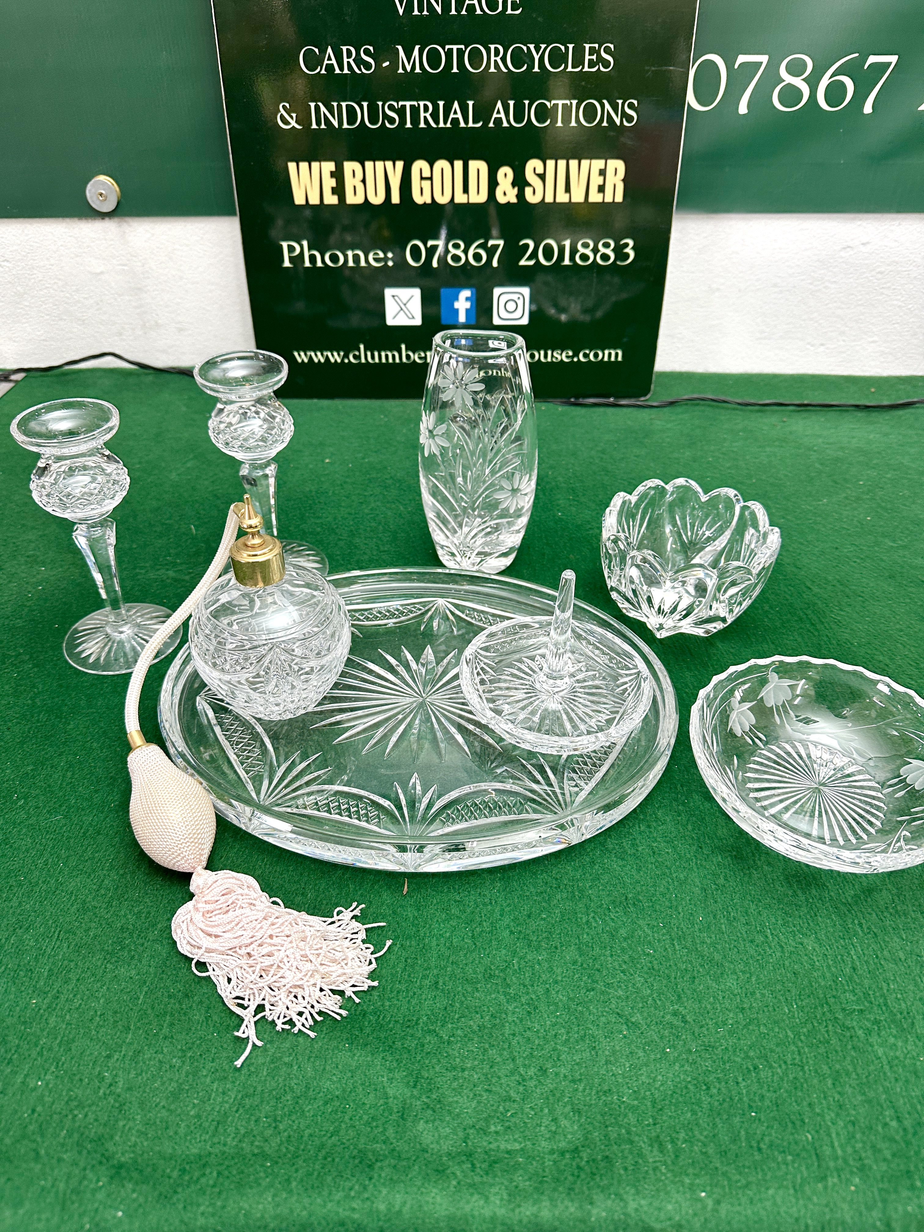 A collection of dressing table accessories. The assortment includes a circular tray, a perfume atomiser with a fabric bulb and tassel, a pair of candlesticks, a bud vase, a ring tree, and multiple decorative bowls. Each piece is decorated with cut geometric and floral patterns, including starburst and diamond-cut motifs.
