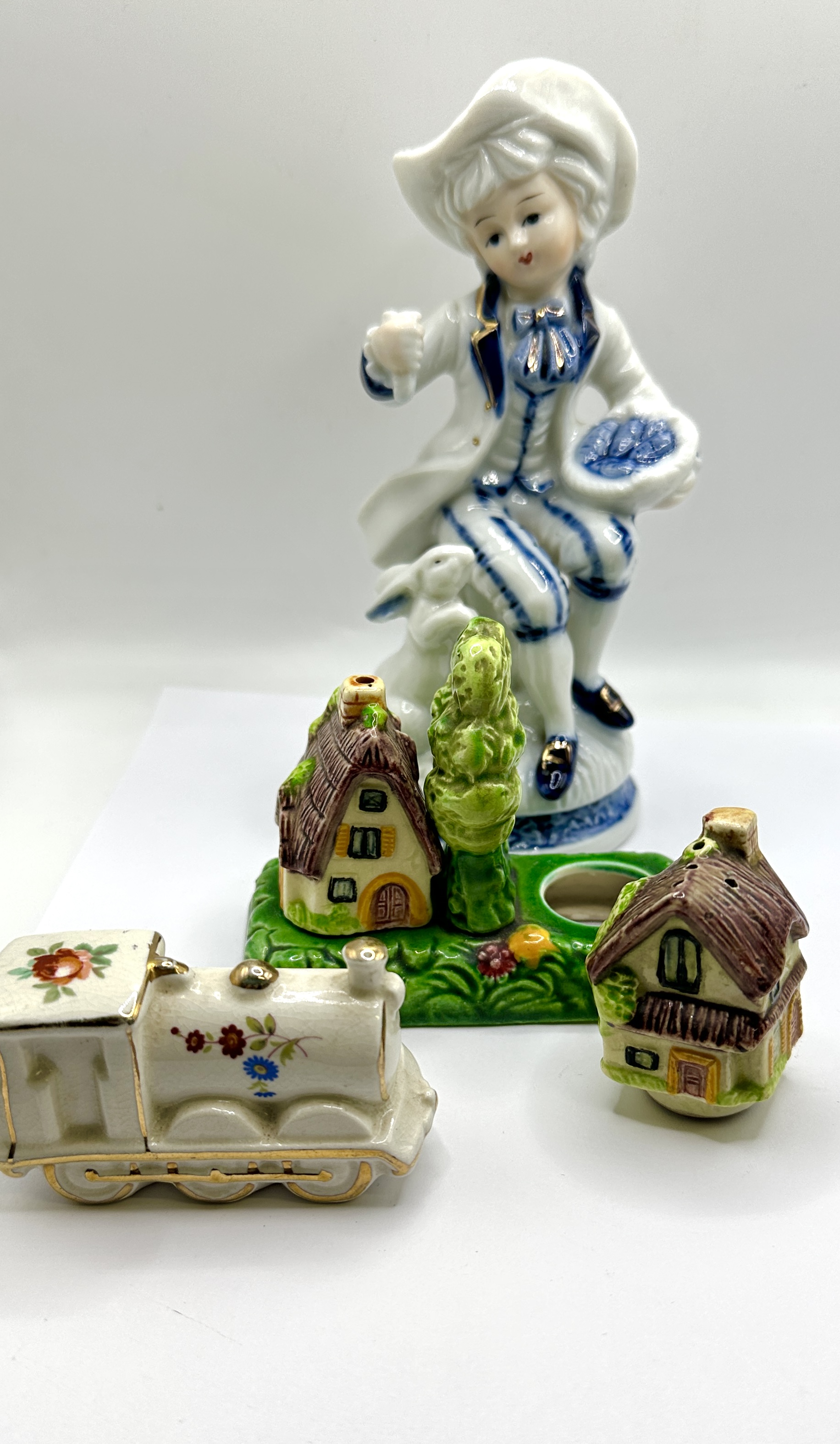 A West European porcelain figurine of a boy with a rabbit and associated decorative items. The figurine depicts a youth in 18th-century colonial style attire, including a tricorne hat and frock coat, decorated in white with blue and gold-toned highlights. The lot also includes a miniature ceramic steam locomotive finished in a white glaze with polychrome floral decals and gold-painted trim. Completing the group is a novelty cottage-themed condiment set, featuring a green-glazed base moulded with a tree and a fixed cottage, alongside a matching secondary cottage-form shaker.