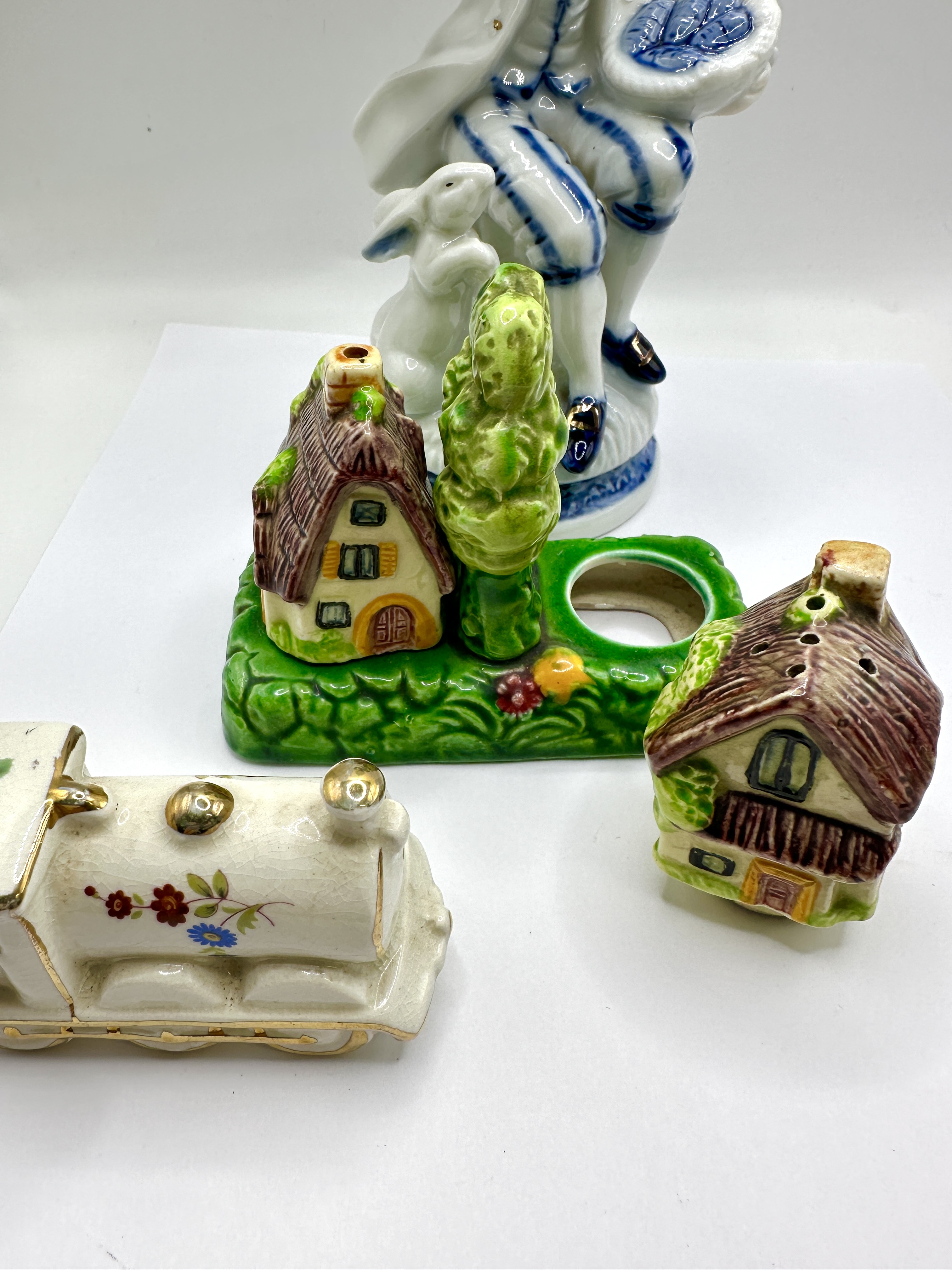 The items exhibit signs of age and handling consistent with vintage collectibles. The ceramic locomotive displays prominent crazing to the glazed surface. The porcelain figurine and cottage condiment set appear to be in good overall condition.
