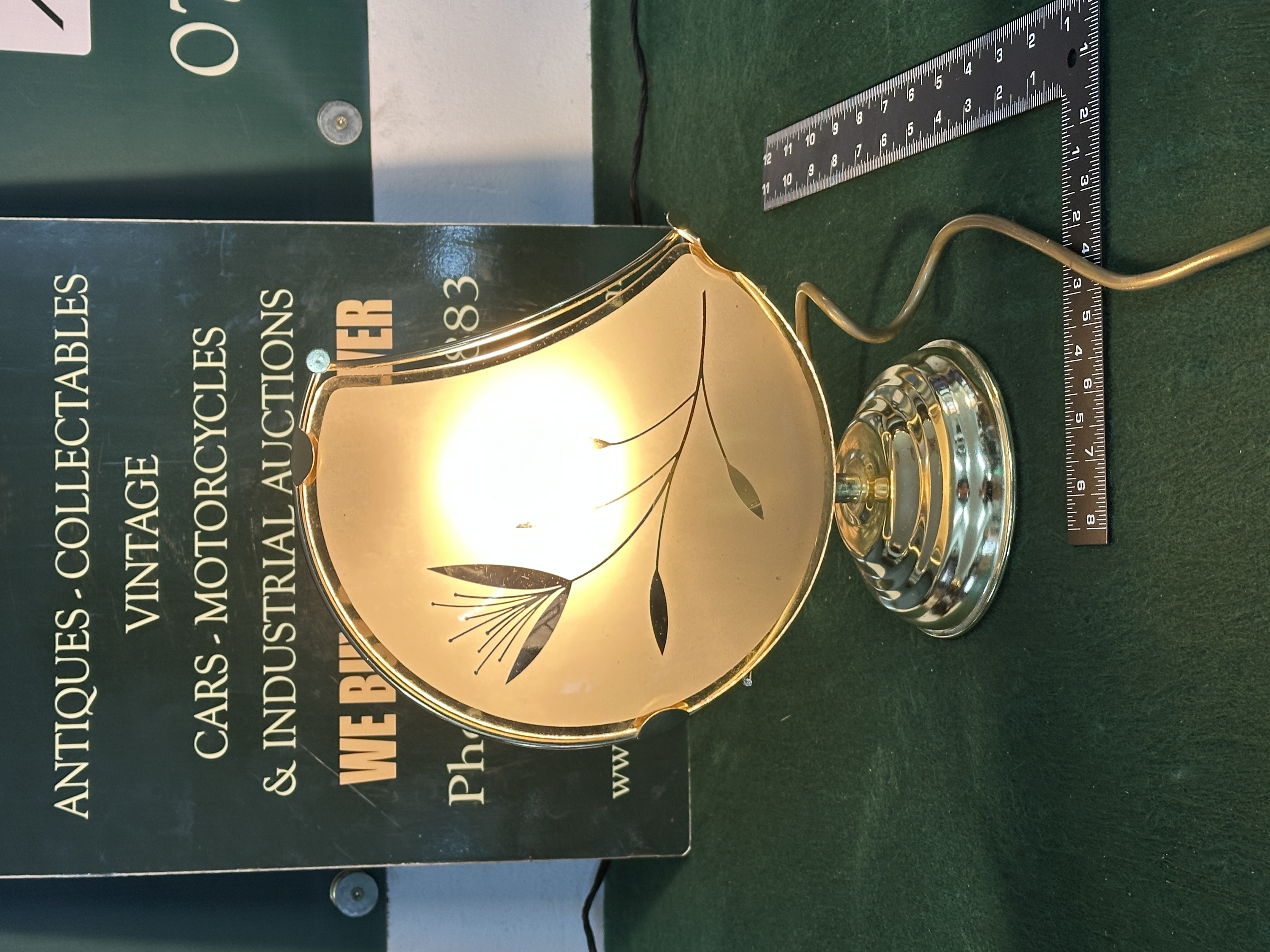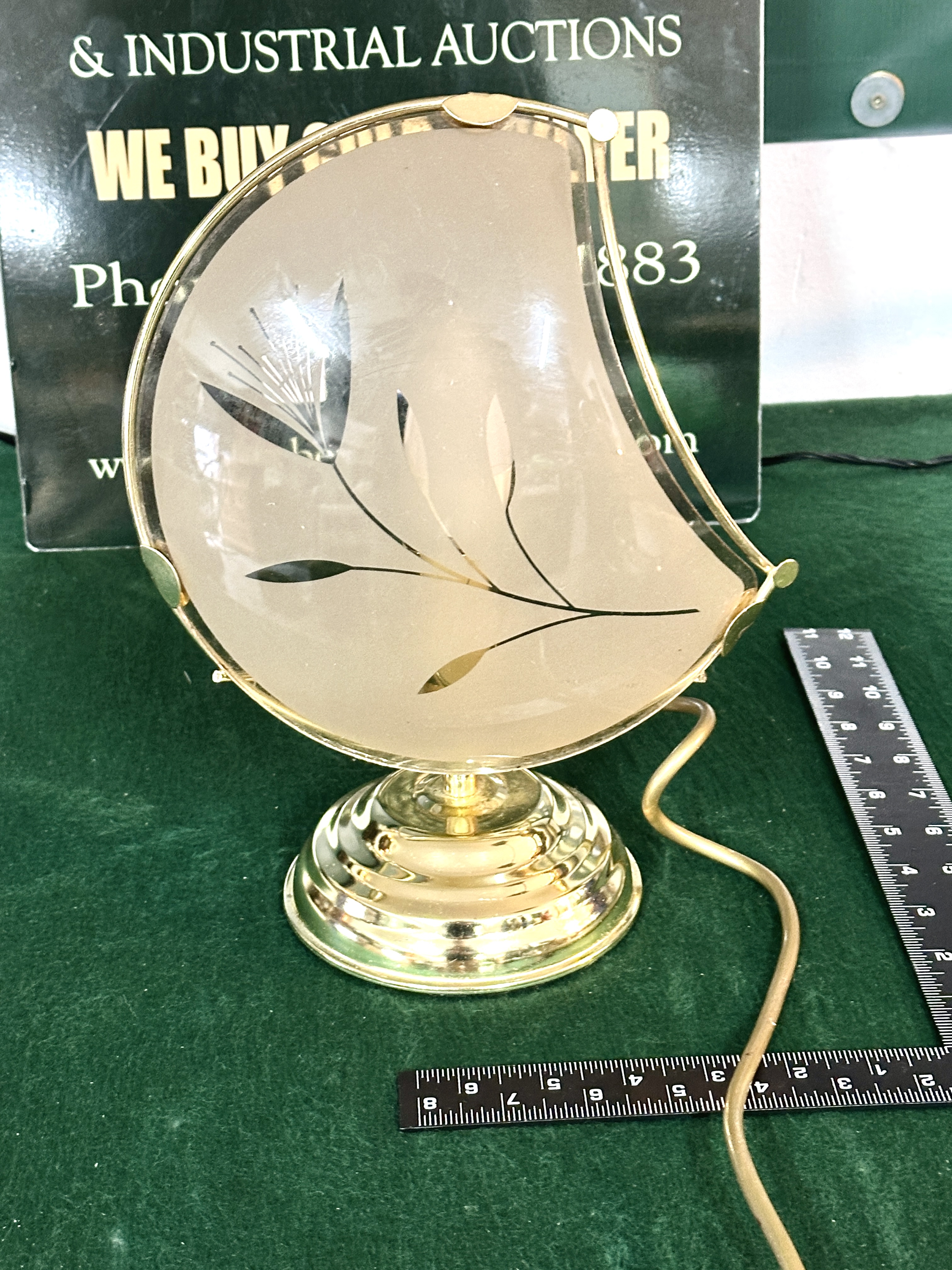 A vintage three-way touch table lamp featuring a crescent-shaped frosted glass shade decorated with a black floral sprig motif. The glass panel is held within a polished gold-toned metal frame, mounted on a matching circular, tiered, stepped base. The lamp is shown in working condition with the internal light source illuminated.