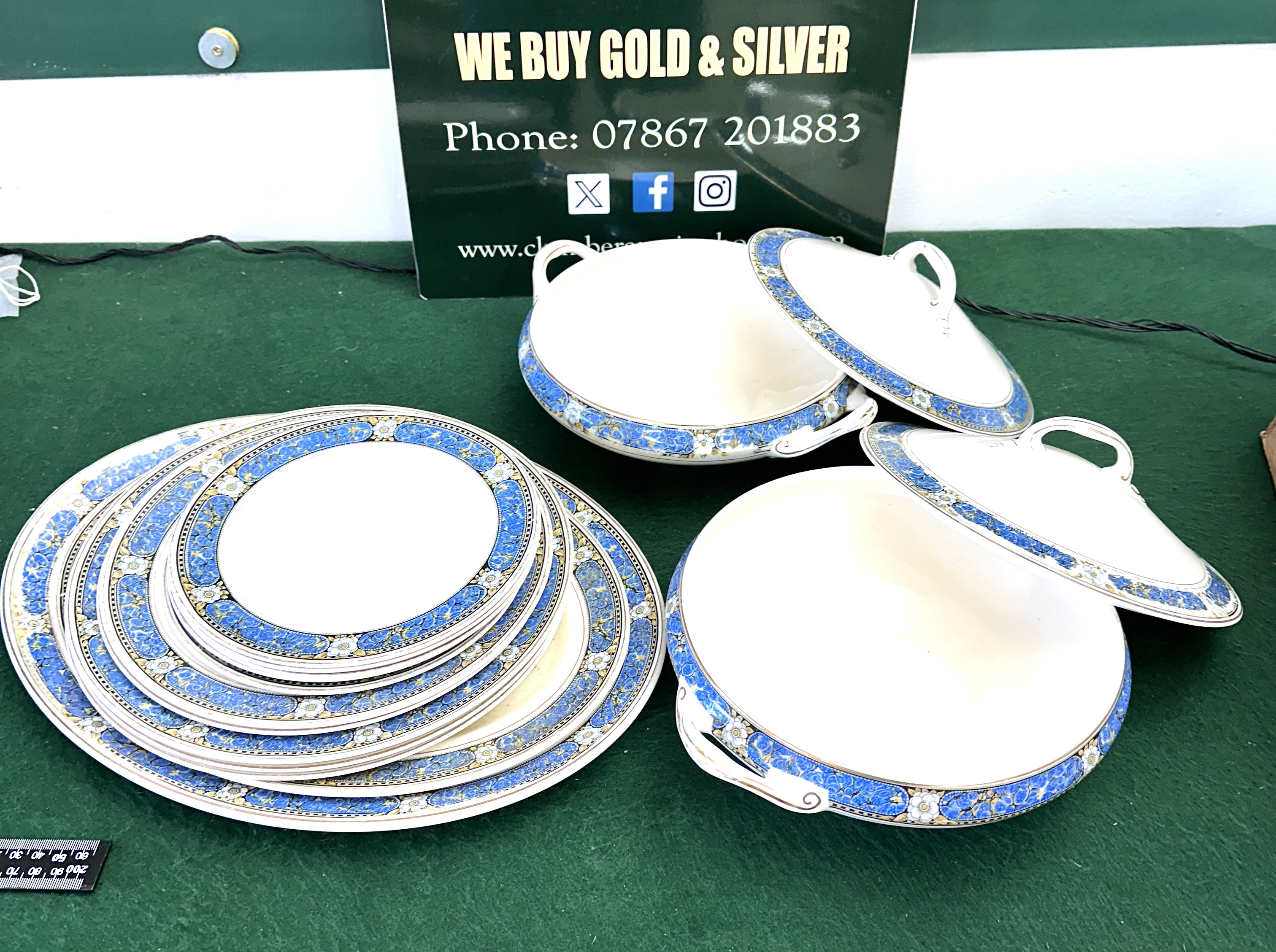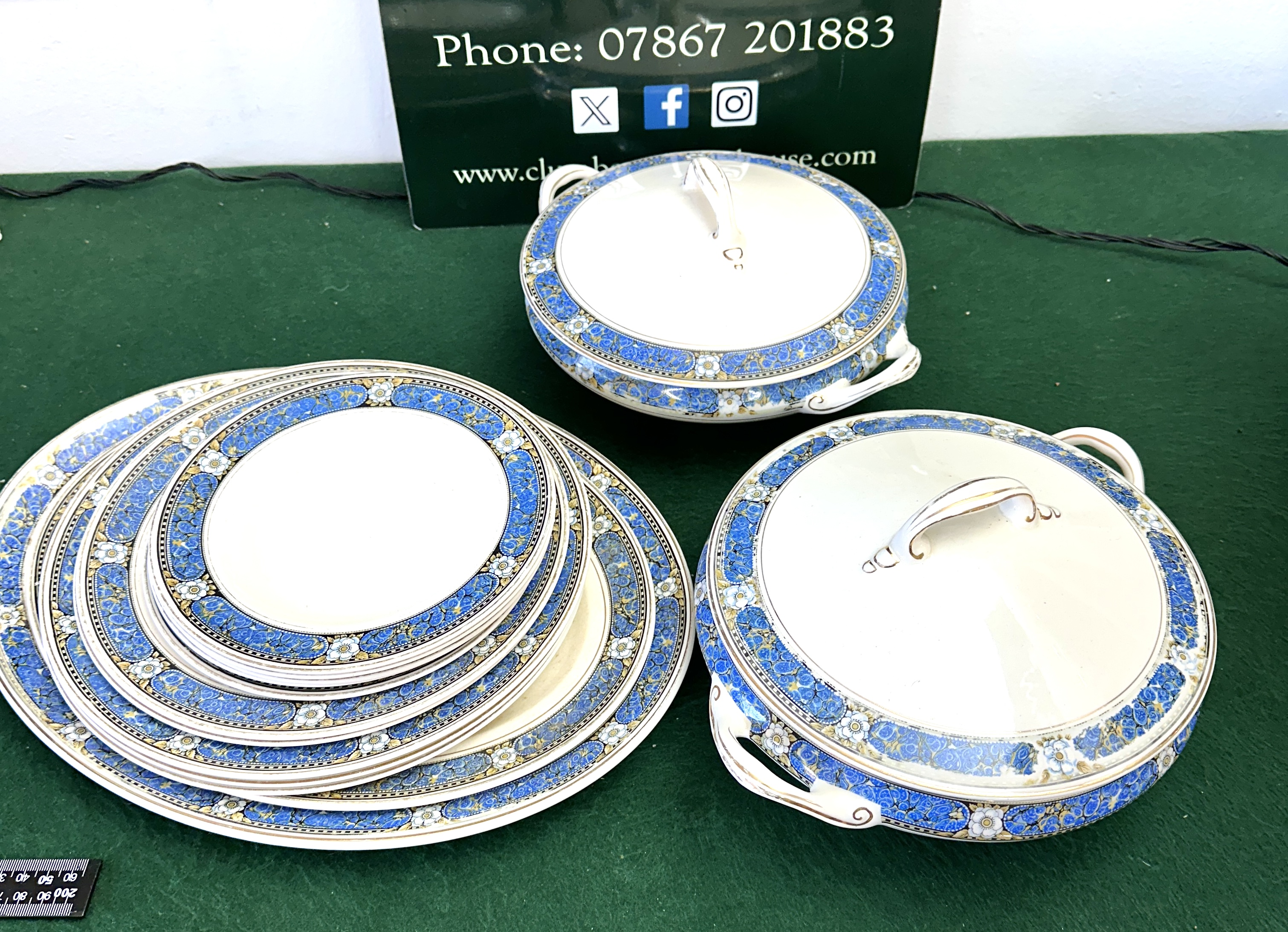 A collection of ceramic dinnerware featuring a decorative cobalt blue border with white floral motifs and gilded scrolling accents. The group comprises two lidded tureens with twin scrolling handles and several graduated plates and platters. The pieces are constructed from white ceramic with a glazed finish and exhibit intricate patterning to the borders. The tureens are fitted with scrolling handles and gilded finials to the lids. The items show a traditional aesthetic with gilt-heightened rims and scrolling details.