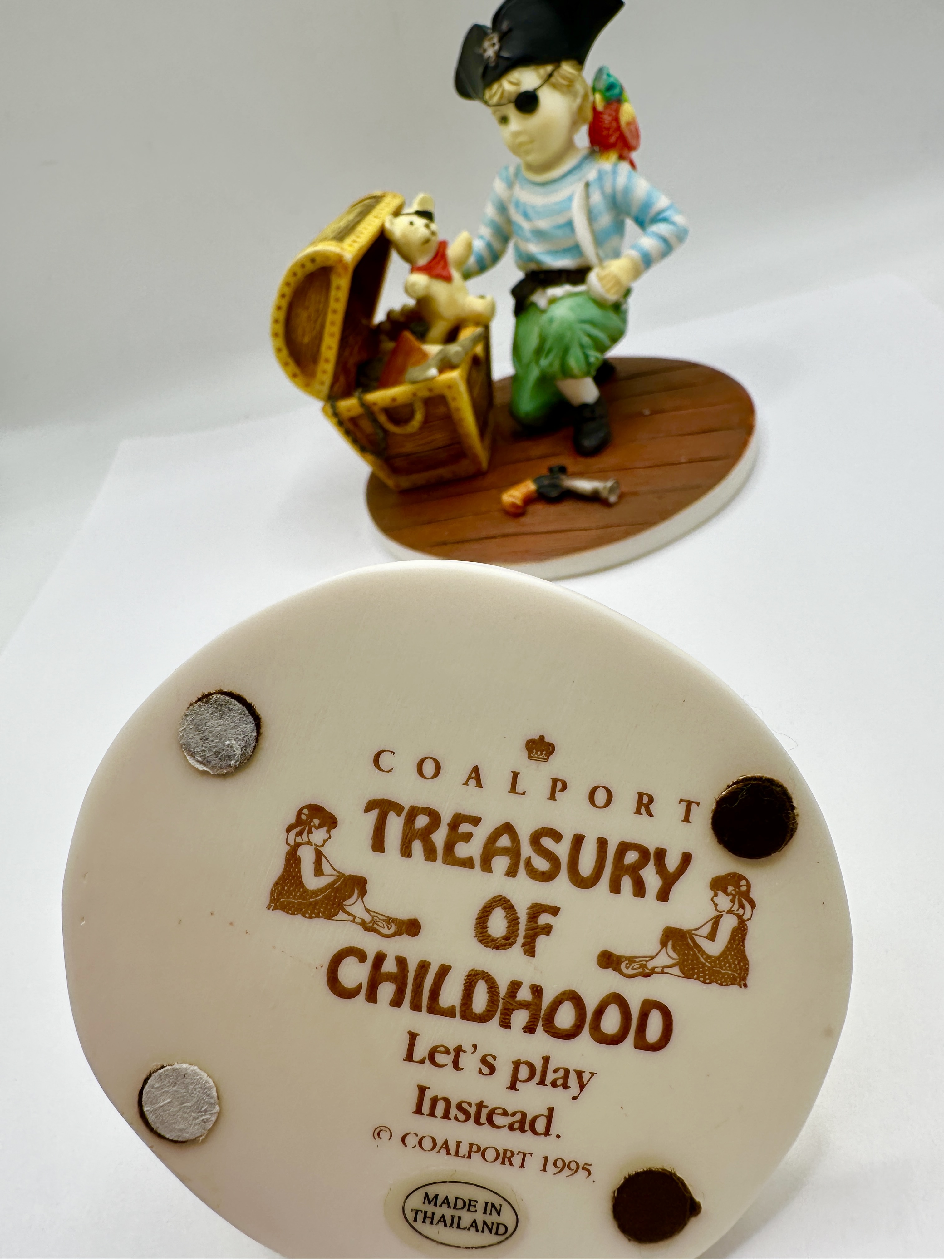 A pair of polychrome painted figurines from the Coalport Treasury of Childhood series, dated 1995. The first figure, titled Let’s play Instead., depicts a seated boy in a green jumper and blue trousers with a dog and a stack of books. The second figure, identified as Teddy’s Treasure, features a boy in pirate attire including a tricorn hat, eye patch, and parrot, kneeling beside a treasure chest containing a teddy bear. Both figures are mounted on circular bases with textured finishes. The underside of the Let’s play Instead. piece bears the Coalport manufacturer’s mark, the series title, the individual piece name, and a copyright date of 1995. A Made in Thailand sticker is also present.