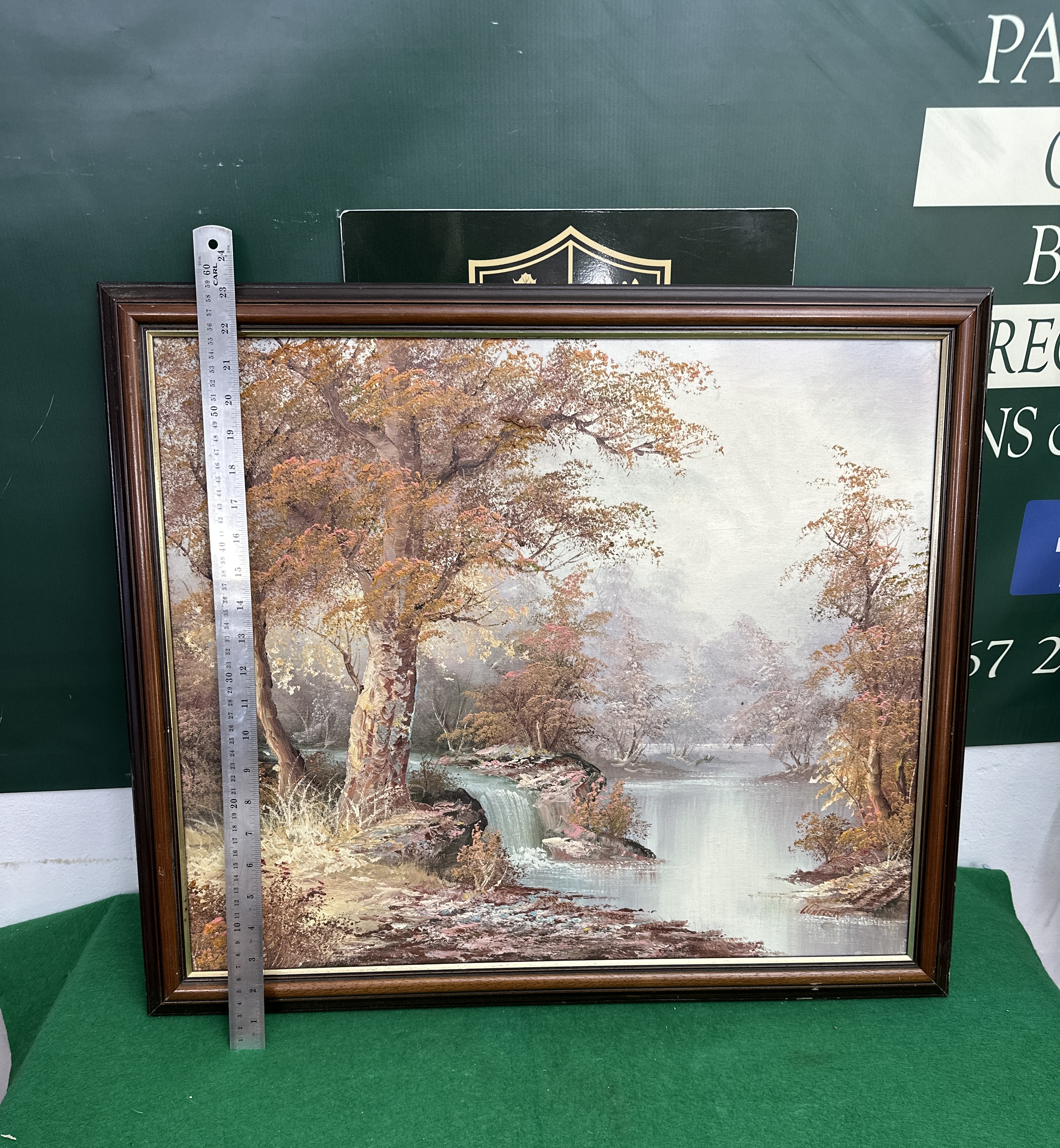 An oil on canvas landscape painting depicting an atmospheric autumnal scene. The composition features a river and a small waterfall set amongst trees with orange and brown foliage, all positioned against a misty background. The work is signed in red in the lower-right corner G. Carson. The painting is housed in a dark-toned wood frame featuring a gilded inner lip. The application of paint includes textured impasto highlights to the foliage and water.