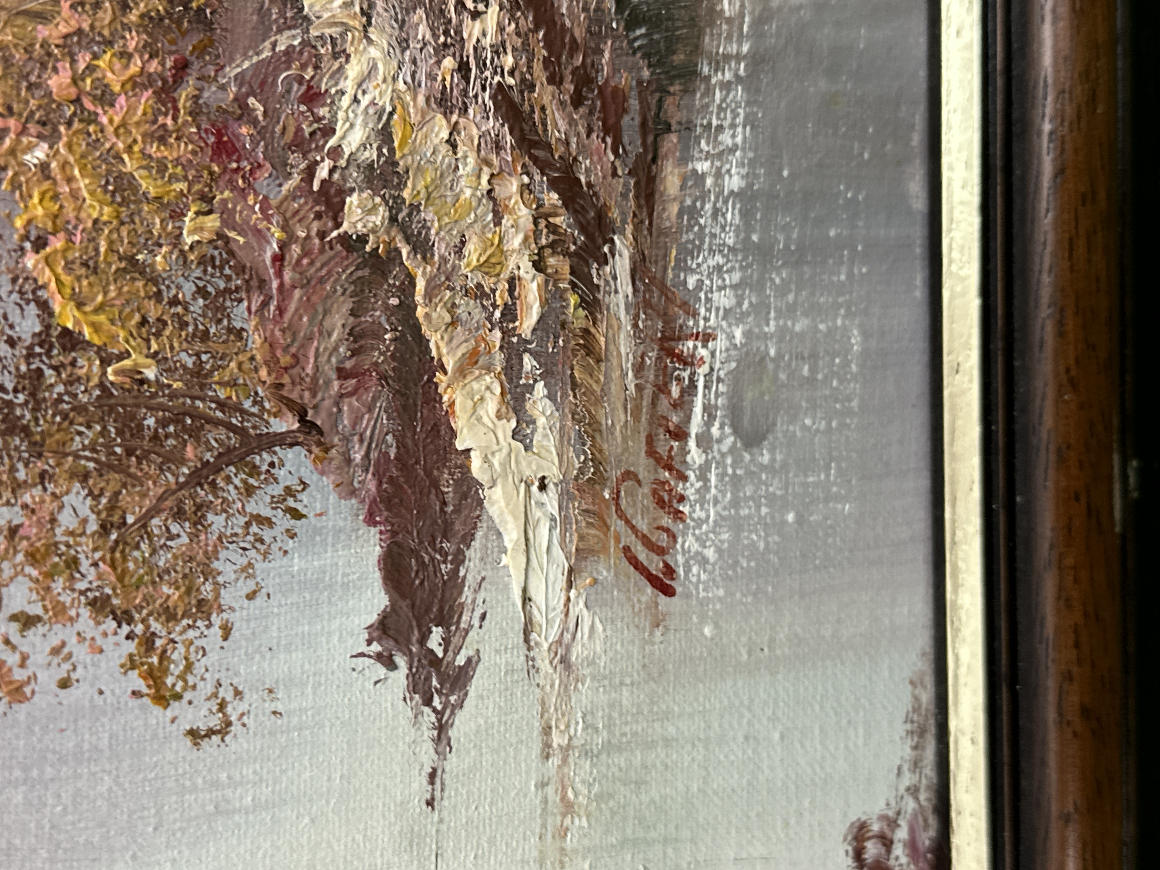 The work is in good overall condition. The frame shows minor shelf wear and light surface abrasions. The canvas and paint surface appear stable with no visible signs of restoration or loss.