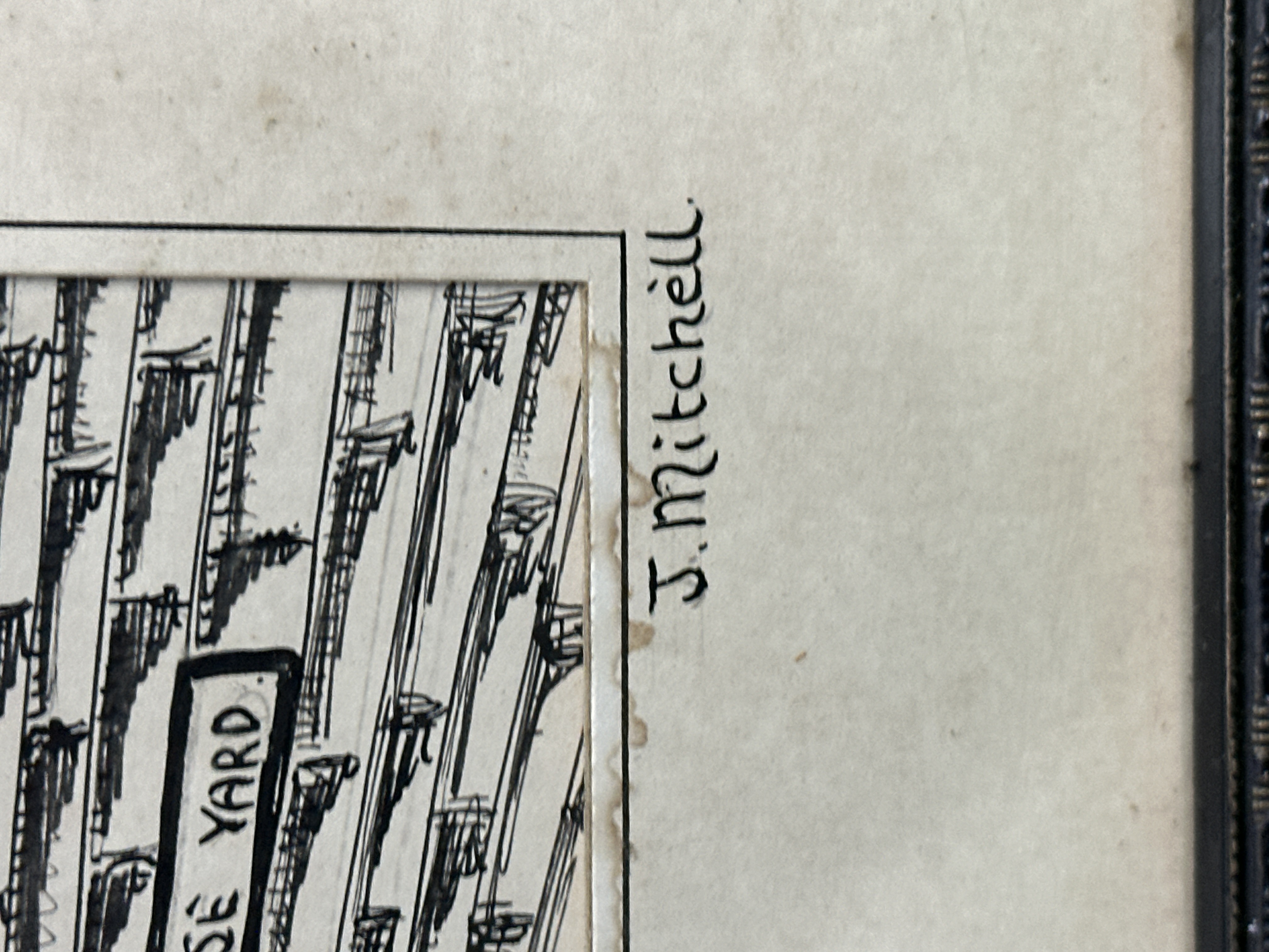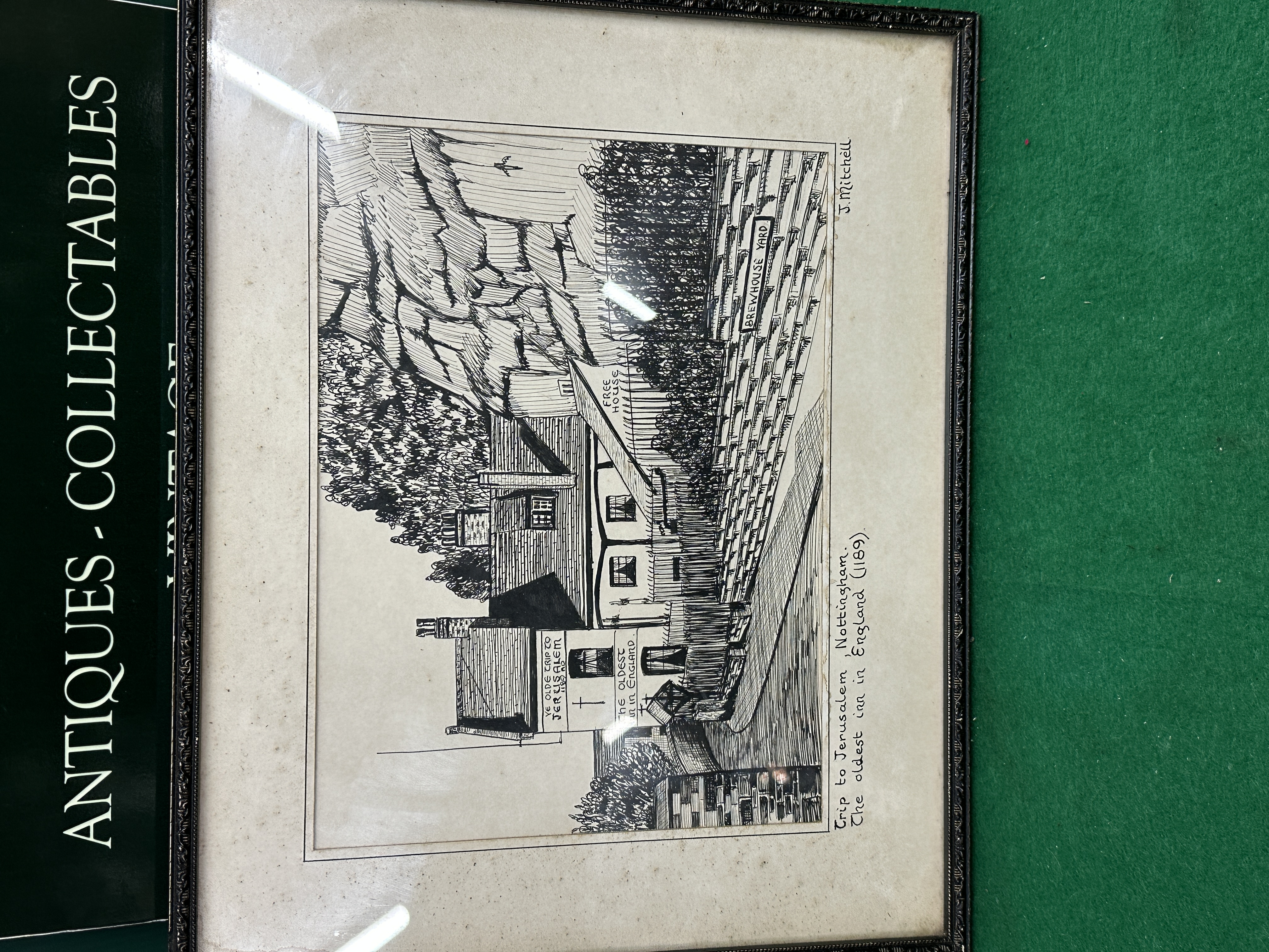 A 20th-century pen and ink architectural illustration by J. Mitchell, depicting the historic public house Ye Olde Trip to Jerusalem in Nottingham. The monochrome composition features the inn situated against the Castle Rock face, incorporating hand-lettered signage for Brewhouse Yard and Free House. The work is captioned to the lower left Trip to Jerusalem Nottingham. The oldest inn in England (1189) and is signed J. Mitchell to the lower right. The illustration is housed in a dark, decoratively moulded frame under glass.