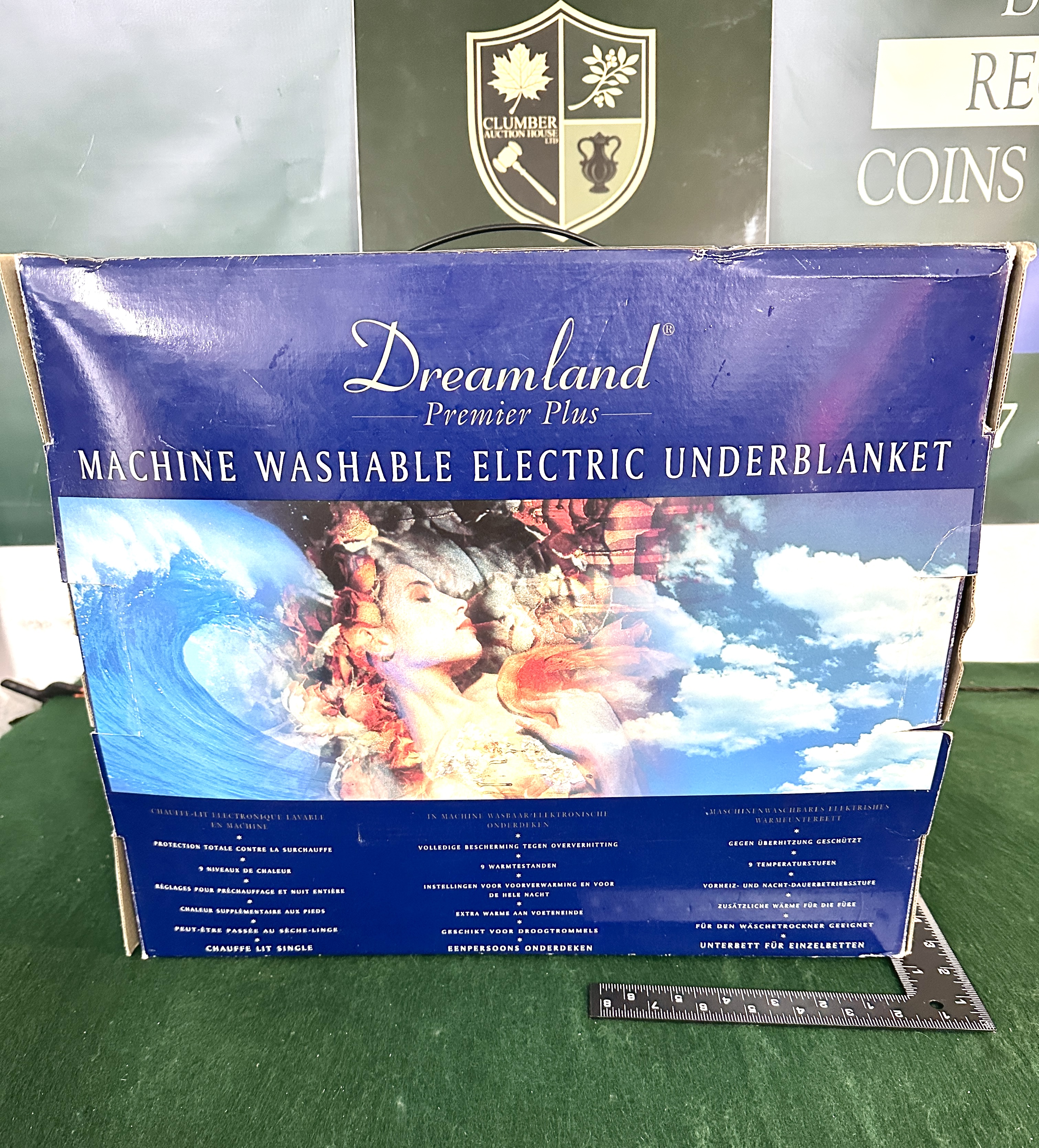 A Dreamland Premier Plus electric underblanket for a single bed, presented in its original multi-language retail packaging. The unit features nine heat settings, electronic control with preheat and all-night functions, total overheat protection, and extra foot warmth. The manufacturer states the item is machine washable and tumble dryer safe. The box includes technical specifications in English, French, Dutch, and German.