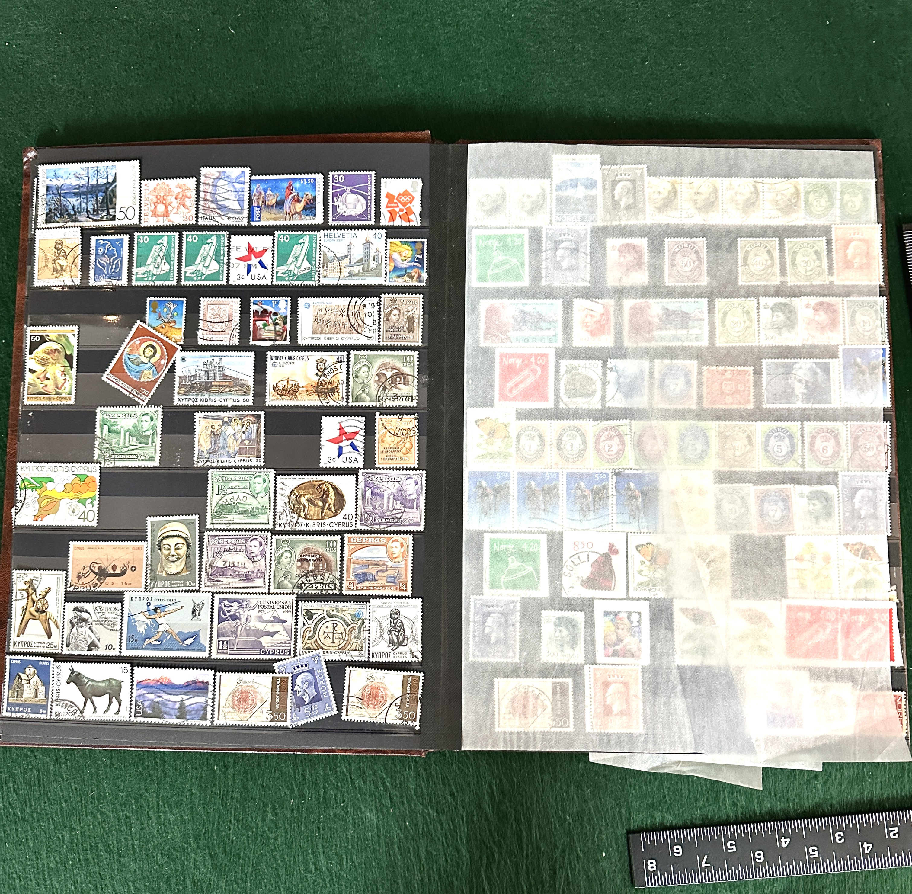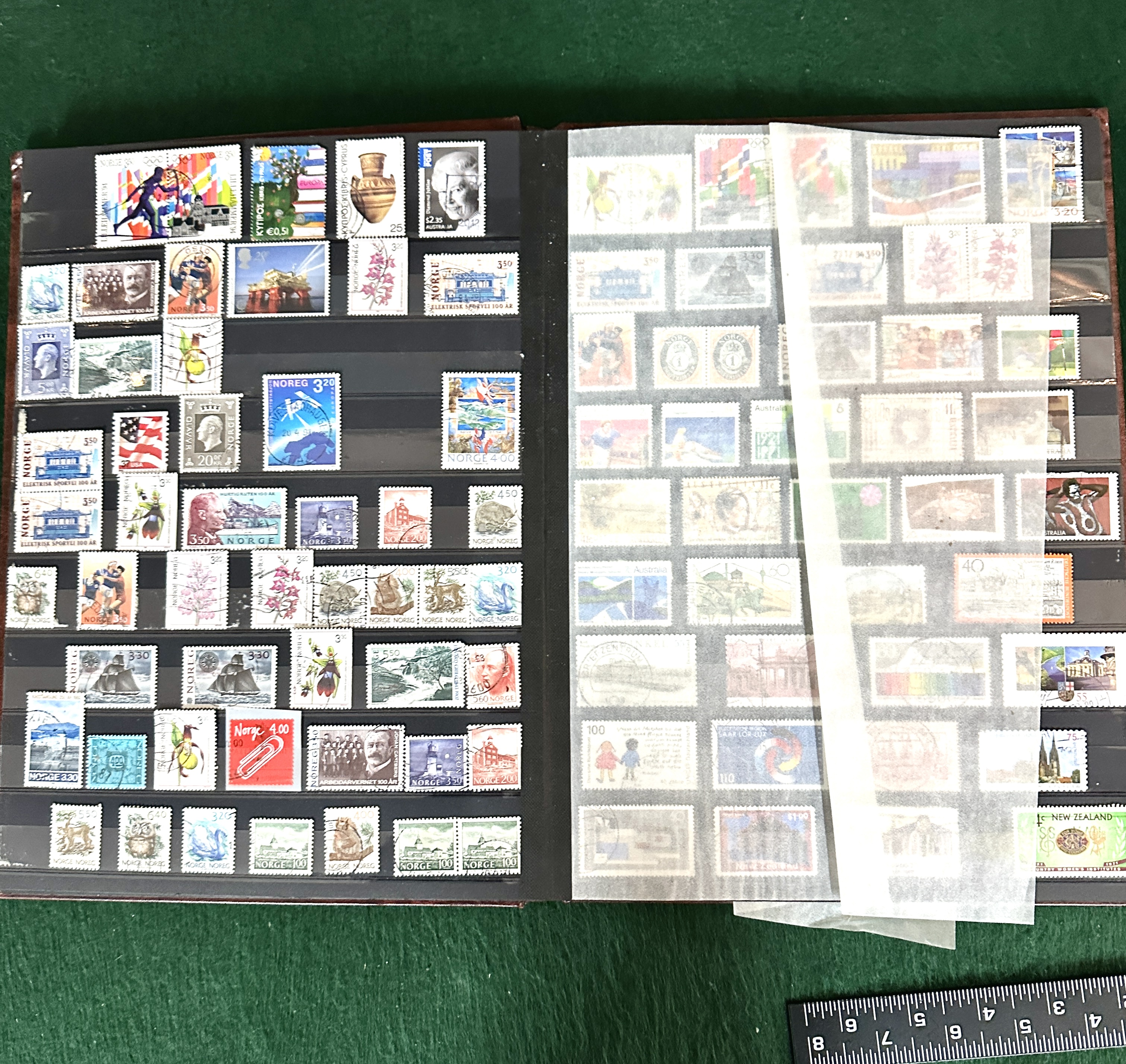 The collection appears to be in generally good condition. Some stamps exhibit standard postal cancellations. The stock book and glassine interleaving show minor wear consistent with handling.