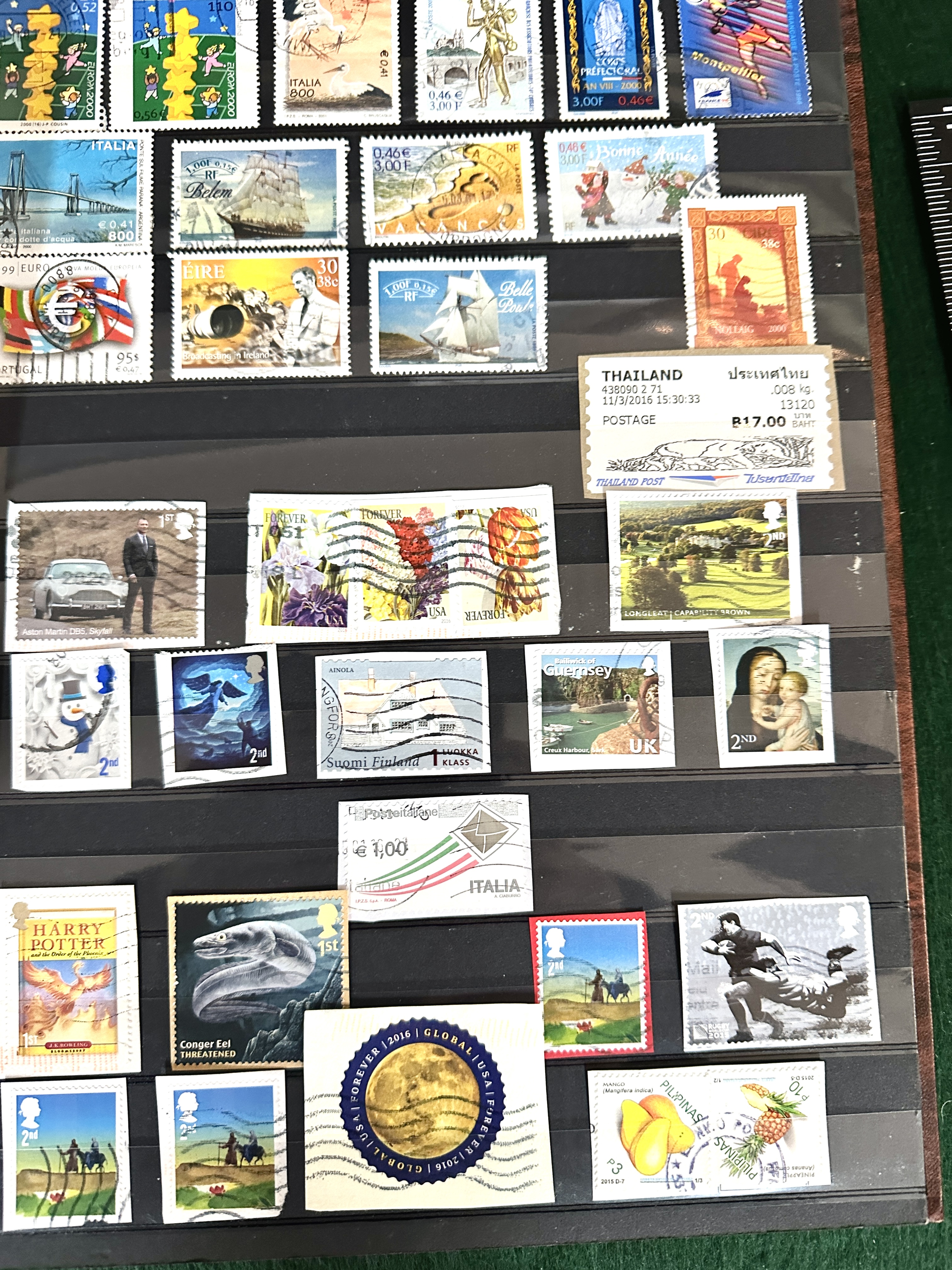 An assortment of international postage stamps dating primarily from the 20th and 21st centuries. The collection is housed within a black-paged stock book featuring protective glassine interleaving. The stamps represent a wide geographical range, including issues from Cyprus, Norway, Australia, the United Kingdom, the United States, Italy, Thailand, and the Philippines. The subject matter is diverse, encompassing royal portraits, historical figures, landscapes, maritime scenes, and botanical studies. Notable contemporary issues include themes related to Harry Potter and James Bond. The lot contains a mix of used examples with visible postal cancellations and stamps in apparently mint condition.
