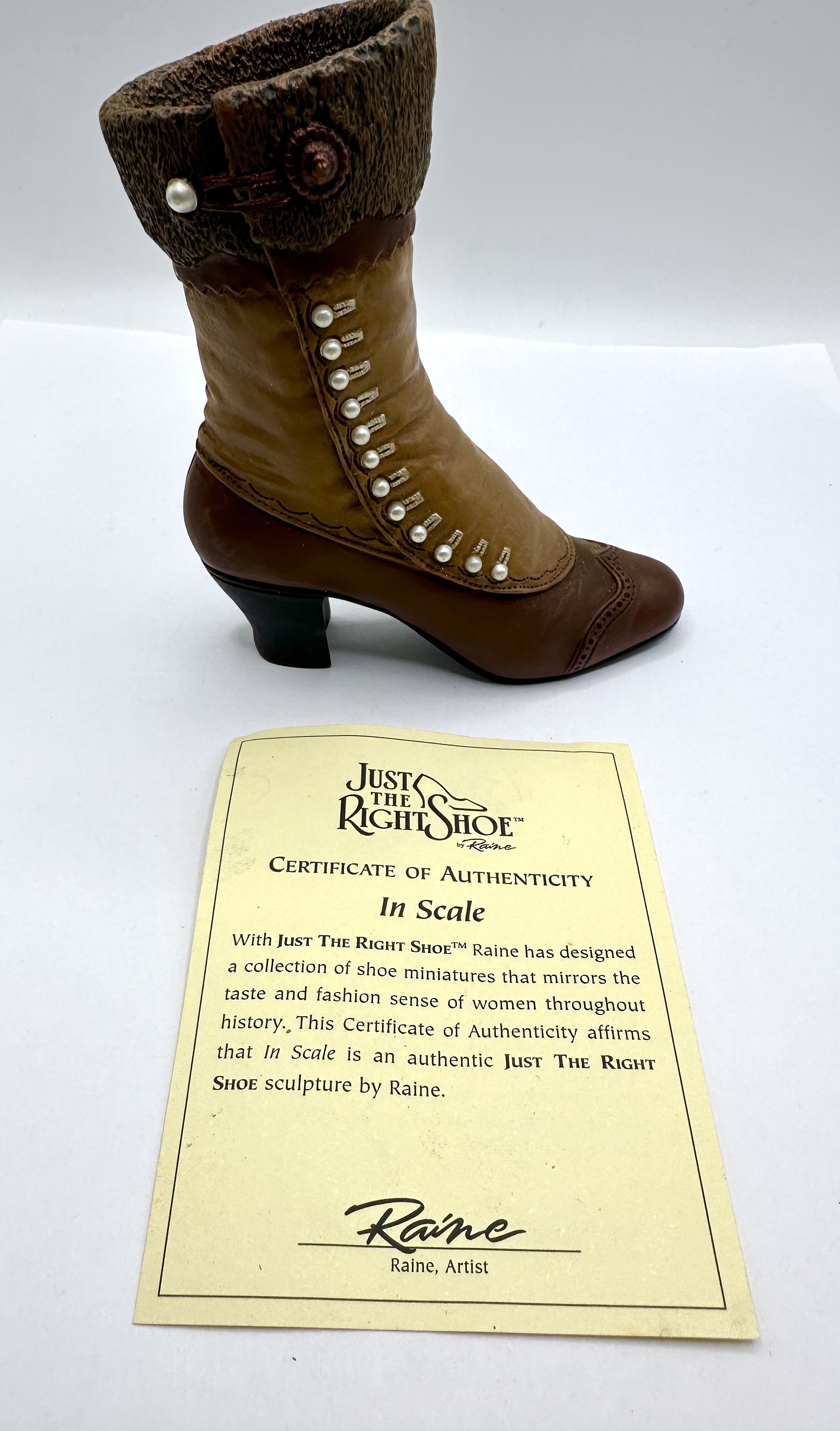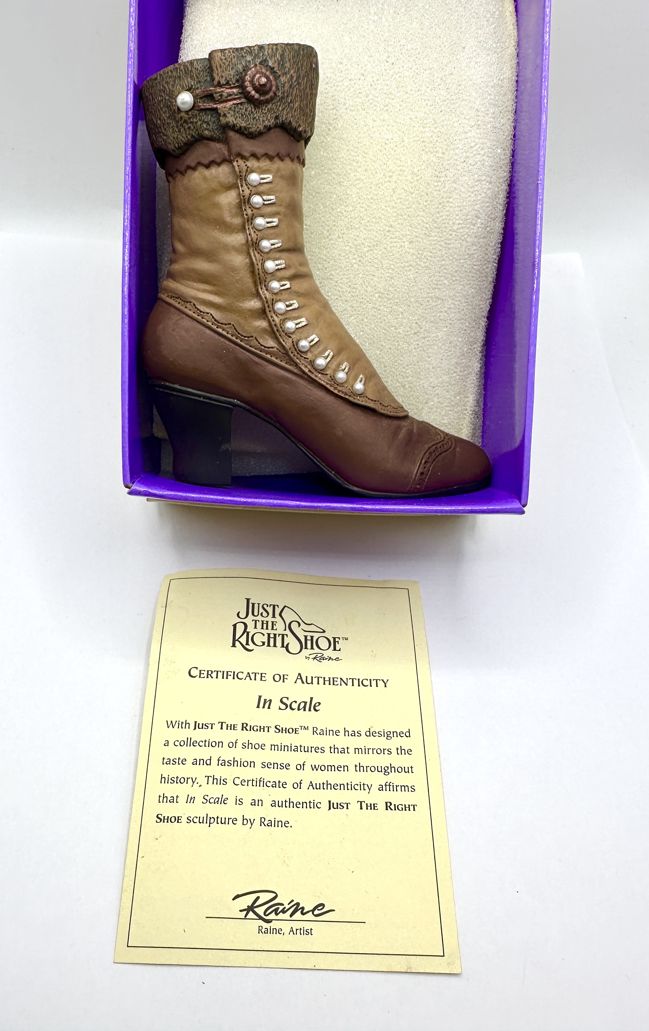 A Just the Right Shoe miniature sculpture titled In Scale, designed by the artist Raine for Willitts Design. The piece is modelled as a Victorian-style high button boot featuring a two-toned brown finish. The sculpture includes a decorative line of faux-pearl buttons and a textured, fur-effect cuff adorned with a single large button and pearl. The design incorporates perforated brogue-style detailing to the toe and heel. This lot includes the original purple branded box with protective foam padding and the corresponding Certificate of Authenticity.