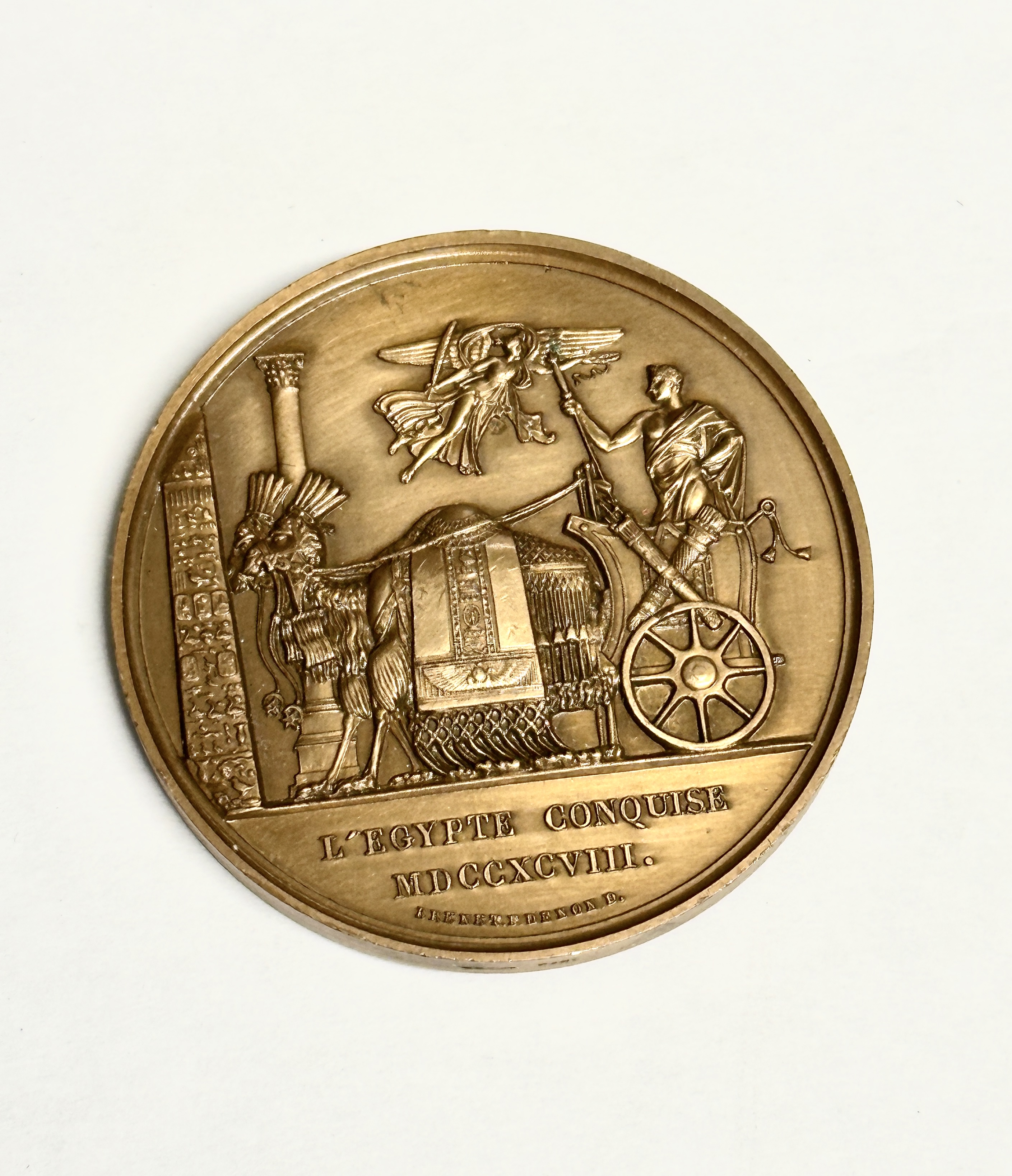 A French bronze commemorative medal celebrating the conquest of Egypt in 1798. The obverse features a high-relief profile bust of a young Napoleon Bonaparte, signed along the lower edge J. JOUANNIN F. DENON D. The reverse displays an intricate allegorical scene showing a figure in a chariot drawn by two crocodiles passing an Egyptian obelisk and a classical column, with a winged Victory figure above. The reverse is inscribed L’EGYPTE CONQUISE above the date MDCCXCVIII in Roman numerals. The lower rim is signed BRENET F. DENON D. The medal is struck in bronze with a rich, even patina.