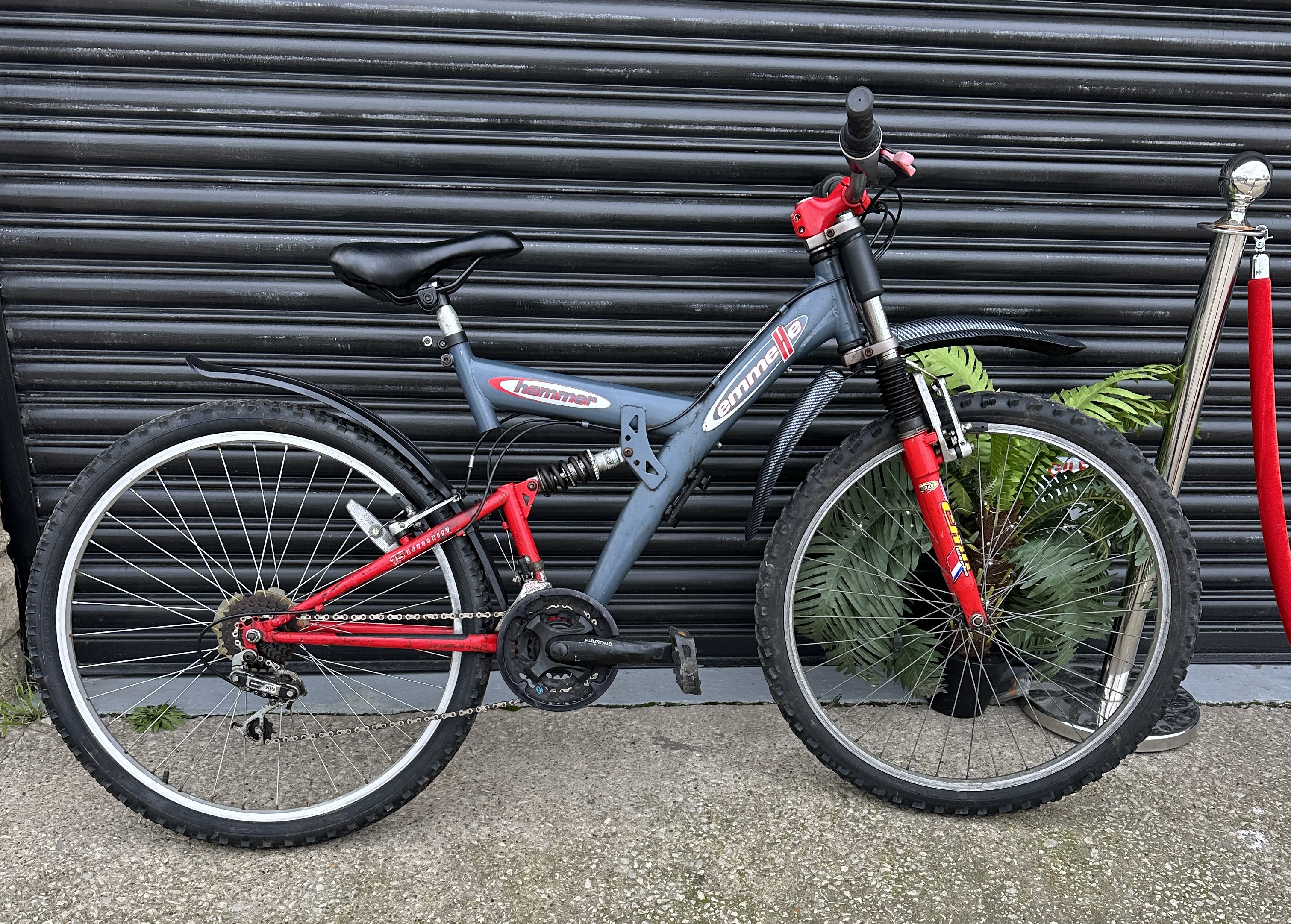 An Apollo Outrage full-suspension mountain bike featuring a grey and red metal frame with Emmelle Hammer decals. The bicycle is equipped with Shimano SIS front and rear derailleurs, a multi-speed cassette, and a front suspension fork marked Chill Works. Additional components include a DNM rear coil shock, front and rear mudguards with a carbon-fibre pattern, a black synthetic saddle, and knobby tyres on silver-toned rims.