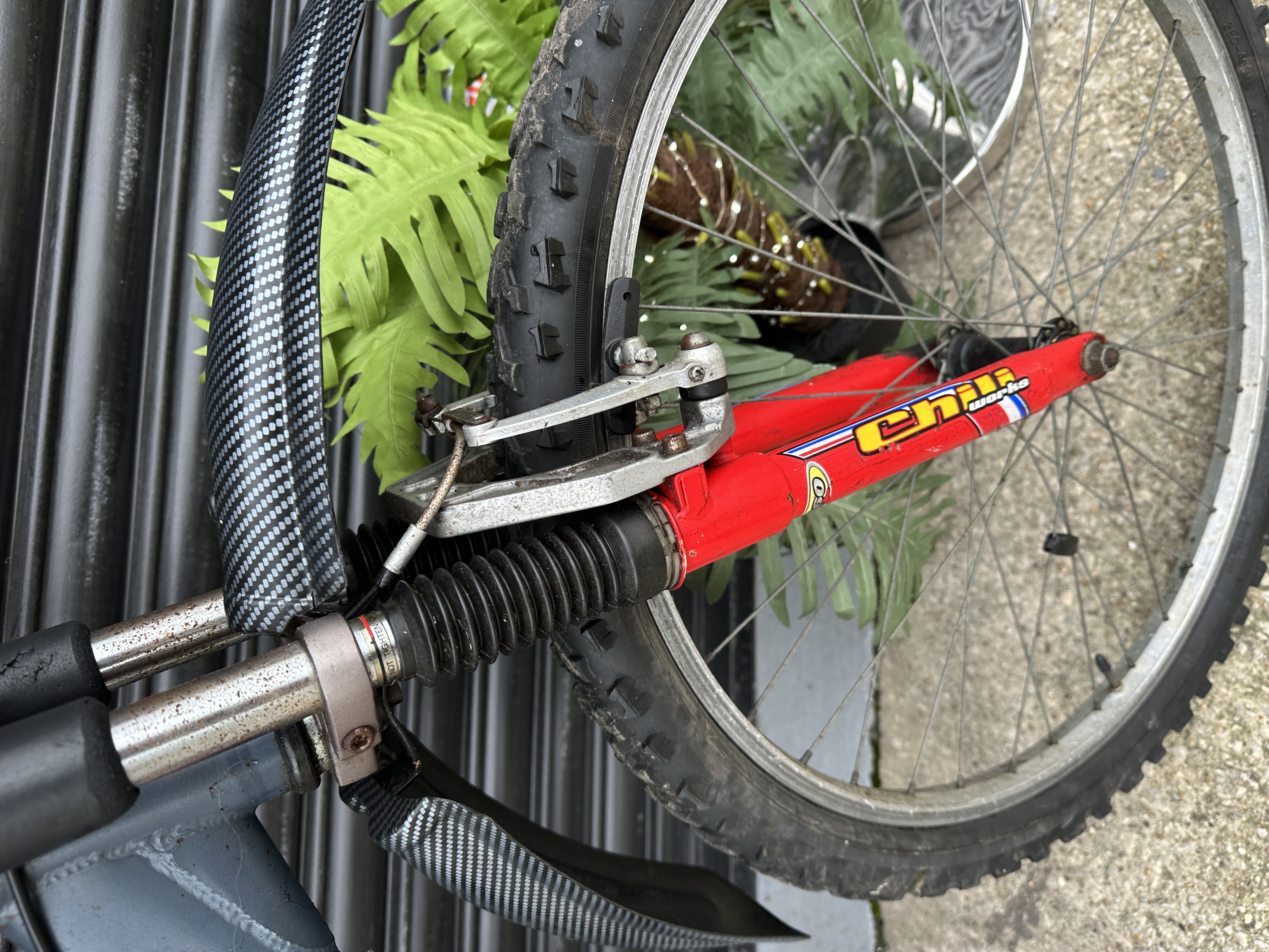 The bicycle shows signs of use with visible dirt and minor surface corrosion on the mechanical parts and hardware. Surface oxidation is visible on the multi-speed cassette.