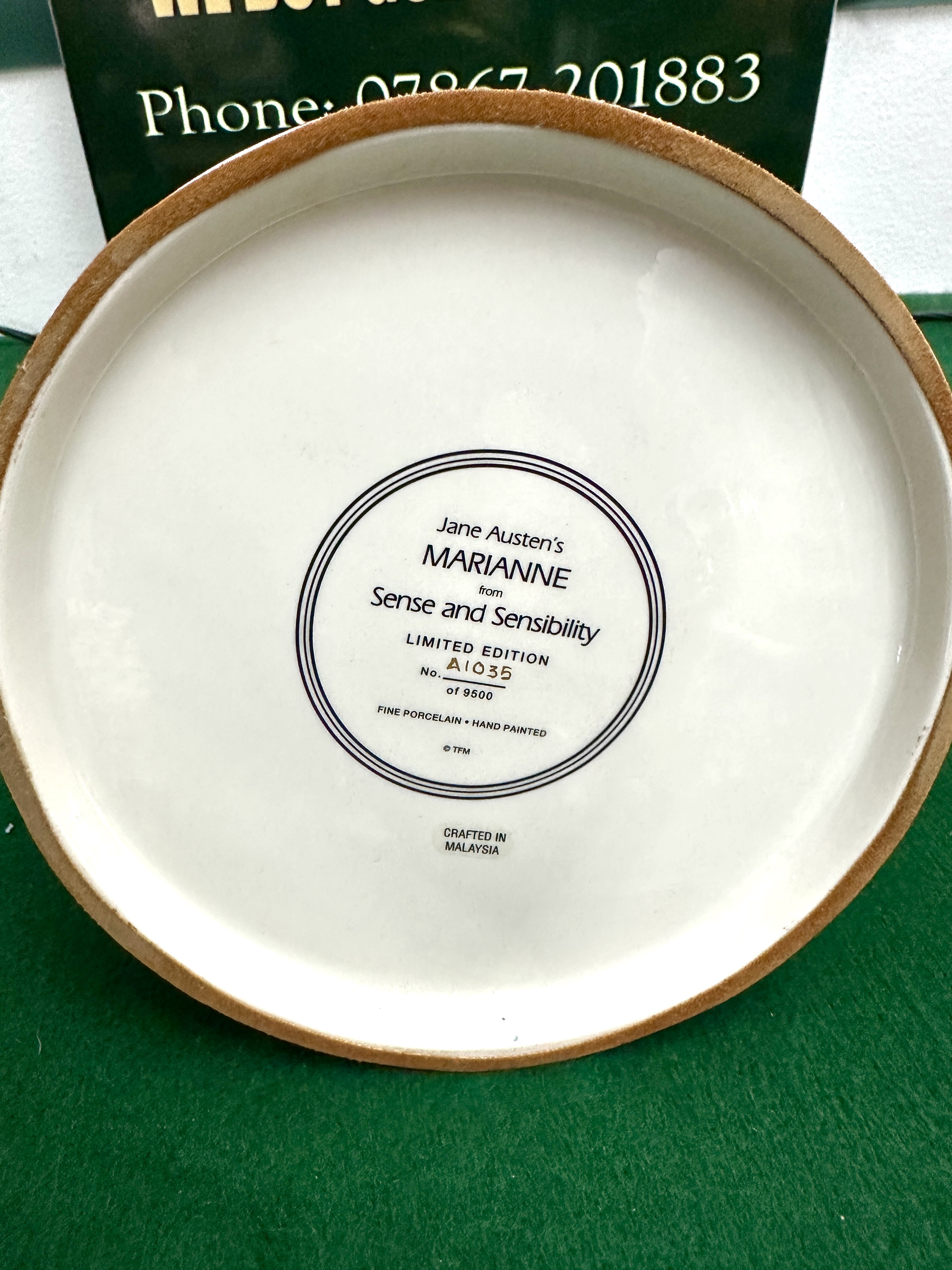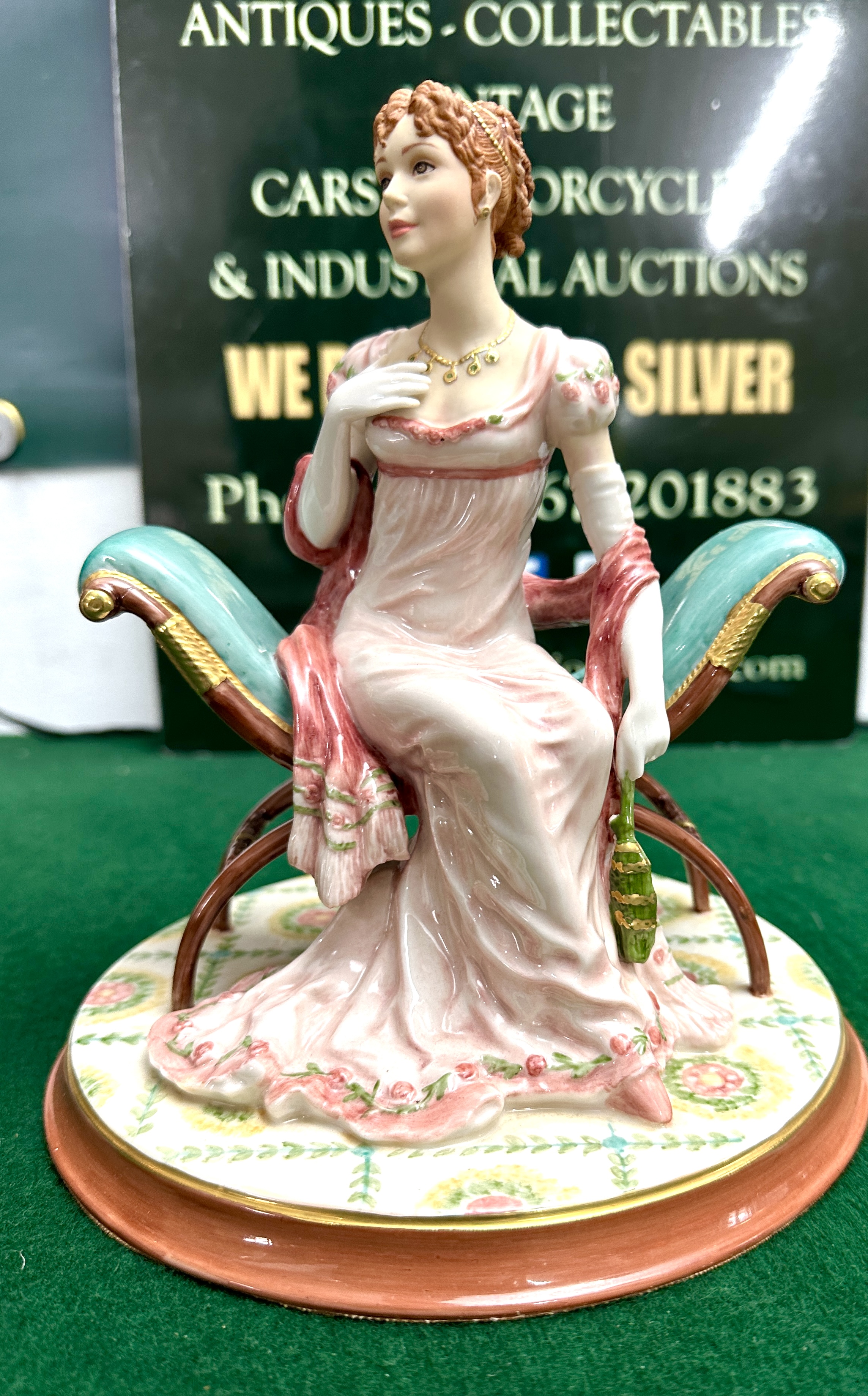 A Franklin Mint hand-painted fine porcelain figurine titled Jane Austen’s Marianne from Sense and Sensibility. The figure depicts a woman in Regency-period dress seated on a turquoise and gold-gilded curule-style bench. She is modelled in a pale pink gown featuring a rose-patterned hem and shawl, wearing long white evening gloves and a gold-tone necklace while holding a green reticule. The figure is mounted on a circular base decorated with a floral rug motif and a terracotta-coloured border. The underside of the base is marked with the title, the TFM copyright, and the limited edition number A1035 of 9500. The piece is noted as being crafted in Malaysia.
