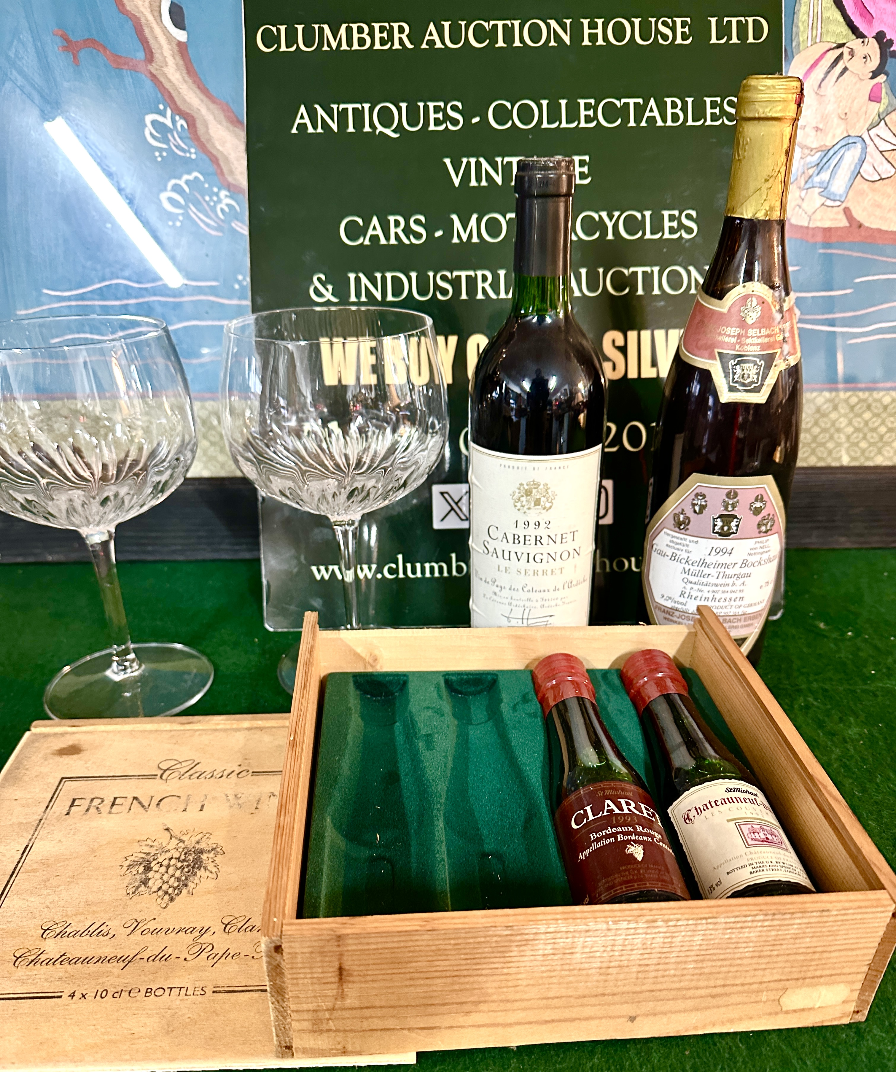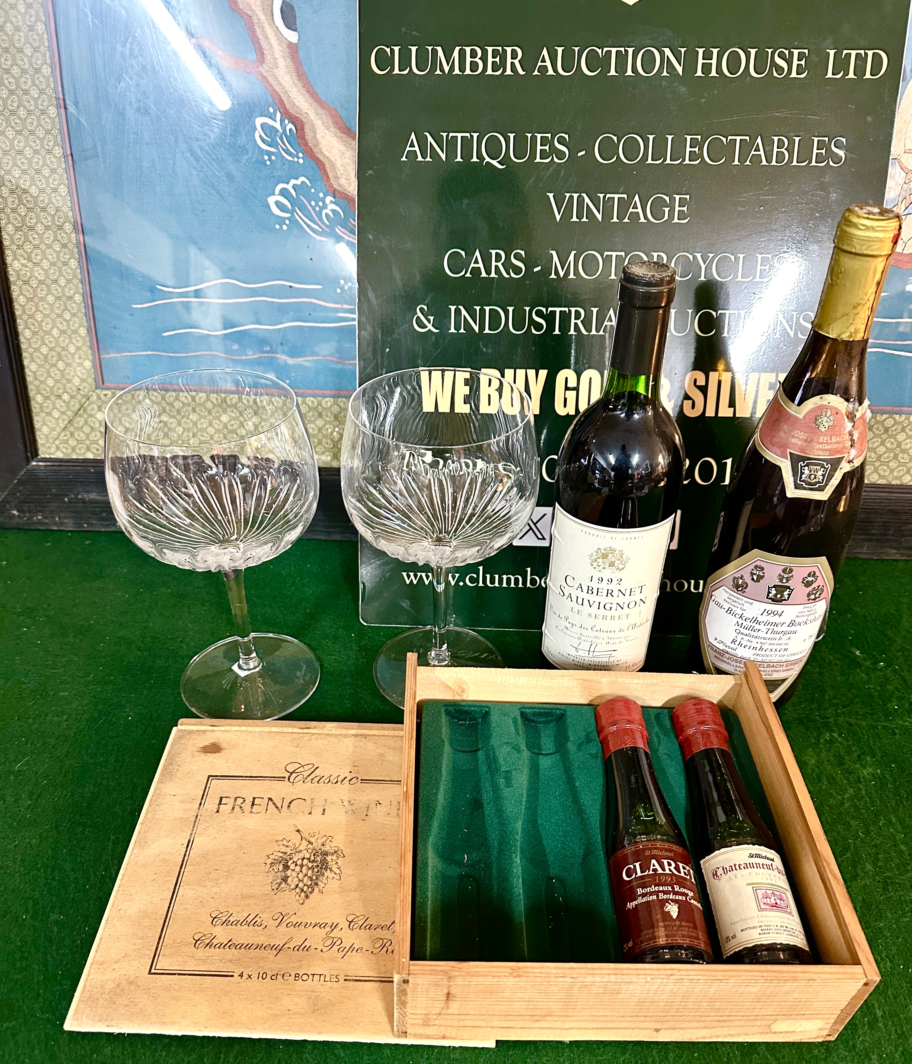 A collection of vintage wines and associated glassware. The lot includes two full-sized bottles comprising a 1992 Le Serret Cabernet Sauvignon, Vin de Pays des Coteaux de l’Ardèche, and a 1994 Gau-Bickelheimer Bockshaut Müller-Thurgau, Rheinhessen, Germany. Also included is a wooden presentation box for Classic French Wines, containing two 10cl miniature bottles of St Michael (Marks & Spencer) branded wine, specifically a 1993 Claret and a Chateauneuf-du-Pape. The wooden case features a green felt-lined interior with two vacant slots. The lot is completed by two balloon-style wine glasses, each decorated with a radiating cut-glass pattern to the bowl.