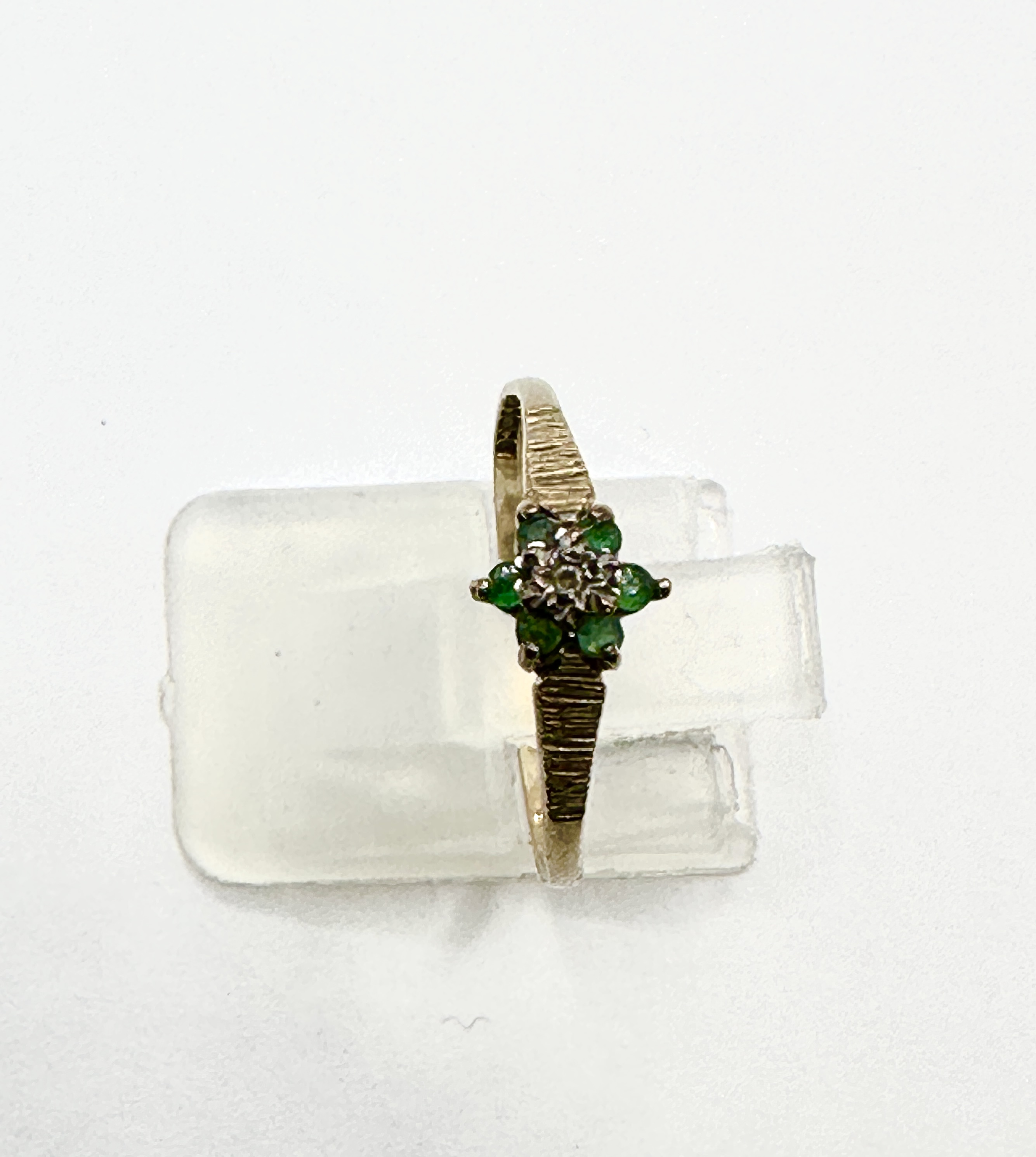 A 9k yellow gold ring featuring a floral cluster head. The central circular clear stone is encircled by six round-cut emeralds. The setting is mounted on a 9k yellow gold band with the shoulders exhibiting a textured bark-effect finish. No hallmarks are visible.