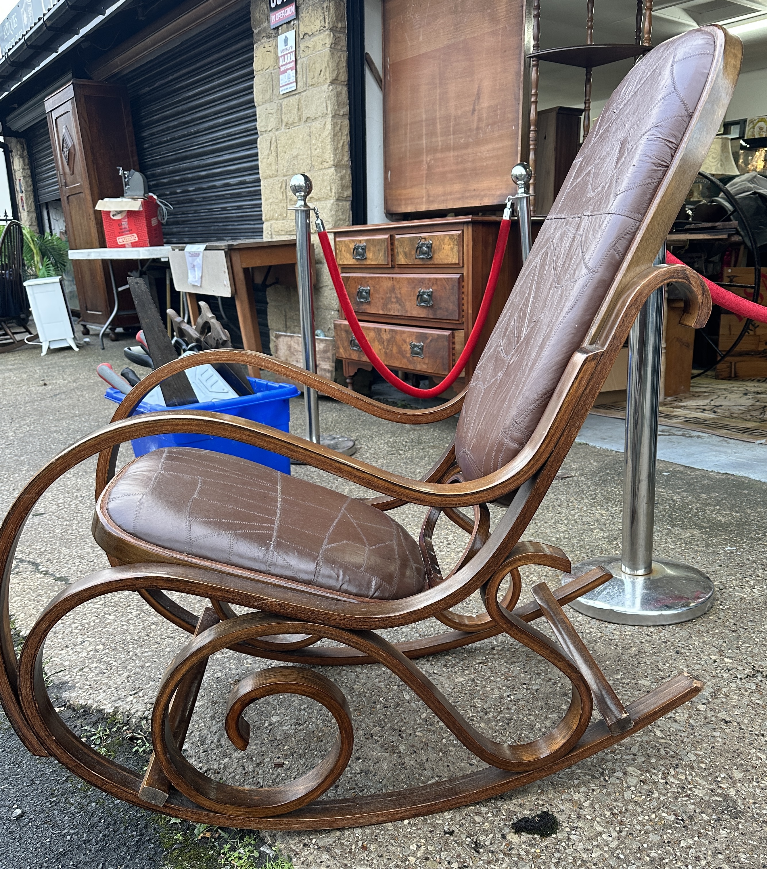 A bentwood rocking chair designed by Luigi Crassevig, dating to the 1970s. The piece features a dark-stained wooden frame constructed with characteristic steam-bent curves and intricate scrollwork details to the side supports. The chair is fitted with a padded backrest and seat, upholstered in a brown leather-effect material that displays a decorative stitched patchwork pattern. The design incorporates sweeping armrests that transition into the circular scroll elements of the base. No maker’s marks are visible on the exterior of the piece.