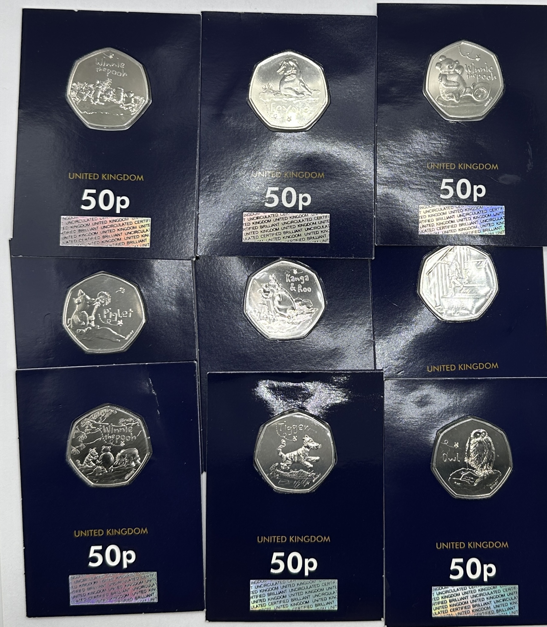 A collection of Royal Mint United Kingdom 50p coins from the Winnie the Pooh series. Each heptagonal cupro-nickel coin features a reverse design depicting characters and scenes from the classic A.A. Milne stories, including Winnie the Pooh, Eeyore, Piglet, Tigger, Owl, and Kanga and Roo. The coins are struck to a Brilliant Uncirculated finish. Each coin is presented in its original dark blue display card printed with United Kingdom 50p and features a holographic Brilliant Uncirculated security strip at the base.
