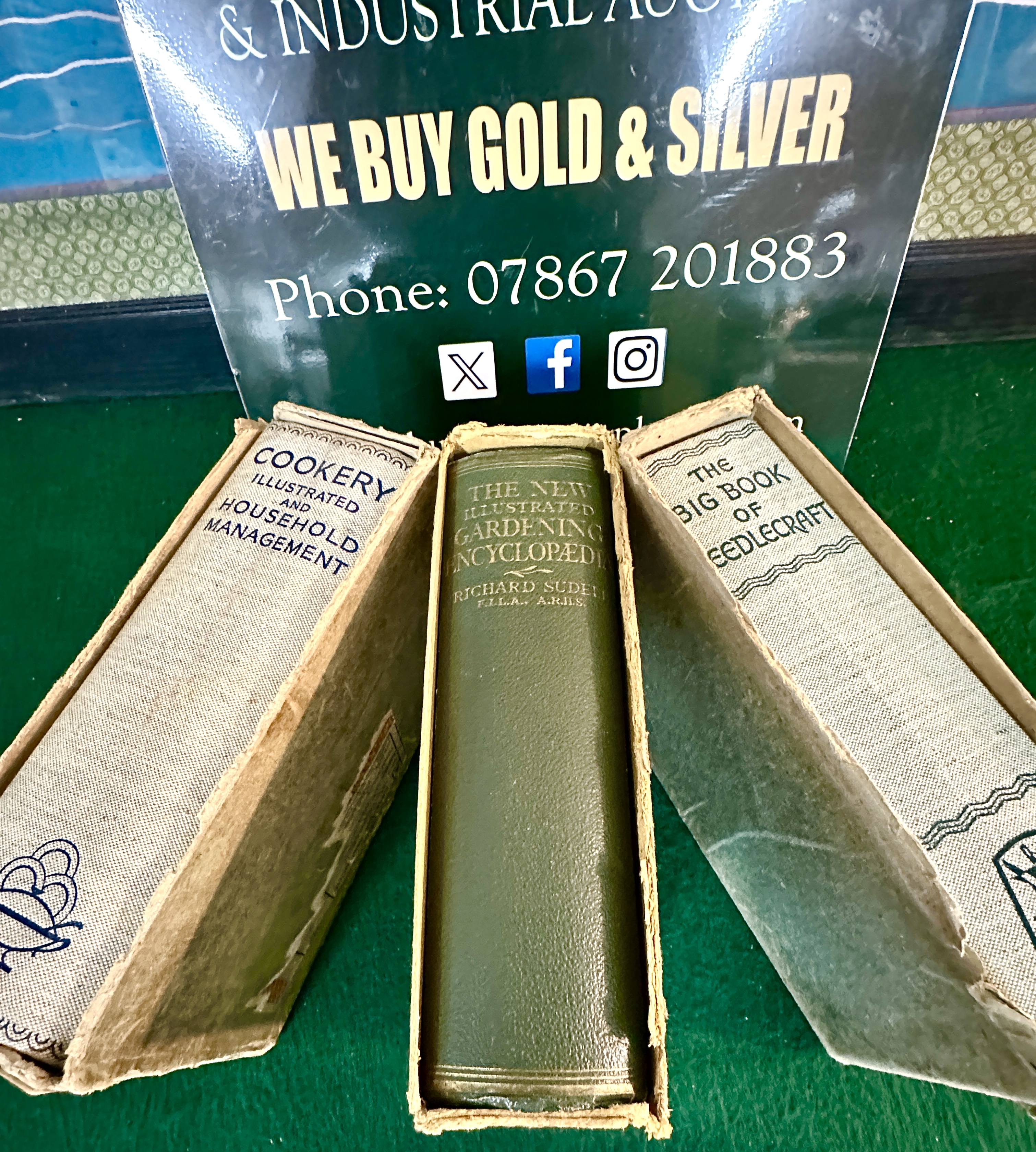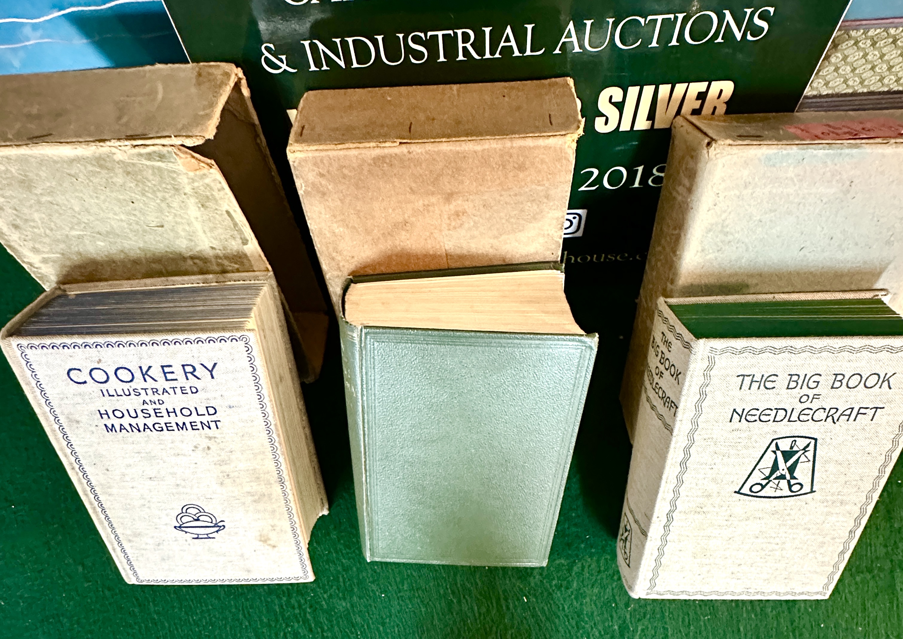 A trio of vintage household instructional volumes. The collection includes Cookery Illustrated and Household Management, The New Illustrated Gardening Encyclopaedia by Richard Sudell, and The Big Book of Needlecraft. Two volumes are bound in illustrated cream cloth featuring decorative borders and thematic logos in blue and green respectively. The gardening volume is bound in green cloth with gilt-stamped lettering on the spine. Each book is housed in its matching original brown cardboard slipcase.