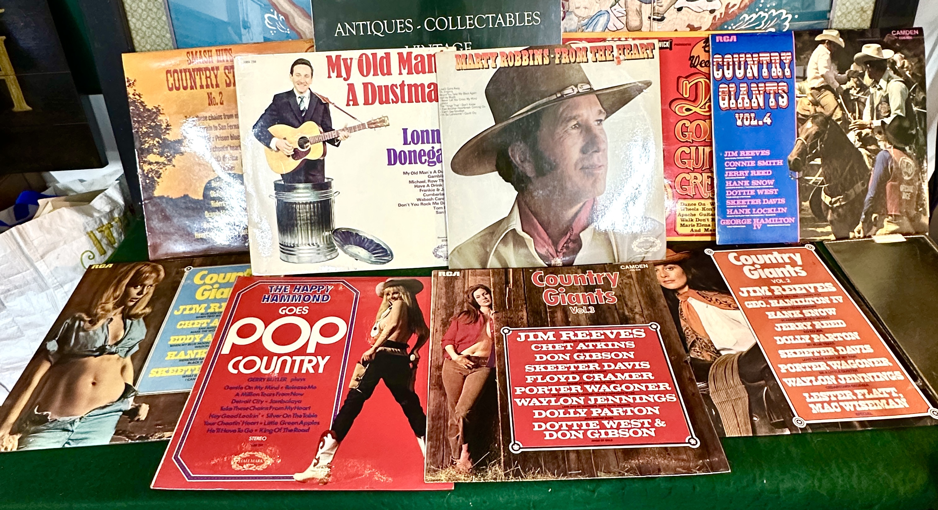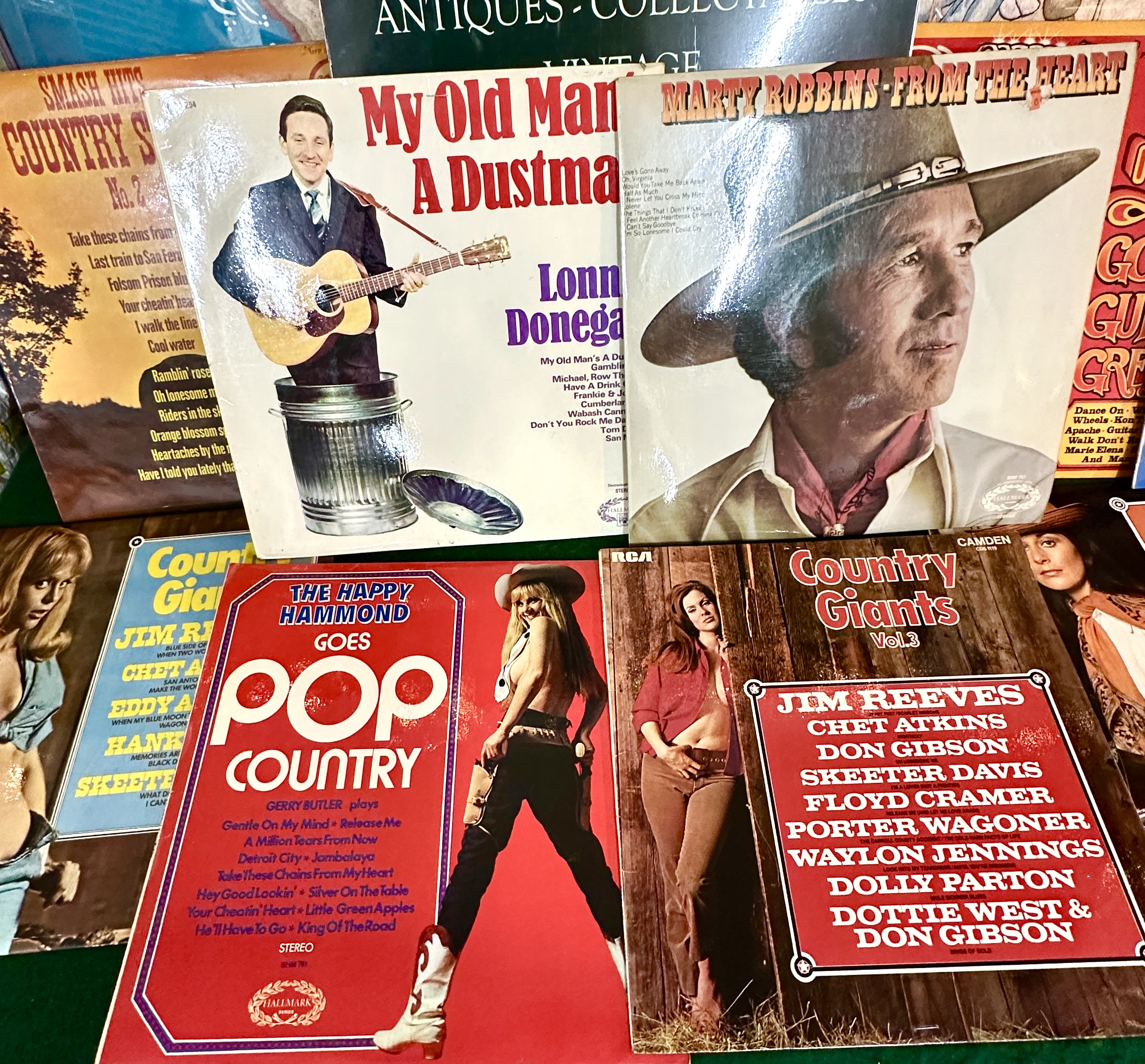 A collection of vintage vinyl LP records primarily featuring country and western music from the mid-20th century. The assortment includes various artists and compilations such as Lonnie Donegan’s My Old Man’s A Dustman, Marty Robbins’ From The Heart, and several volumes from the Country Giants series including Volume 2, Volume 3, and Volume 4. Featured artists across the collection include Jim Reeves, Chet Atkins, Dolly Parton, Waylon Jennings, Don Gibson, and Skeeter Davis. Other titles present are Smash Hits Country Style No. 2 and The Happy Hammond Goes Pop Country. The records are housed in original illustrated cardboard sleeves with labels including RCA, RCA Camden, and Hallmark.