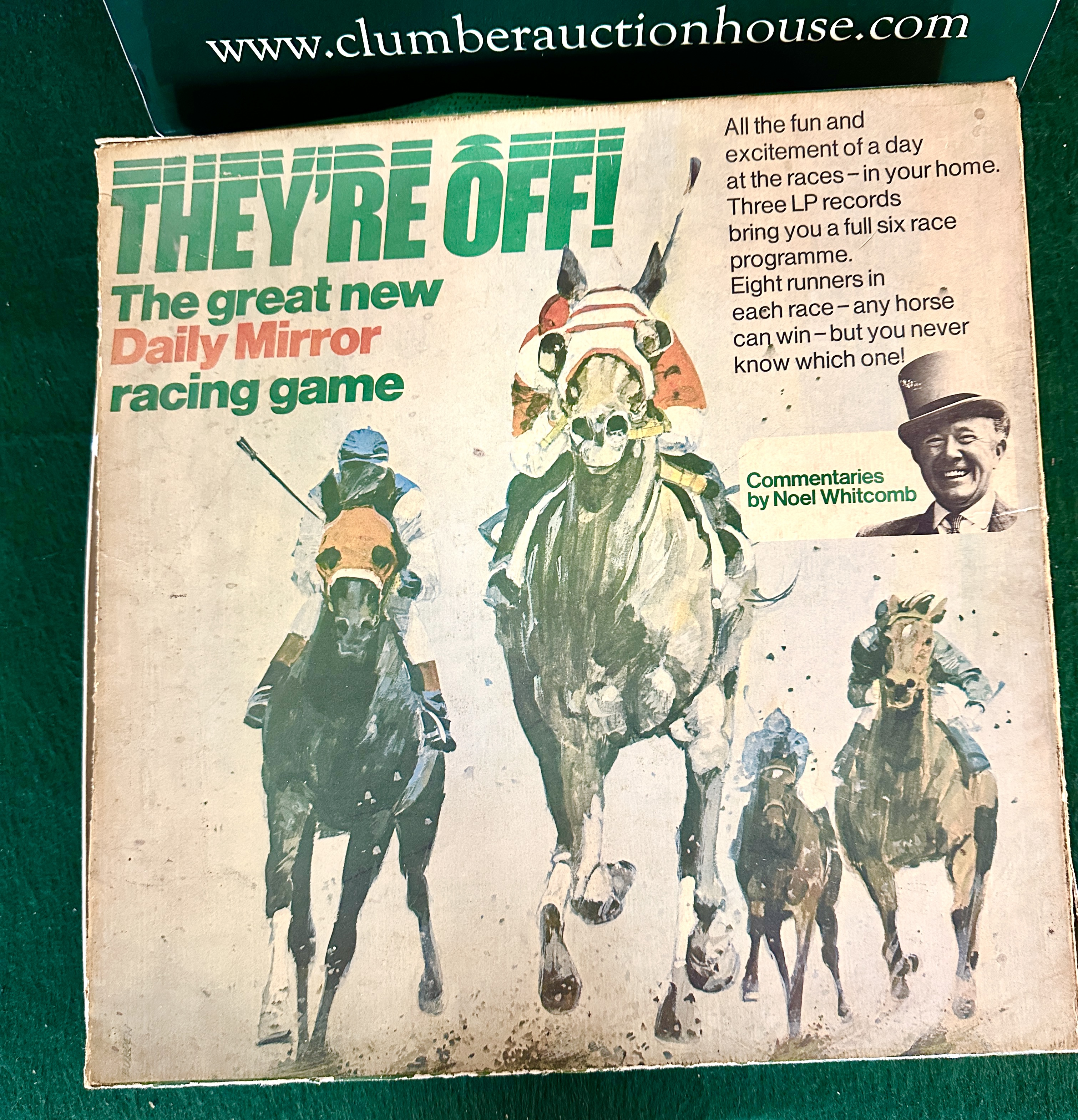 They’re Off! The Great Daily Mirror Racing Game is a mid-20th-century multimedia horse racing game designed for home use. This edition features three LP records providing race commentaries by Noel Whitcomb. The set includes an illustrated box containing a collection of paper and card components, such as Race Cards, Starting Price Odds Cards, Banker’s Records, and game currency in various denominations. The box cover depicts a dynamic scene of jockeys and horses and specifies a full six-race programme with eight runners per race.