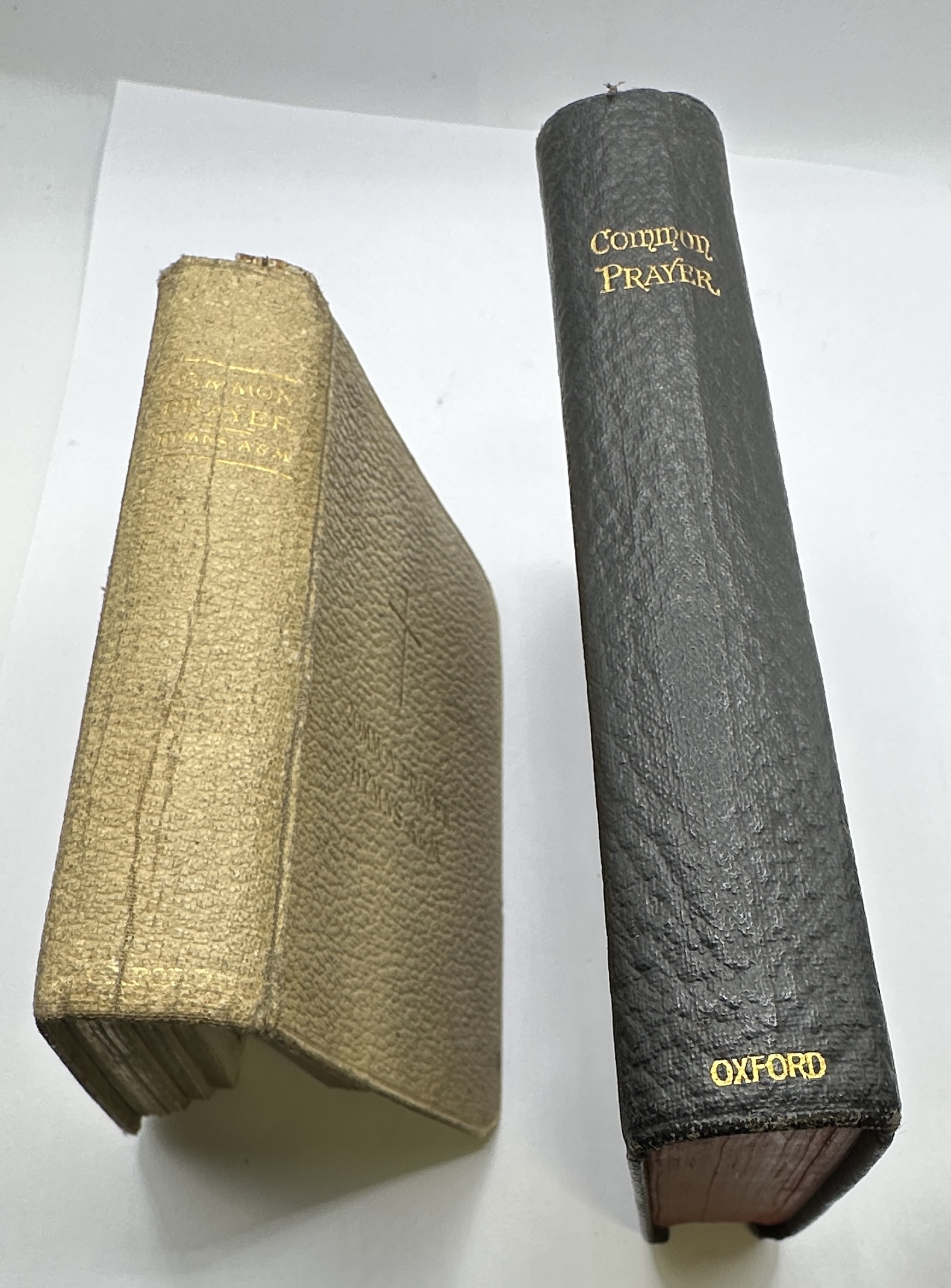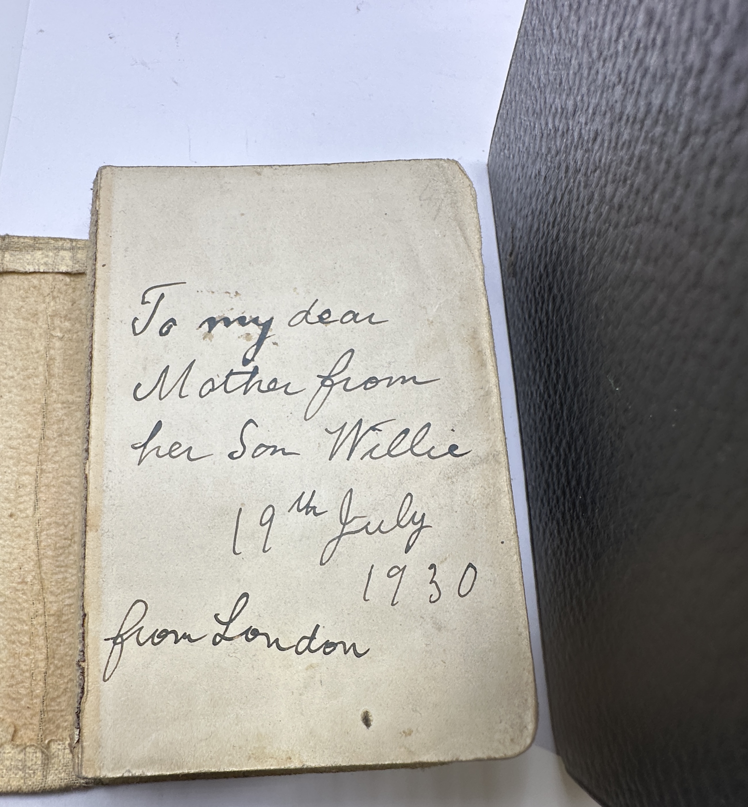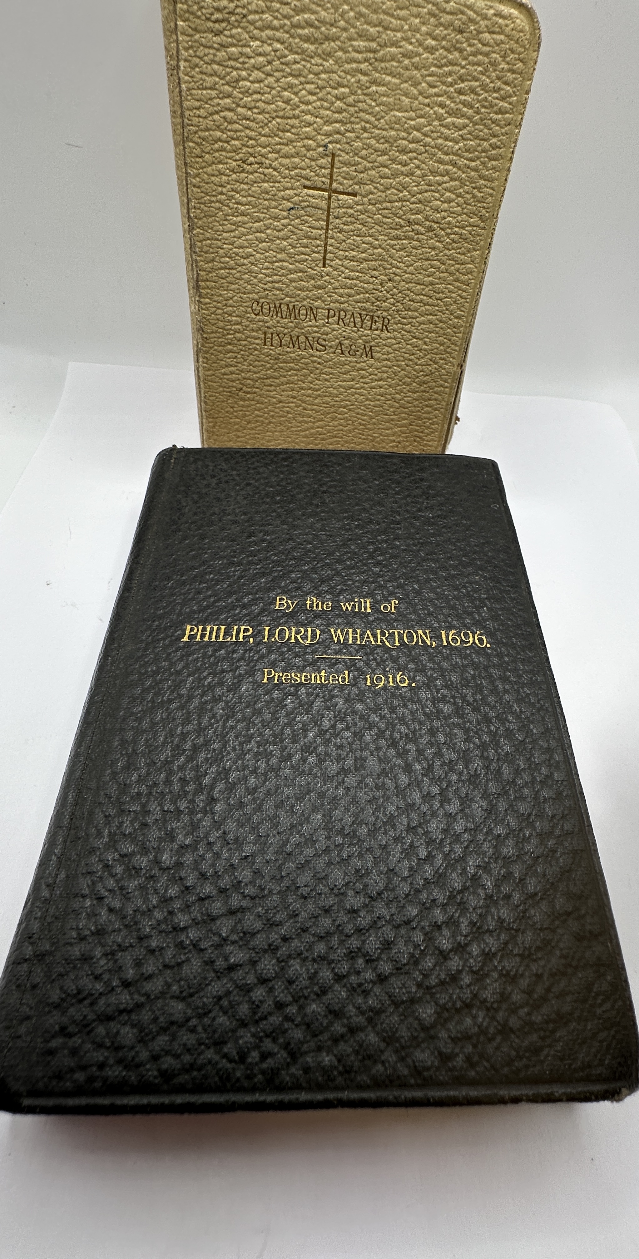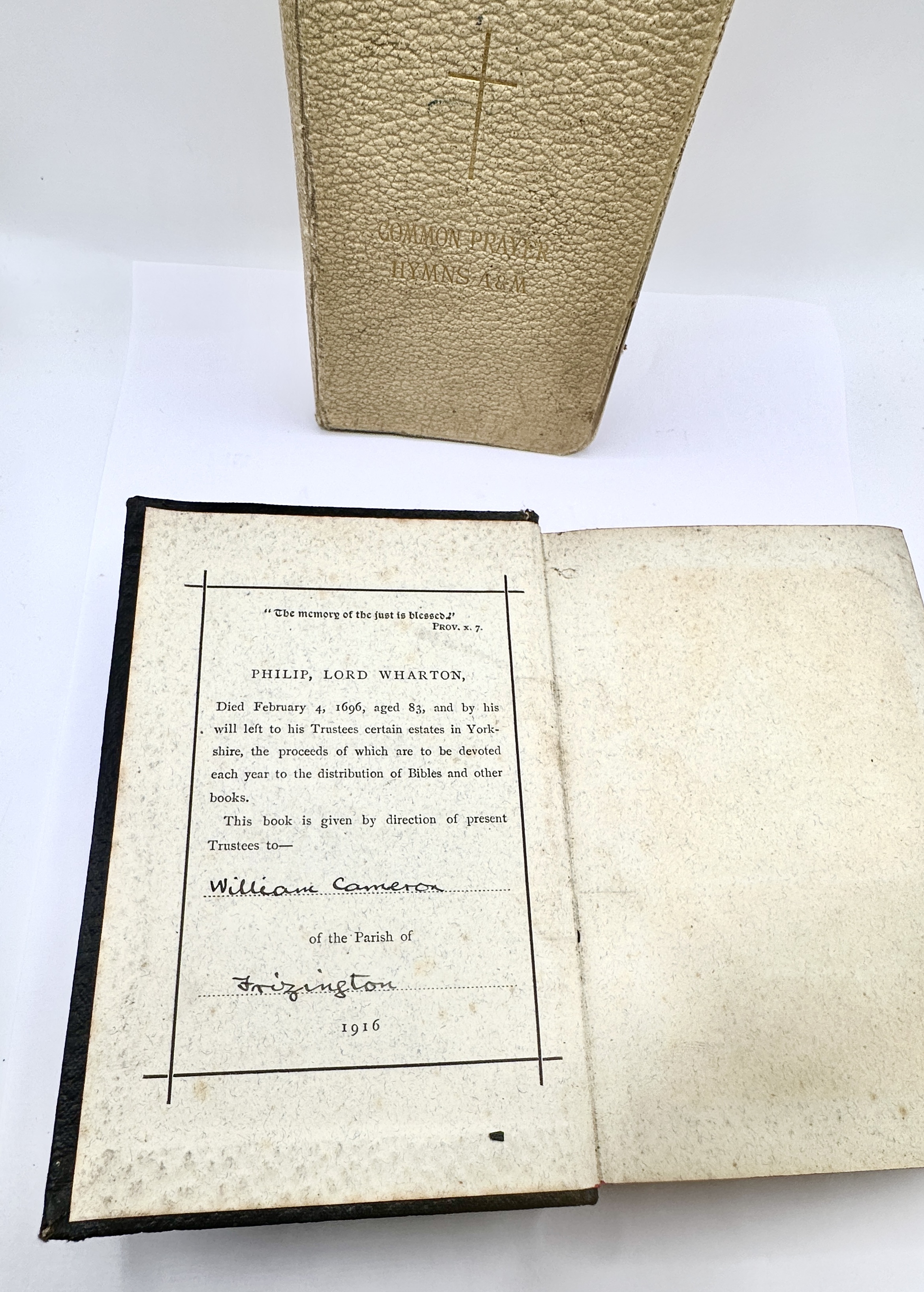 This lot consists of two early 20th-century religious volumes. The first is an Oxford edition of the Book of Common Prayer bound in black textured leather. The front cover is gold-stamped with the inscription: By the will of Philip, Lord Wharton, 1696. Presented 1916. The interior contains a formal presentation page dedicated to William Cameron of the Parish of Frizington, dated 1916. The second volume is titled Common Prayer Hymns A&M and is bound in a cream pebble-grain material with a gilt cross on the front cover. The flyleaf bears a handwritten personal inscription: To my dear Mother from her Son Willie 19th July 1930 from London. Both volumes feature gilt titles to the spines.