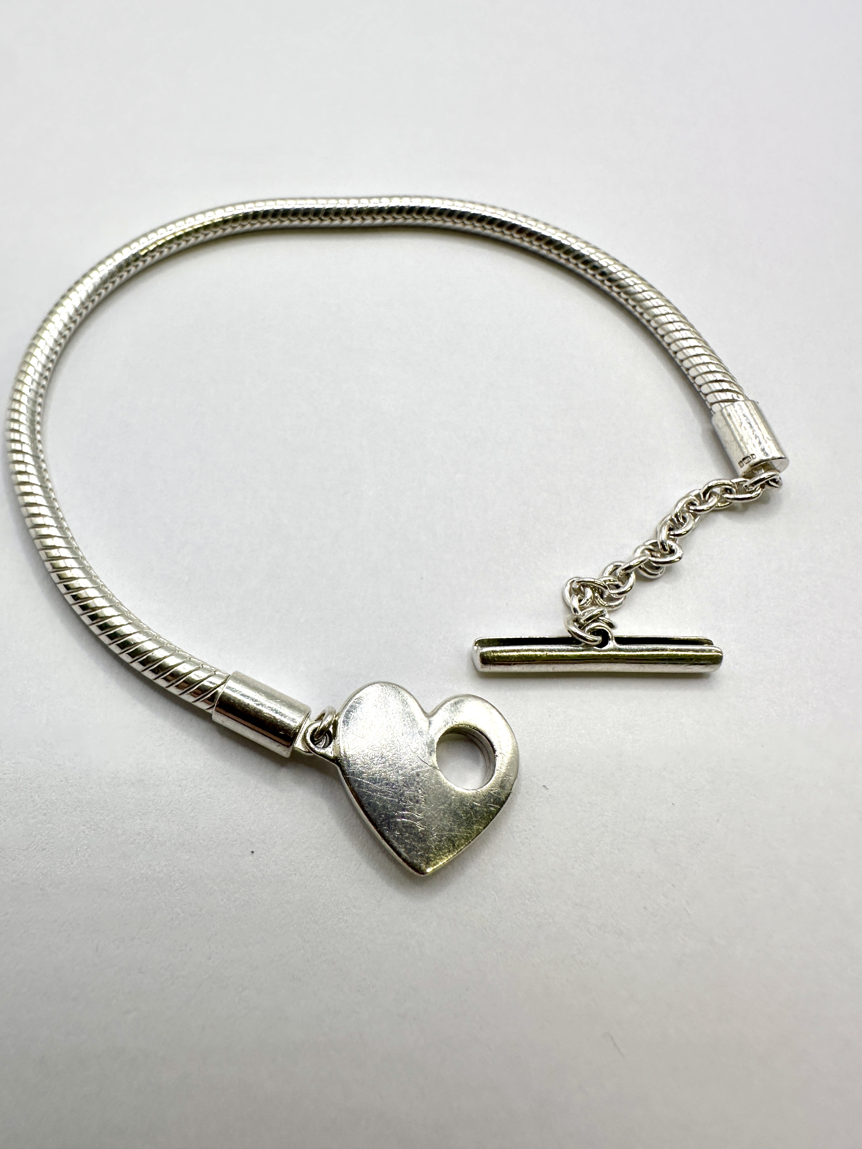 The bracelet is in good condition with minor surface scratches and light tarnishing consistent with moderate use.