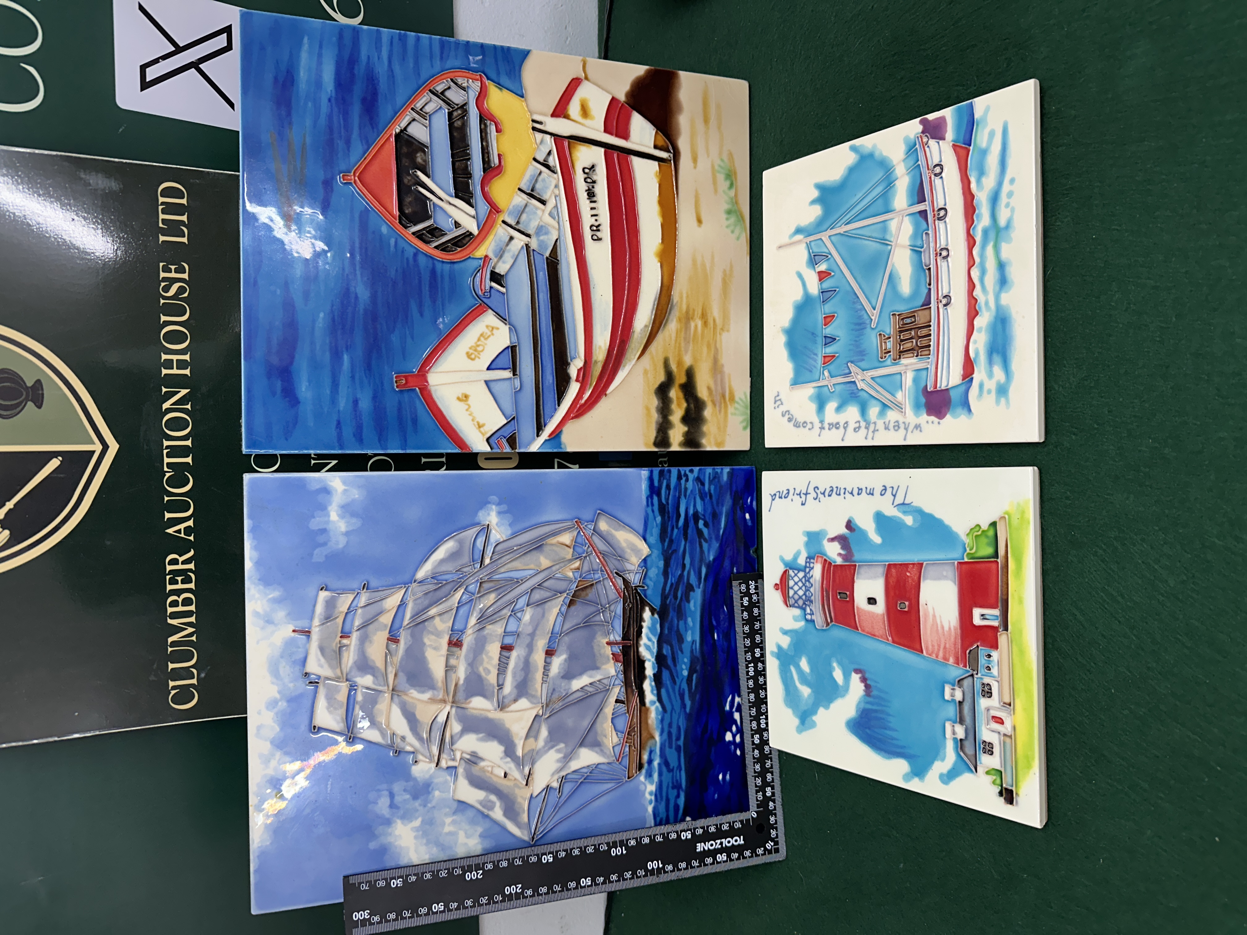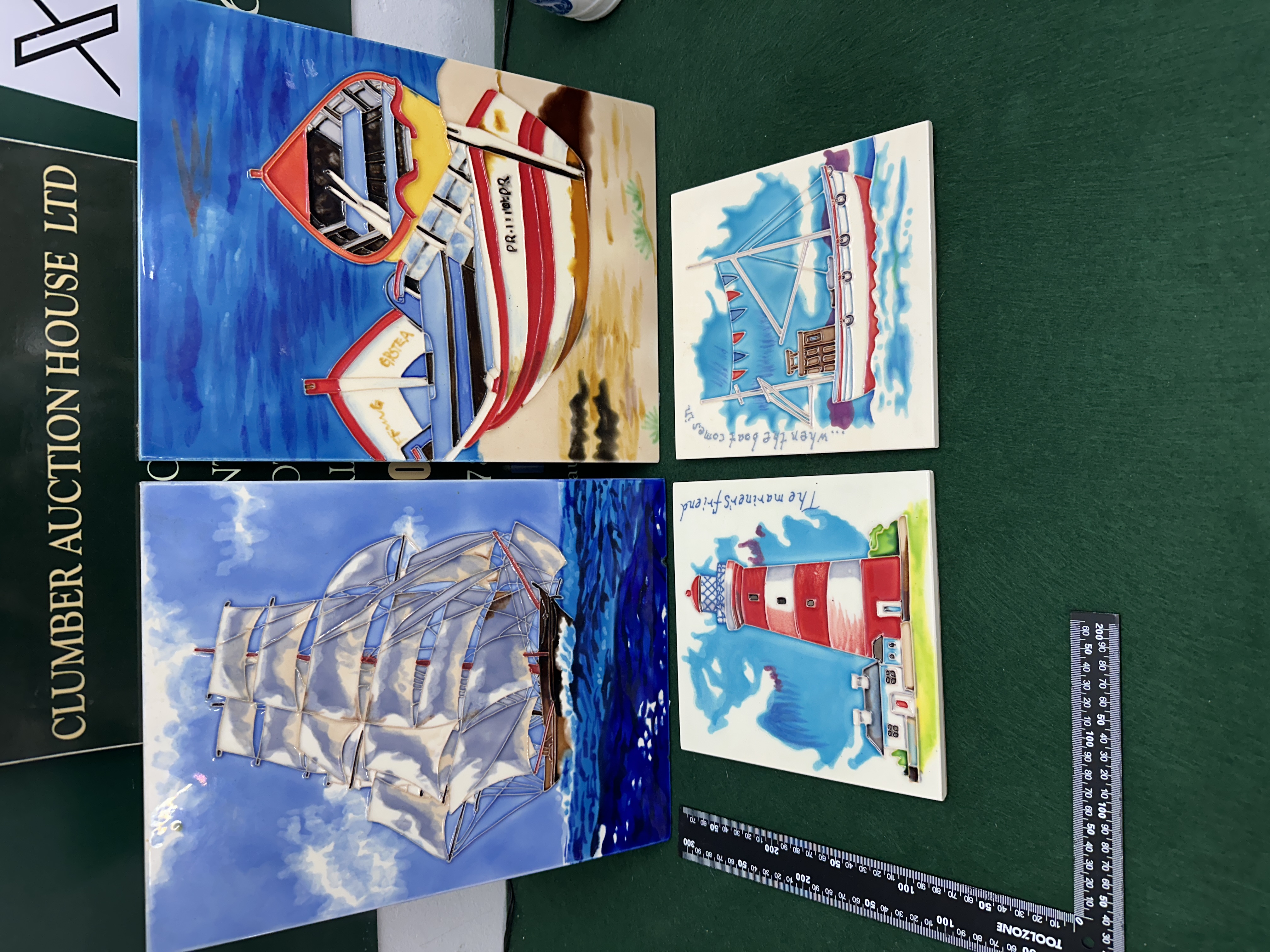 A set of four modern glazed ceramic wall plaques produced by Elgate Products Ltd. The collection comprises two large rectangular plaques and two smaller square plaques, each featuring tube-lined decoration where the outlines of the designs are raised above the surface and filled with multi-coloured glazes. The nautical subjects include a tall ship under full sail, two beached fishing boats (one with registration PR-1111-DR and the other named SPRING and ERSTEA), a lighthouse with the inscription The mariner’s friend, and a fishing boat at sea with the inscription …when the boat comes in. The plaques are mounted on protective backings, including black velvet-style felt and brown cork-effect material, each fitted with an integrated metal hanger. The reverse of each plaque bears a white paper label identifying the distributor as Elgate, based at 1 Pelican Way, Birchington, Kent, with batch numbers 8558, 8552, 7878, and 7870.