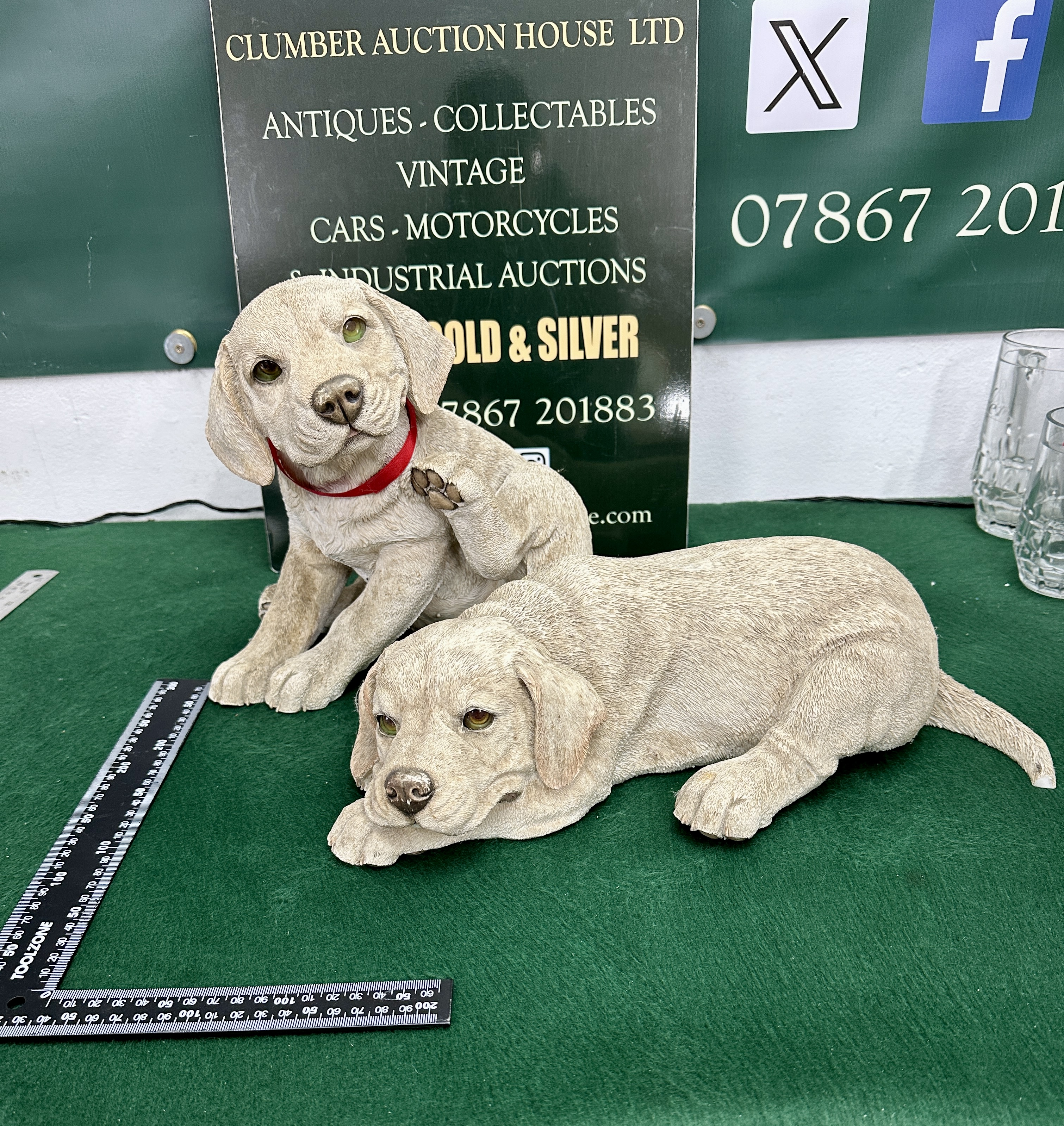 A pair of naturalist figurines depicting yellow Labrador Retriever puppies. The first figure is shown in a sitting position, scratching behind its ear with a hind leg and wearing a fixed red collar. The second figure is depicted in a recumbent pose with its head resting on its paws. Both items are constructed from a cast resin or composite material with a heavily textured surface designed to simulate fur. The eyes are inset with a glossy finish, while the noses and paw pads feature hand-painted details. The poses and finish are characteristic of sculptures produced by Sandicast, although no maker’s marks are visible on the exterior surfaces.