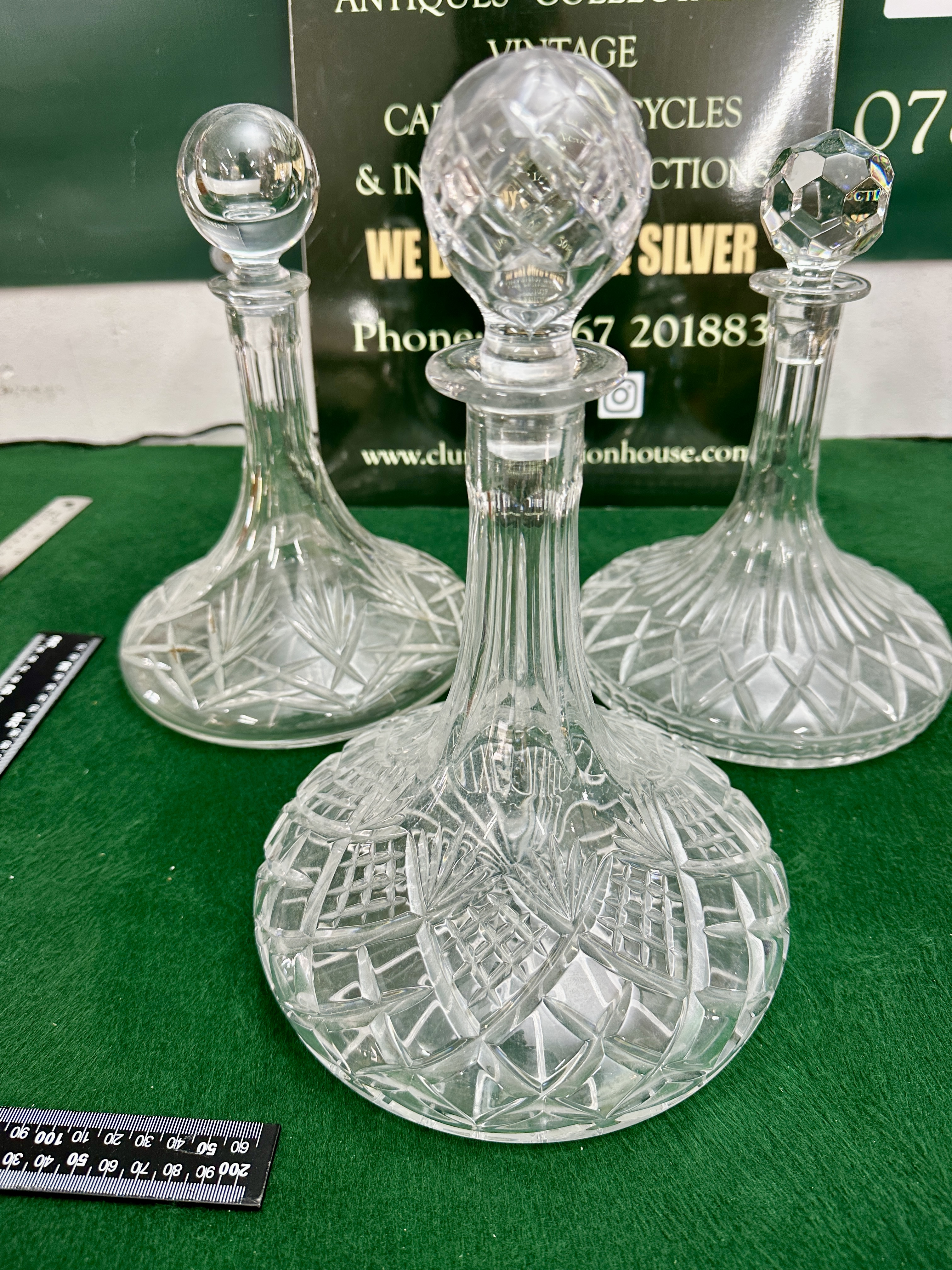 The collection is in generally good condition with high clarity throughout. The foreground decanter is in excellent condition with no chips or cloudiness observed. The back-left decanter shows minor residue or light staining within the deeper recesses of the cut glass near the base. The back-right decanter appears in good condition with no visible chips or significant wear.