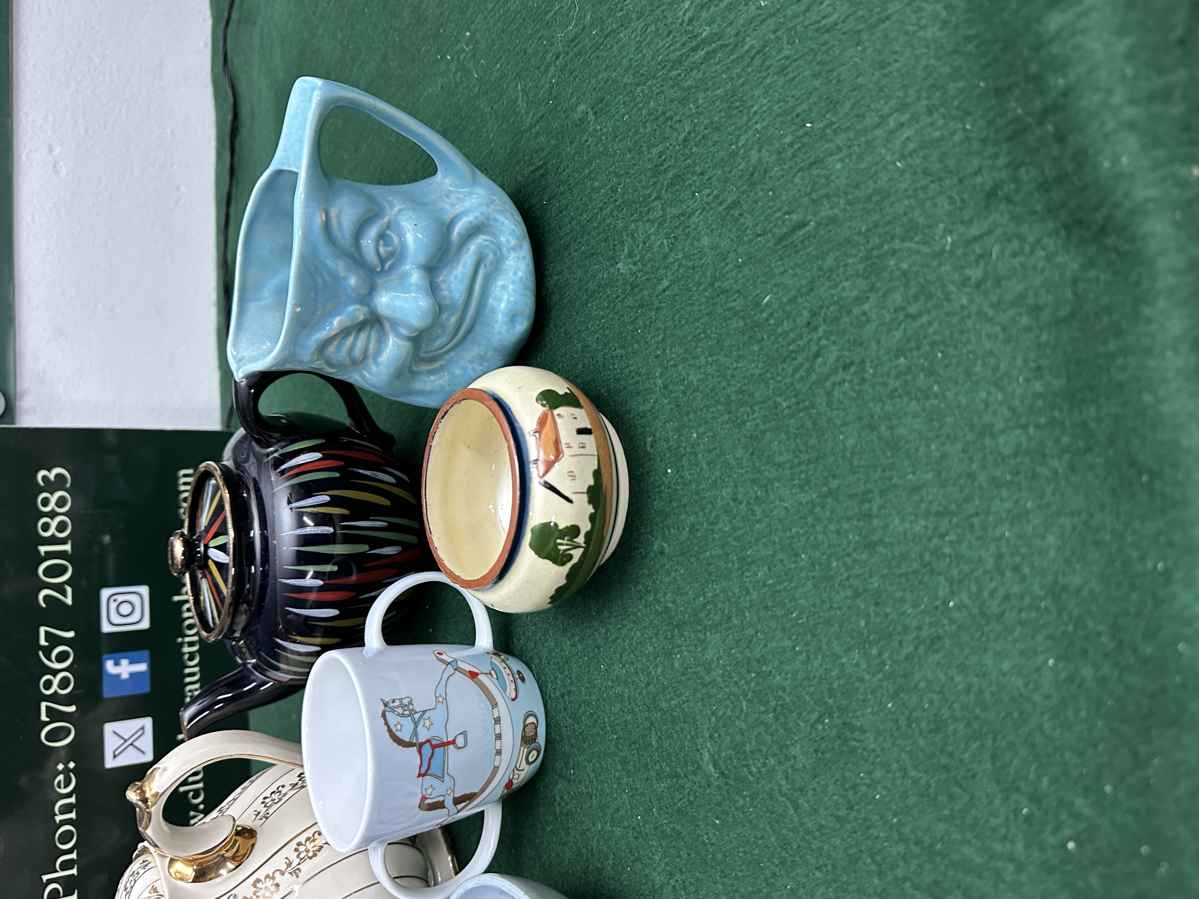 A collection of ceramic items comprising teapots, mugs, and bowls in various styles and materials. The group includes a large porcelain teapot of ribbed, globular form with a cream-coloured ground, decorated with vertical gilt bands and transfer-printed floral sprigs. The handle, spout, and finial are accented with gilding. Also included is a small earthenware teapot in the Art Deco style, featuring a black glaze with multi-coloured vertical dash motifs in red, green, yellow, and blue. A turquoise-glazed earthenware character mug is sculpted in the form of a grotesque face with prominent features. A small earthenware bowl features a hand-painted naïve landscape scene depicting a cottage and trees, in the style of South Devon potteries. The collection further contains a porcelain two-handled child’s mug decorated with a transfer-printed rocking horse and toy motifs, a small porcelain mug with butterfly motifs, and a shallow earthenware bowl with hand-painted stylised blue bird motifs. No factory marks are visible on the items.