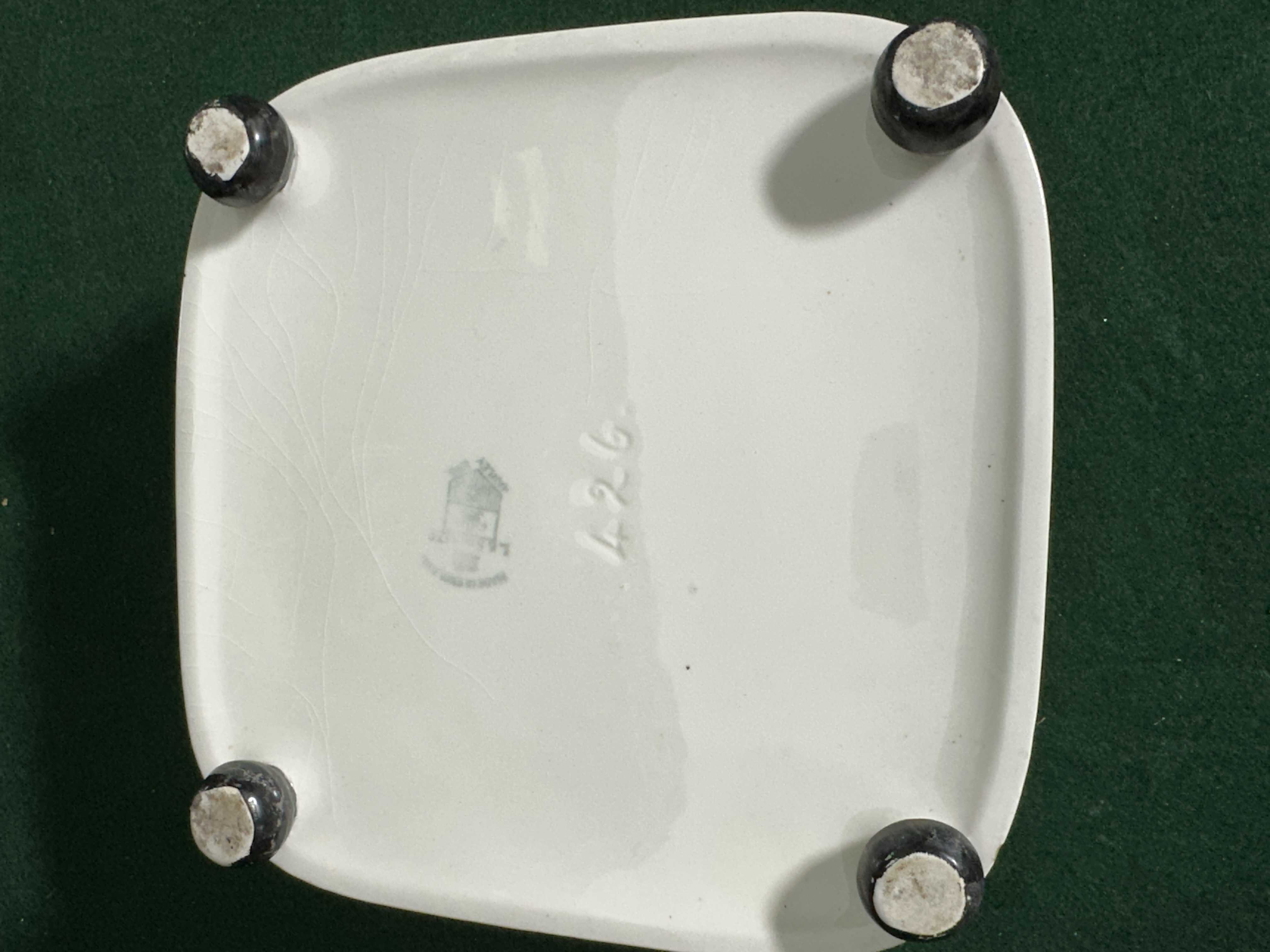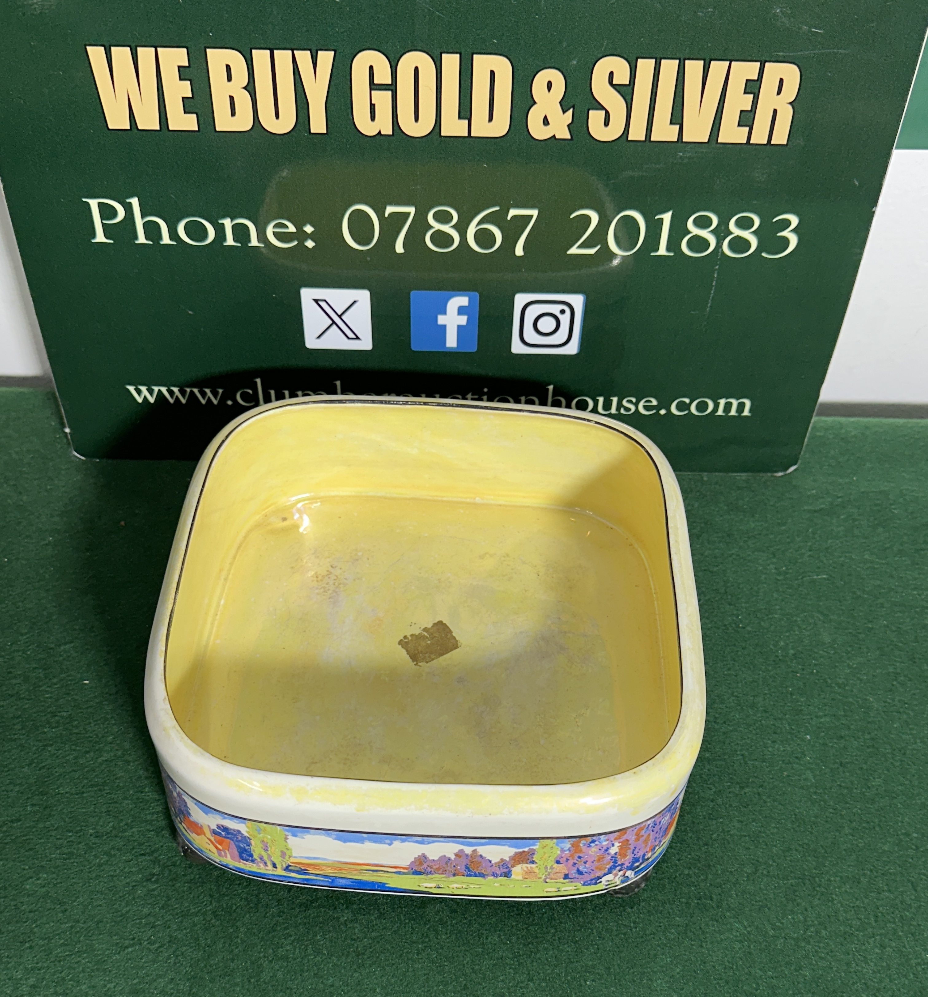 A square-form bowl manufactured by Lancaster and Sons, Hanley, Stoke-on-Trent, dating to the Art Deco period, circa 1930s. The bowl is of squat form with rounded corners and is supported by four small black-glazed bun feet. The exterior features a continuous transfer-printed rural landscape decoration, hand-coloured with shades of blue, green, orange, and purple, depicting cottages, trees, and sheep in a field. The interior is finished with a bright yellow lustre glaze. The rim and lower body are accented with thin black-painted horizontal bands. The base bears a black printed factory mark for Lancaster and Sons, featuring a pottery building silhouette with the word HANLEY above and MADE IN ENGLAND below. The base also features the hand-painted number 426.